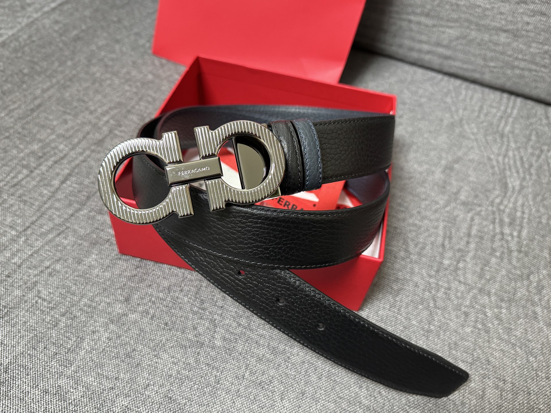 Ferragamo men's leather belt in black/black-brown, double-sided, classic timeless boutique-style double-layer buckle belt 3.5cm, exquisite workmanship, perfect presentation