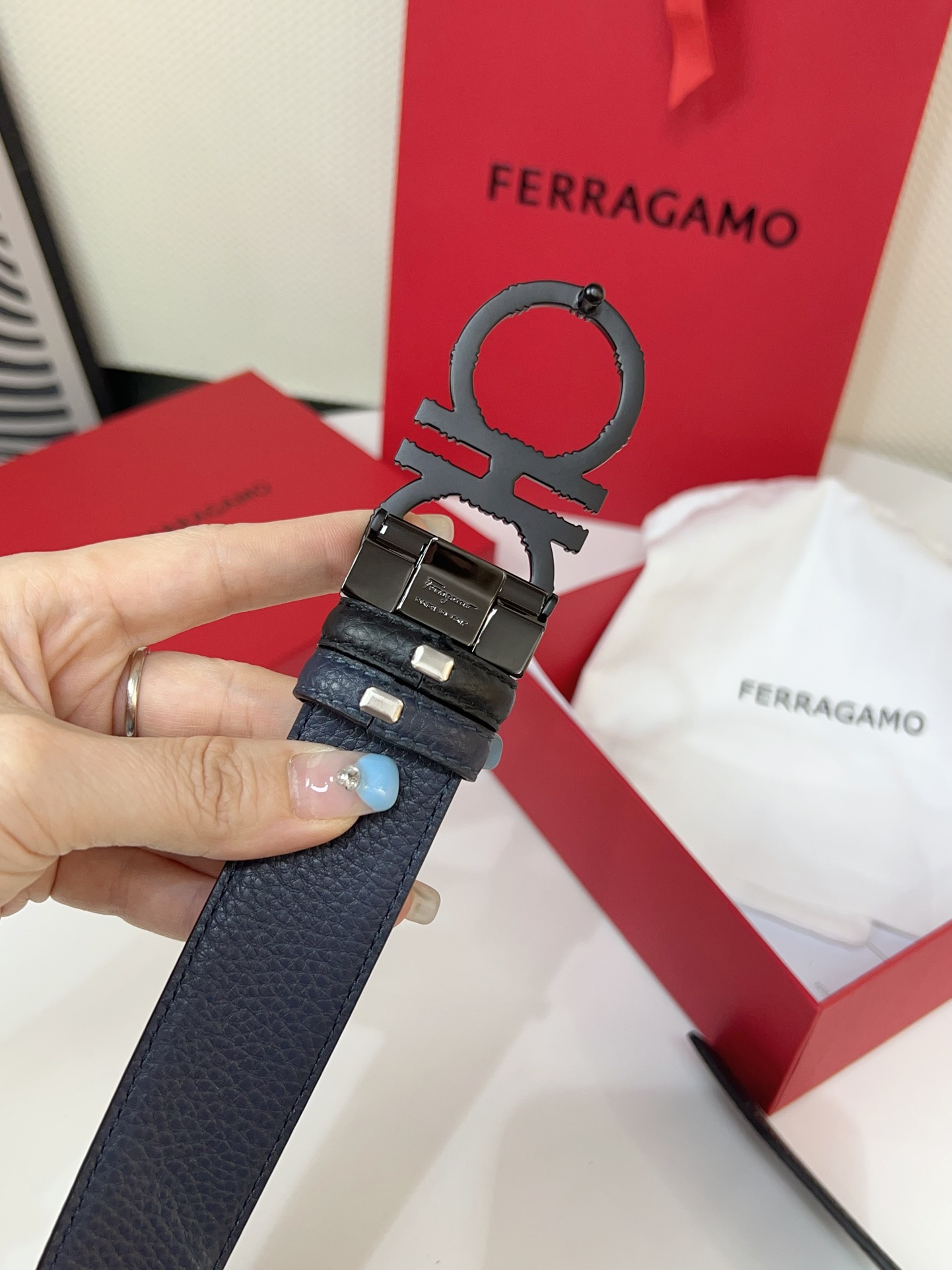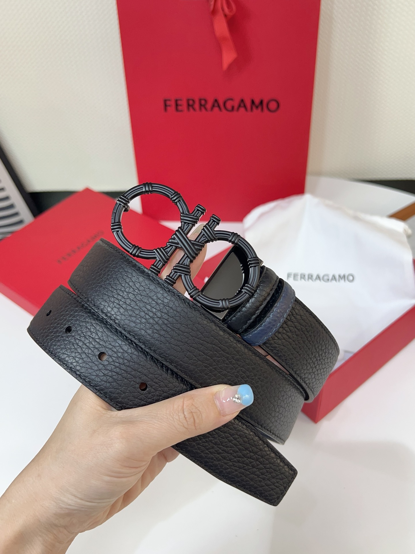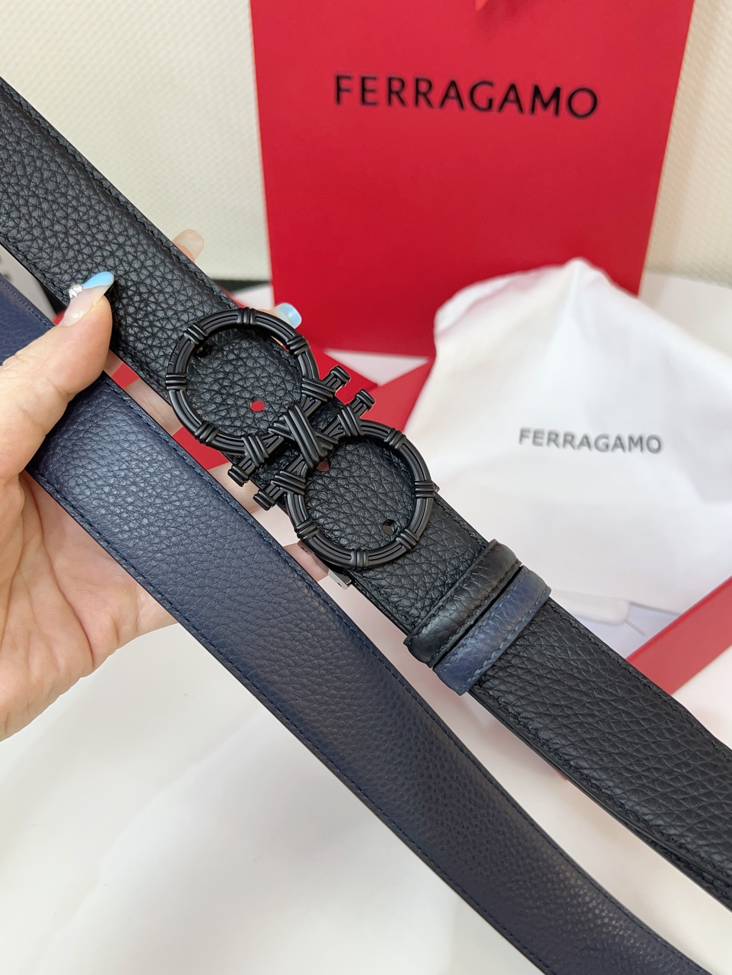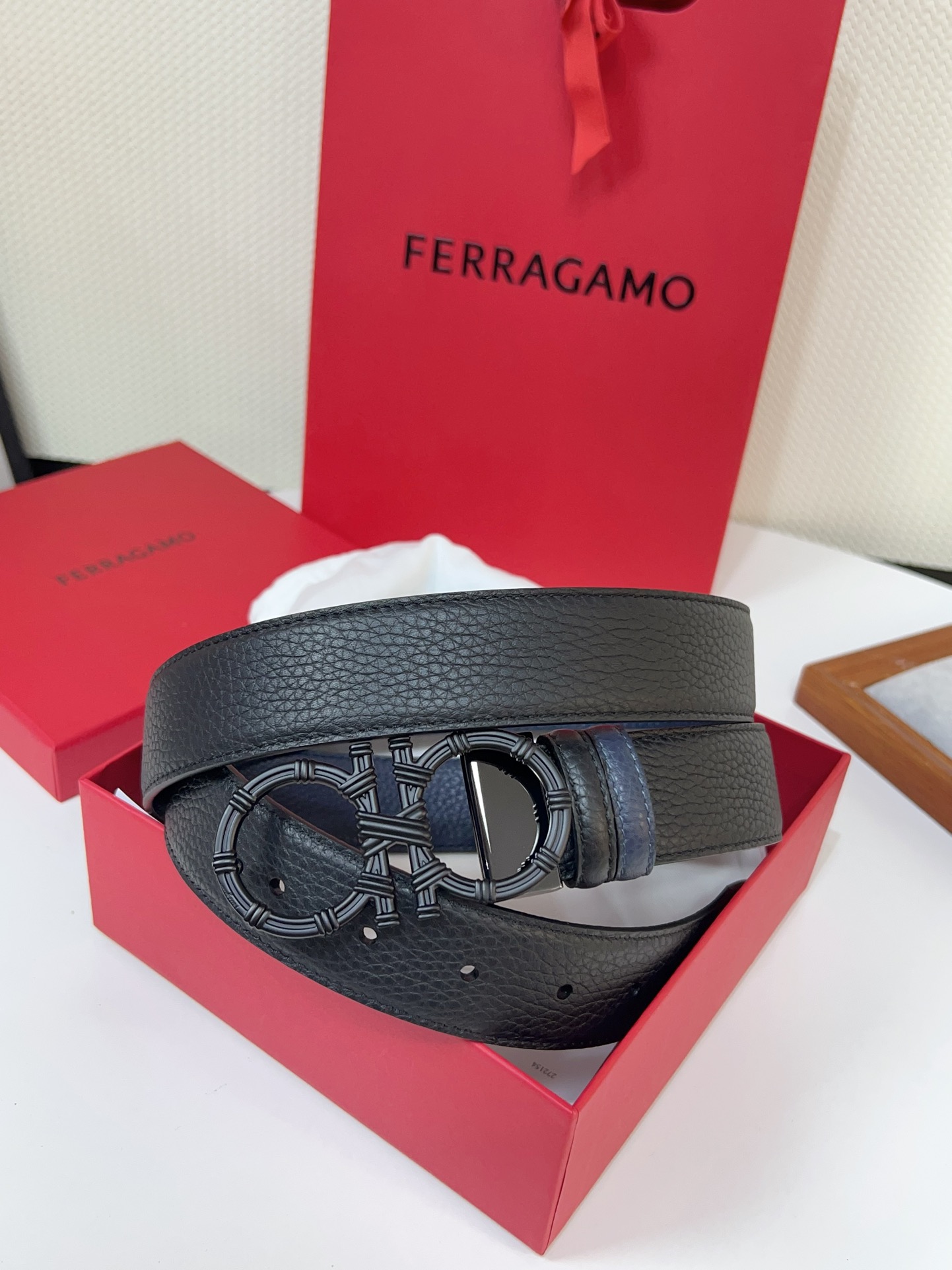 This double-sided belt is stylish and versatile, an indispensable men's accessory item. One side is made of hammered cowhide, while the other side is made of selected natural grained cowhide, adorned with a gold-finished Gancini buckle for an eye-catching touch. The inside features exquisite satin decorative details. The length is adjustable. The belt can be trimmed or additional eyelets can be added to create a tight or loose fit.