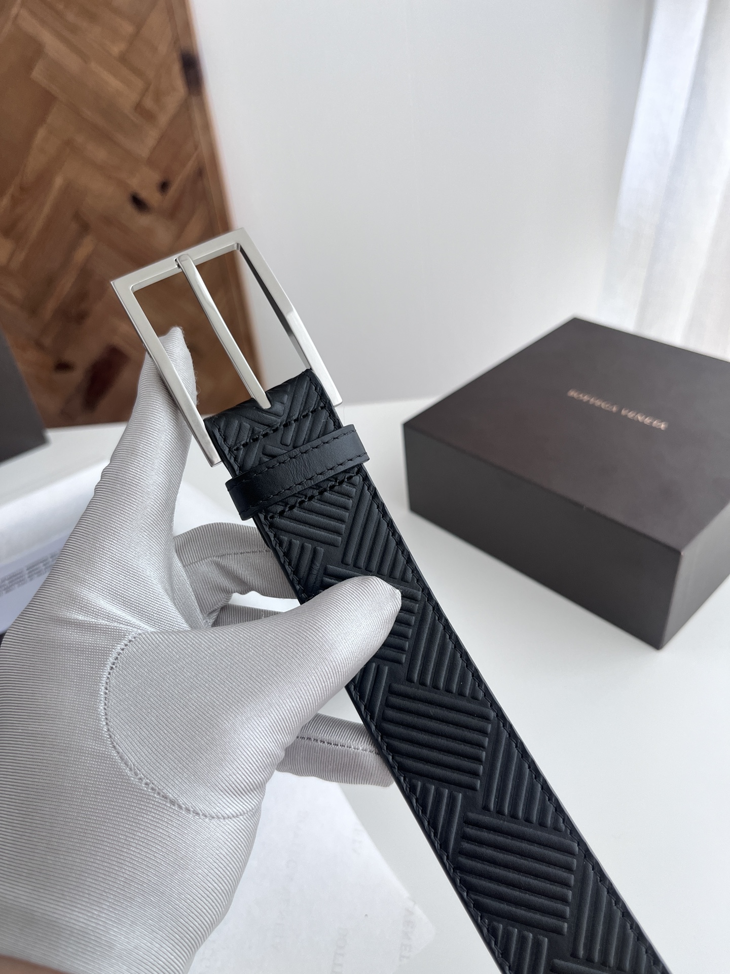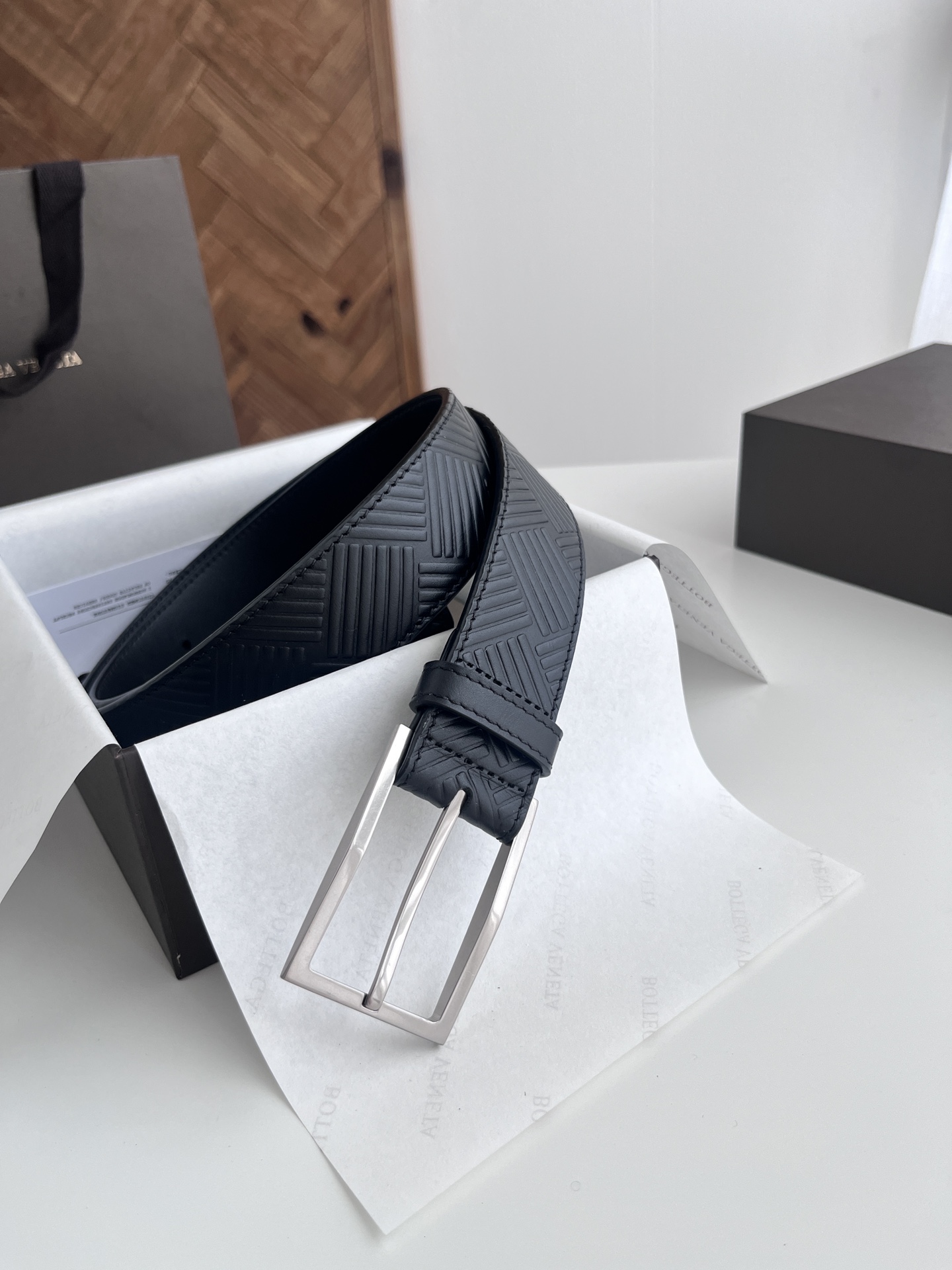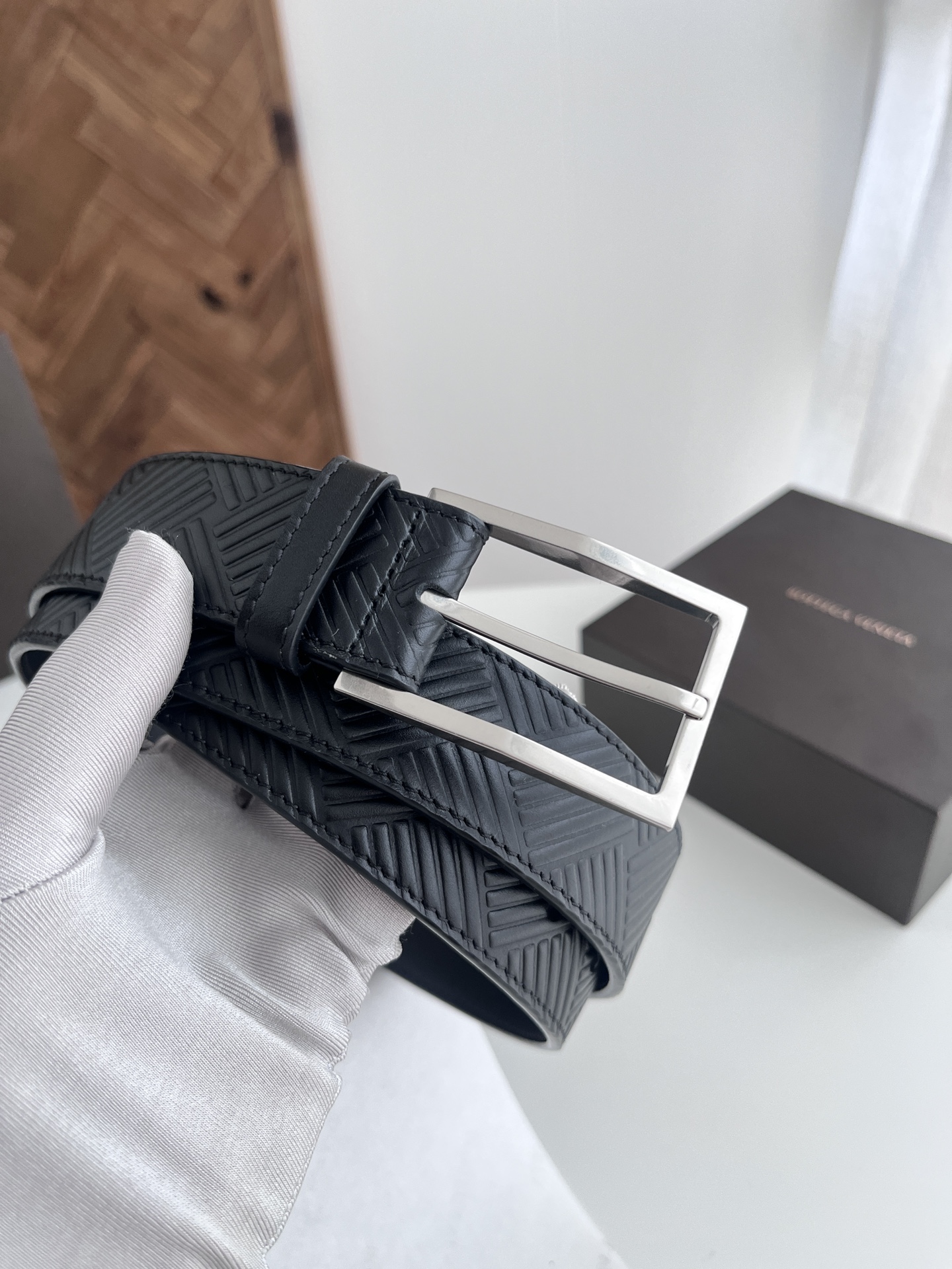BV 2024 New Men's Belt, Large Checkerboard Weaving and Embossing Craft, Double-sided Italian Calfskin, Paired with Slightly Retro Silver Trapezoid Buckle, Logo on the Side, Width 3.5CM, Color: Black