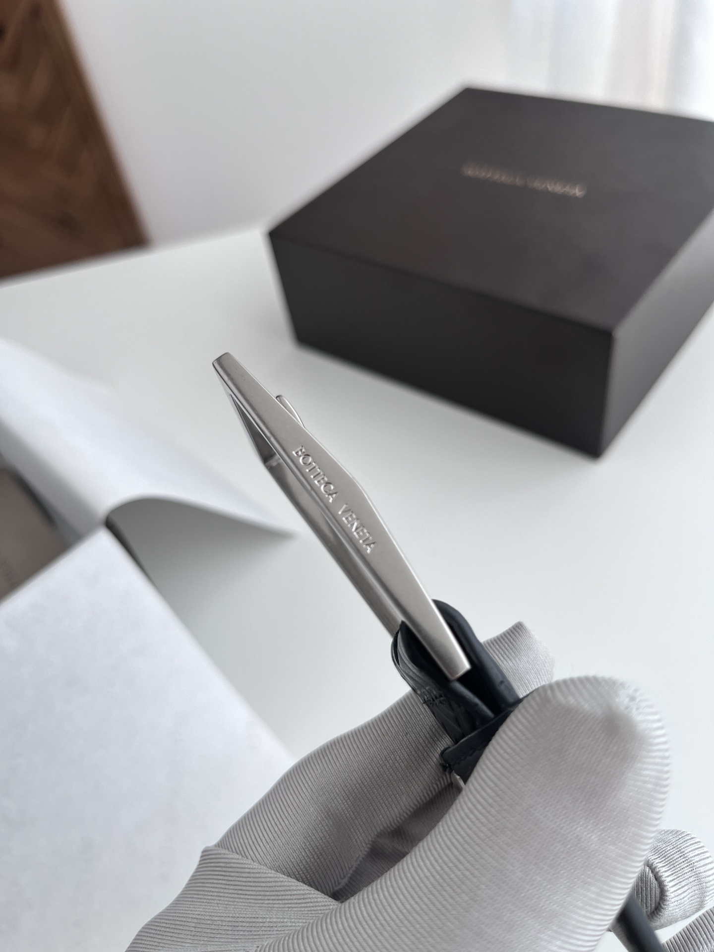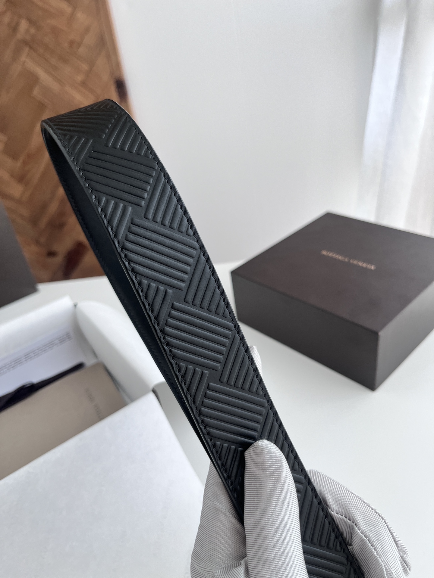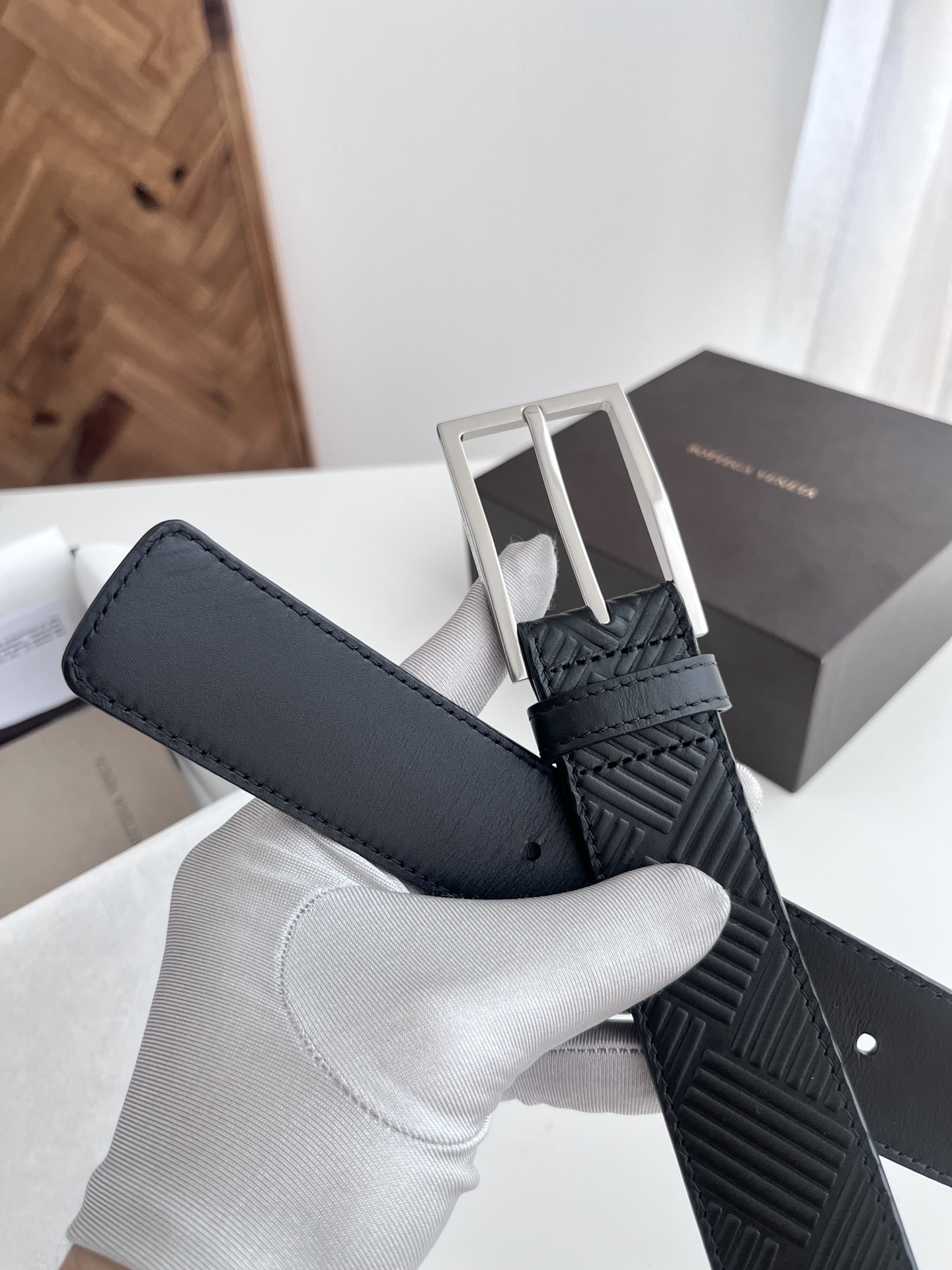 BV 2024 New Men's Belt, Large Checkerboard Weaving and Embossing Craft, Double-sided Italian Calfskin, Paired with Slightly Retro Silver Trapezoid Buckle, Logo on the Side, Width 3.5CM, Color: Black