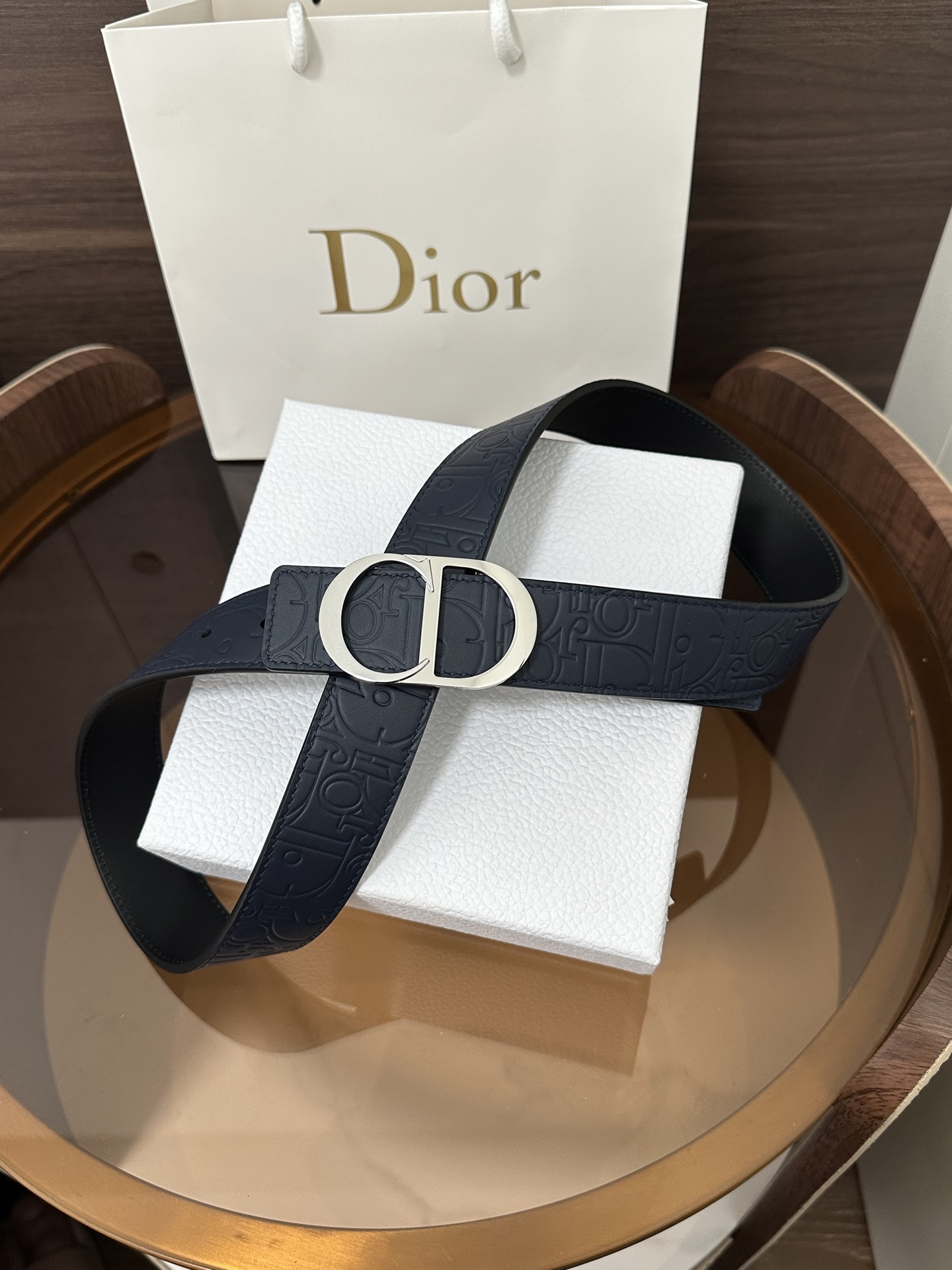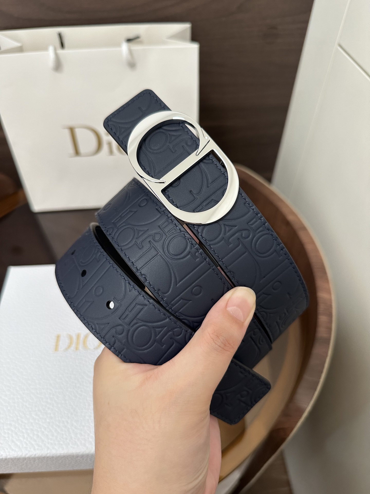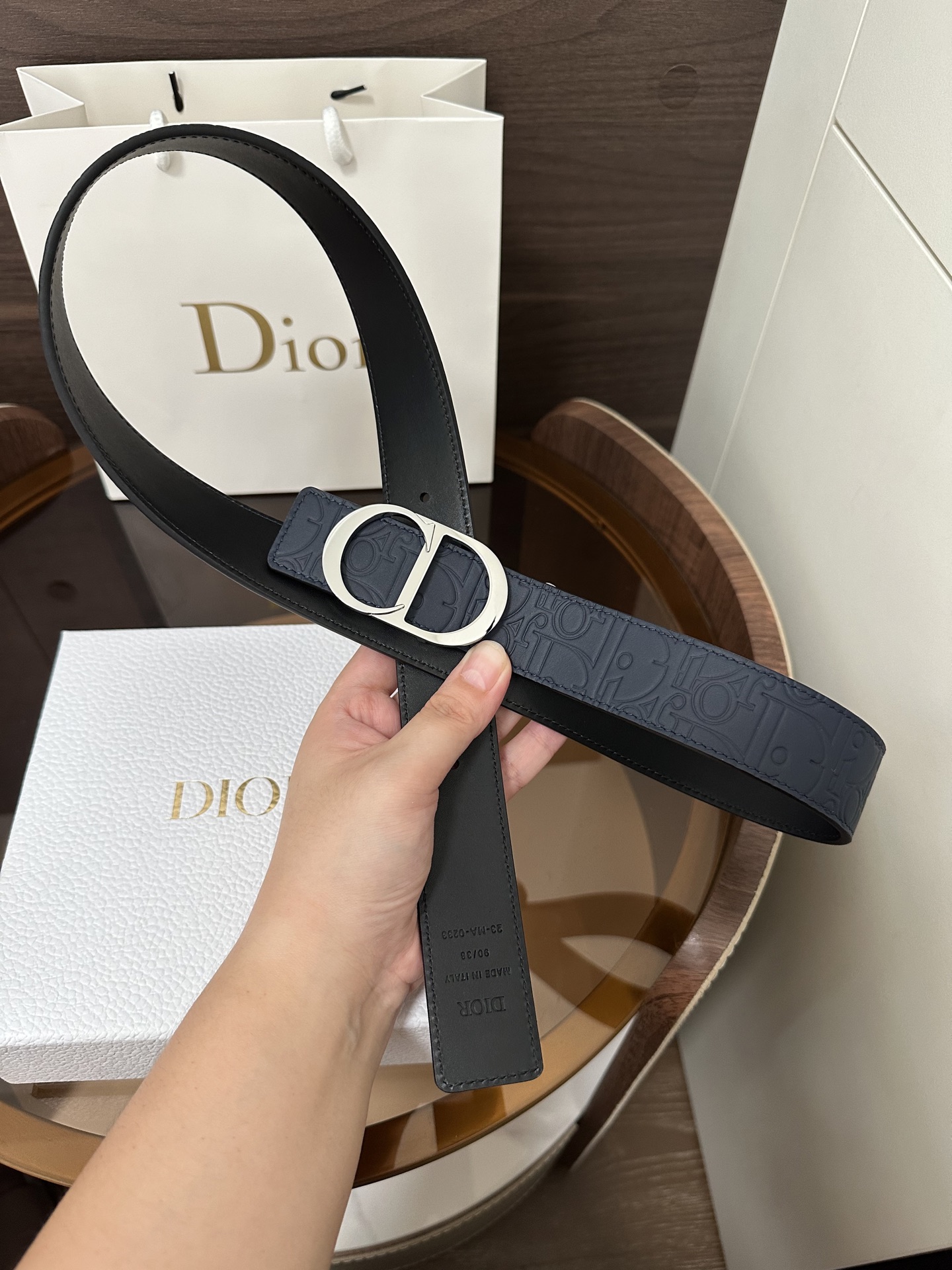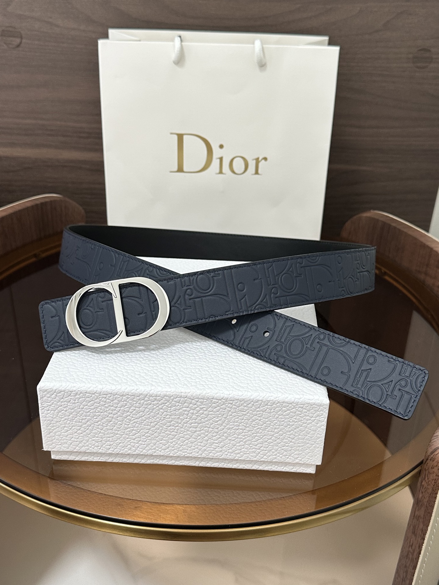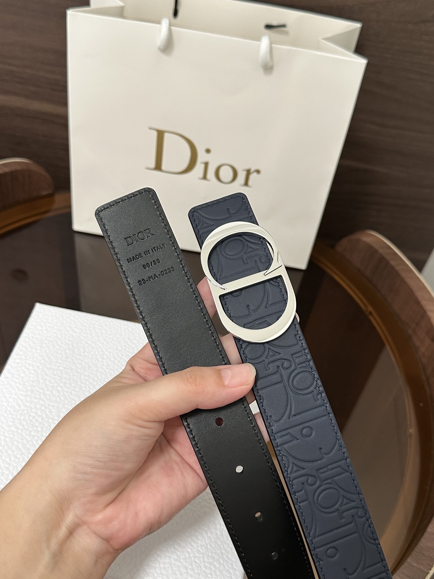 DI0R New Double-sided Belt This 35 mm double-sided belt combines elegant temperament with modern style. Both sides are meticulously crafted from calf leather. It can be paired with various 35 mm belt buckles to create distinctive, fashionable, and versatile pieces.