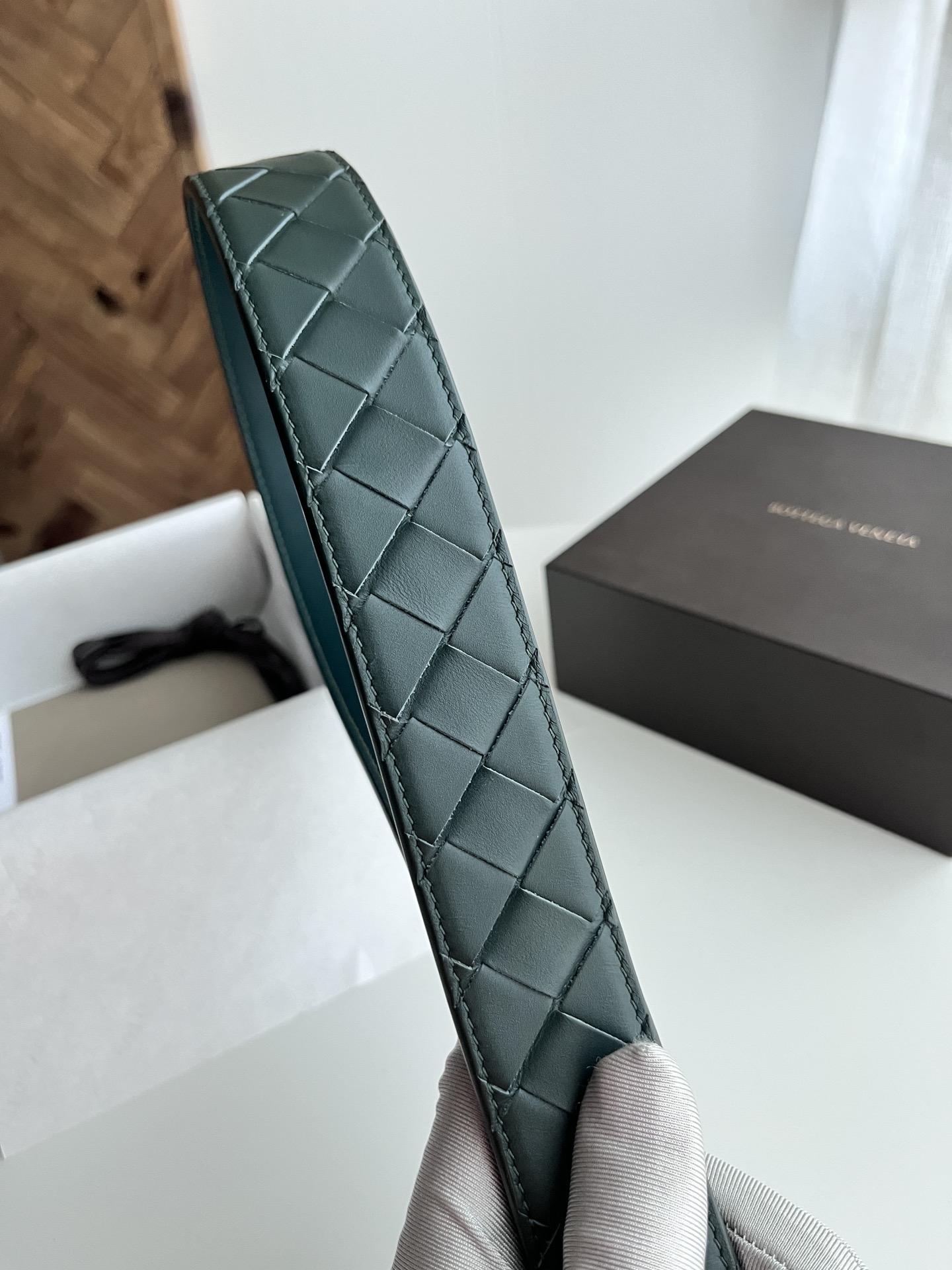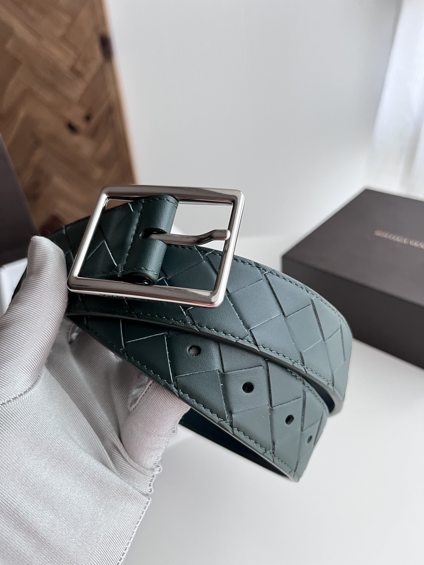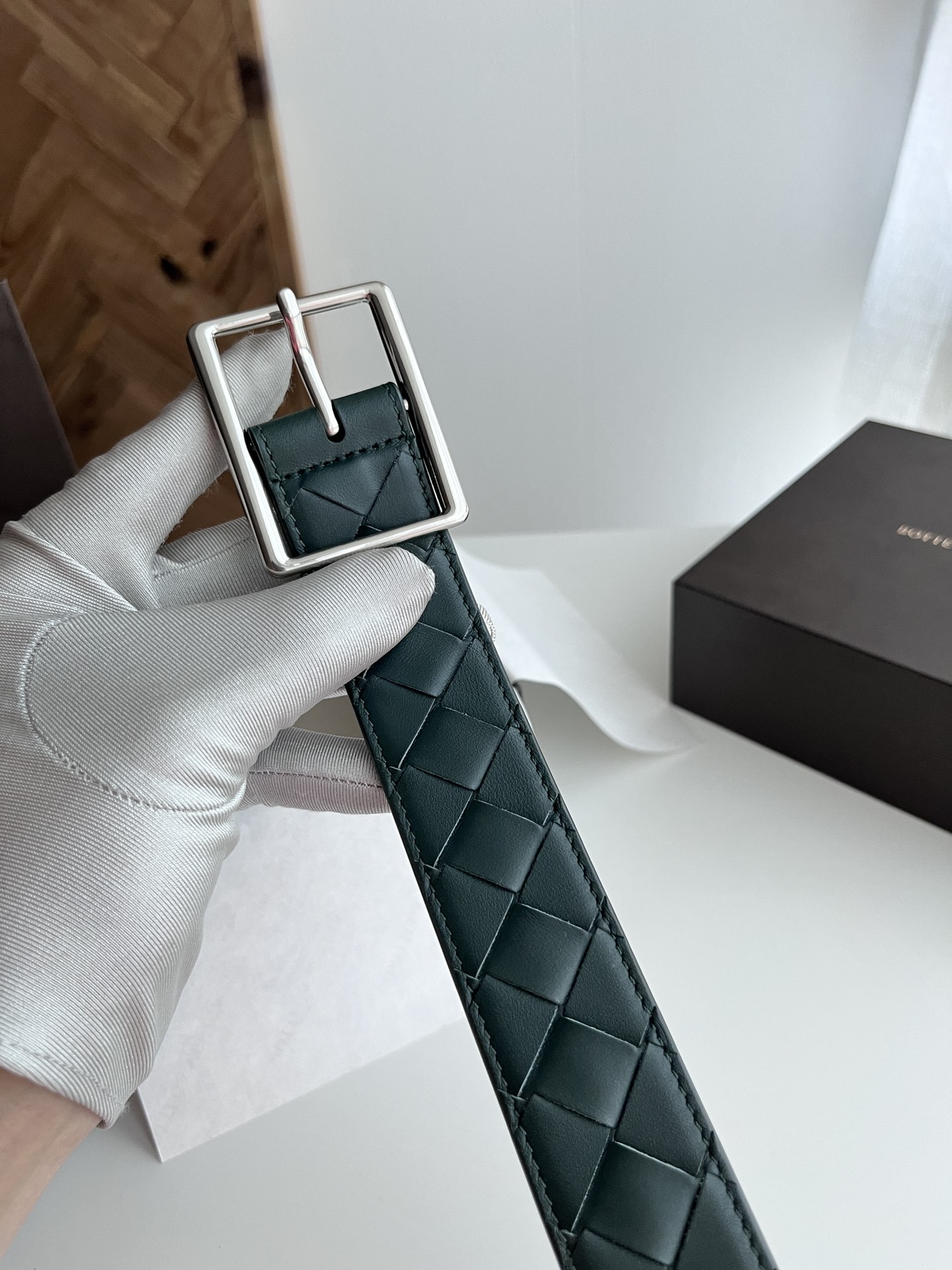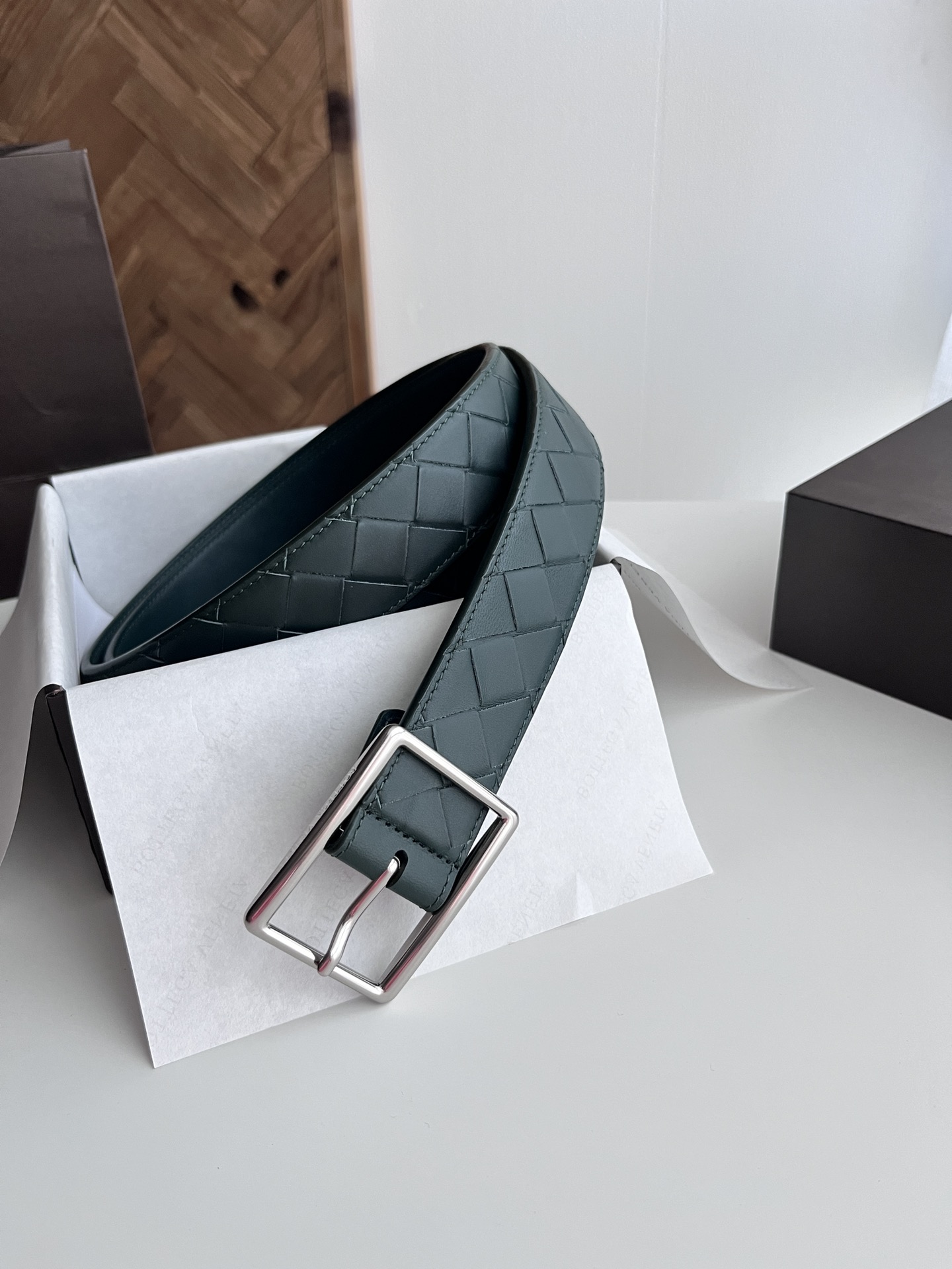 BV 2024 Men's Belt Fully Handcrafted Large Grid Intreccio Woven Italian Calfskin Paired with a Slightly Retro Silver Pin Buckle Side with Logo Belt Width 3.5cm Color: Cypress Green + Cypress Green
