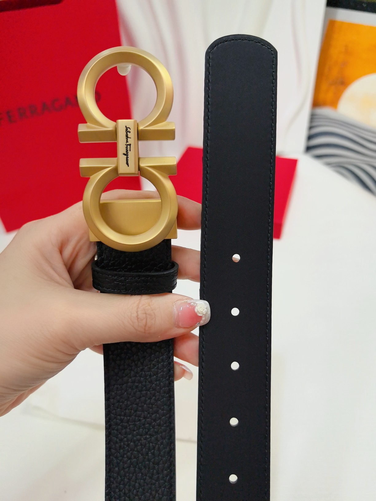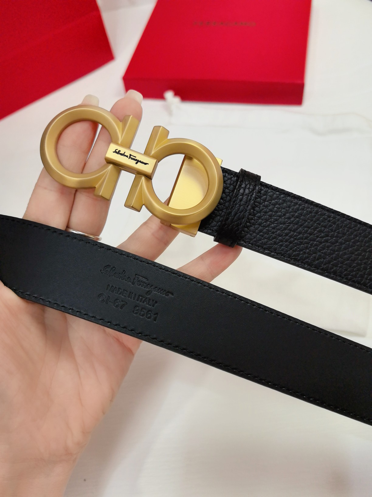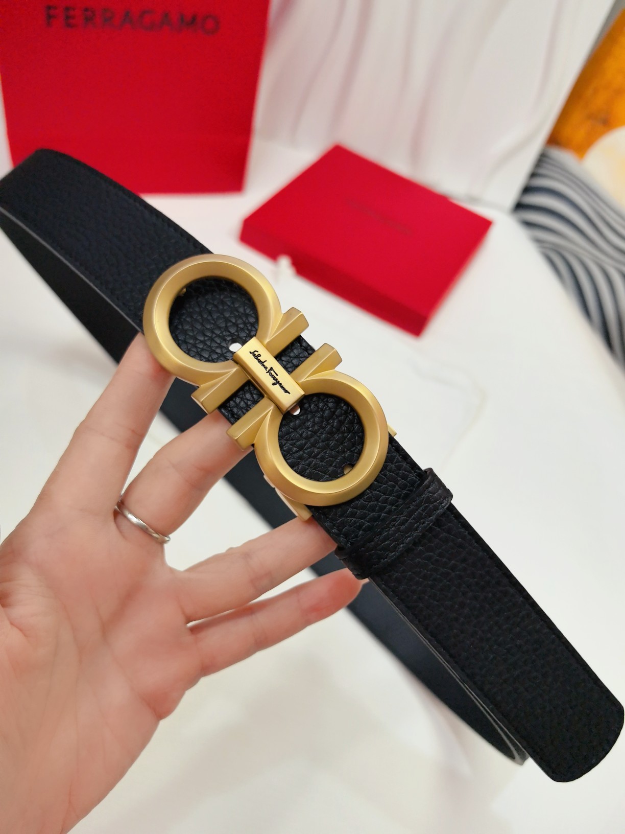 This double-sided belt features an elegant style with a dual-finish design, flexibly adapting to various looks while maintaining a sophisticated demeanor at all times, making it a staple accessory for the modern gentleman. The natural grained calfskin and hammered calfskin are spliced together, creating a bold and eye-catching edge effect. The Gancini buckle is paired with contrasting trim, and the connection point is adorned with a logo. The adjustable length allows for a tailored fit. The belt can be trimmed or additional eyelets can be added to achieve a tight or loose fit. 3.5 wide