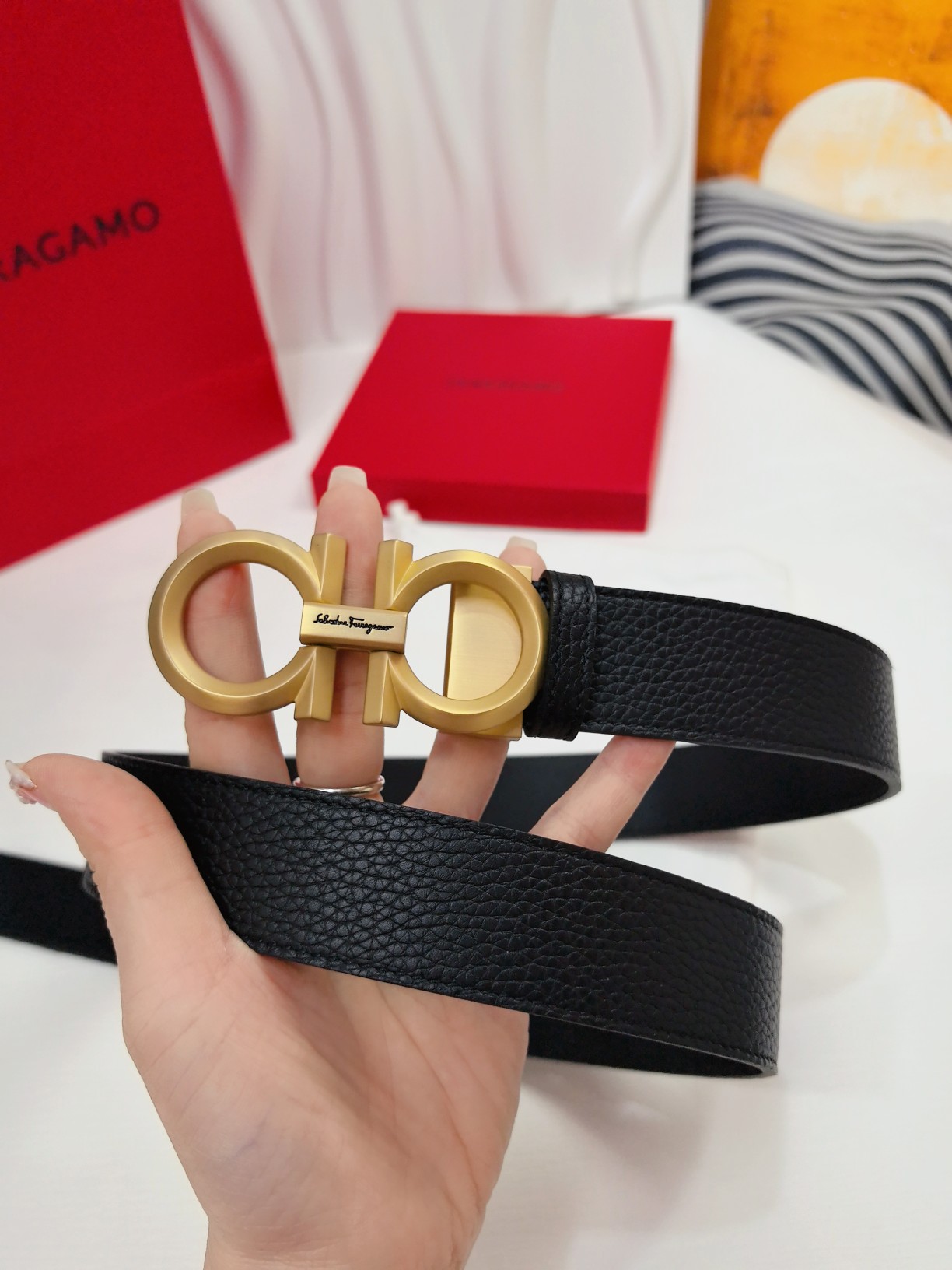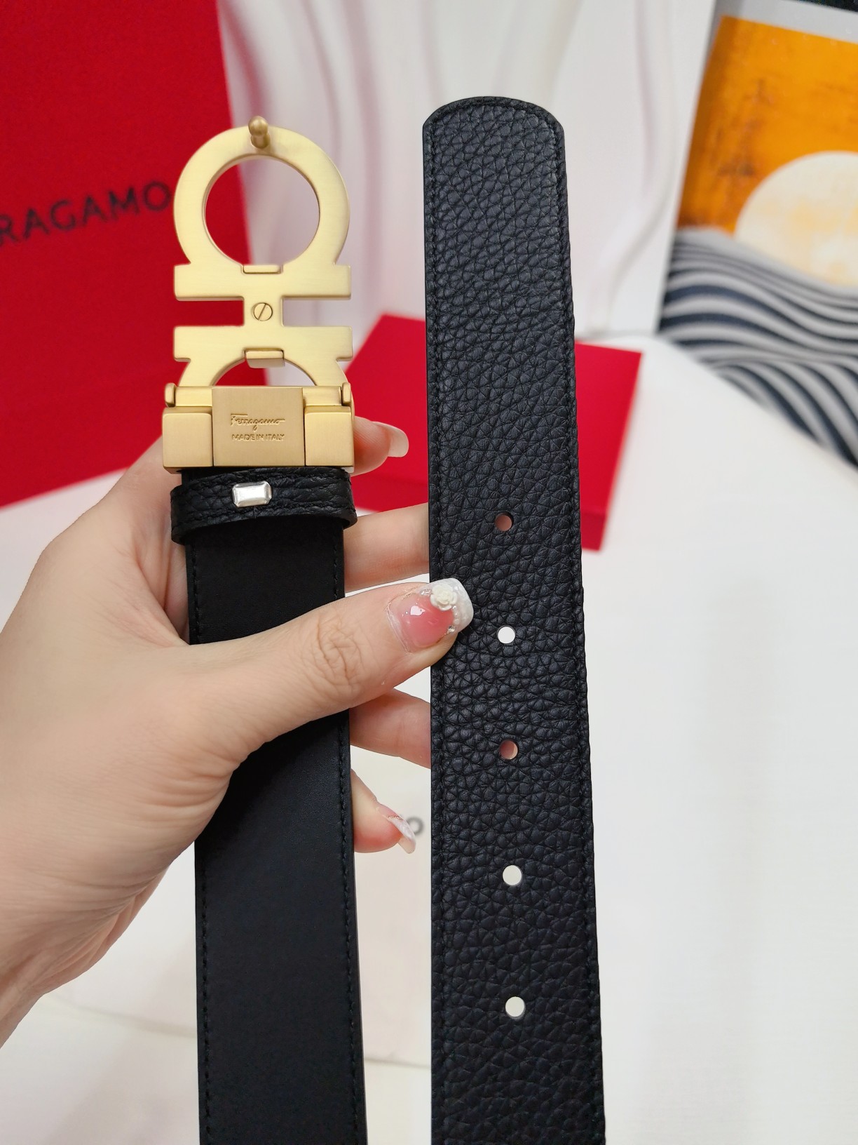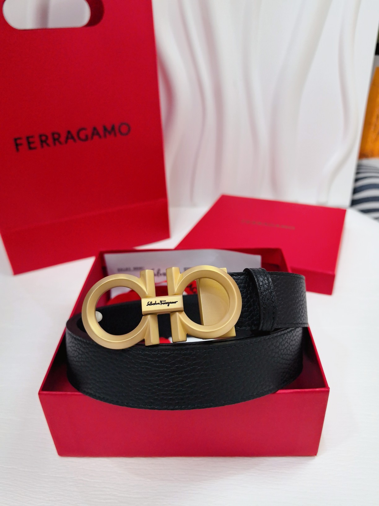 This double-sided belt features an elegant style with a dual-finish design, flexibly adapting to various looks while maintaining a sophisticated demeanor at all times, making it a staple accessory for the modern gentleman. The natural grained calfskin and hammered calfskin are spliced together, creating a bold and eye-catching edge effect. The Gancini buckle is paired with contrasting trim, and the connection point is adorned with a logo. The adjustable length allows for a tailored fit. The belt can be trimmed or additional eyelets can be added to achieve a tight or loose fit. 3.5 wide