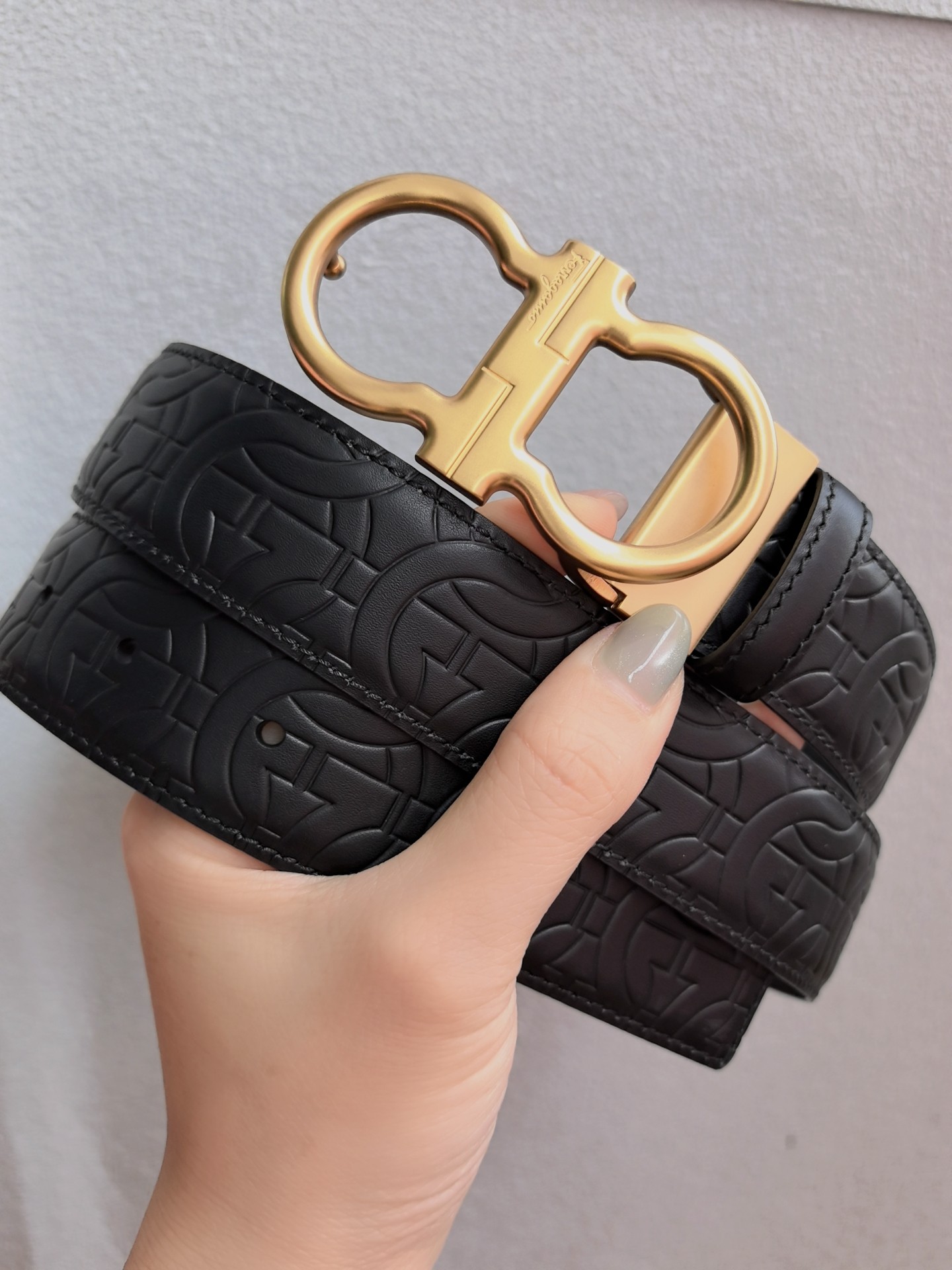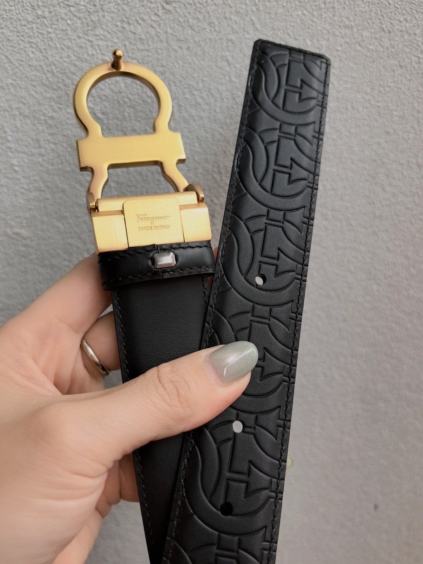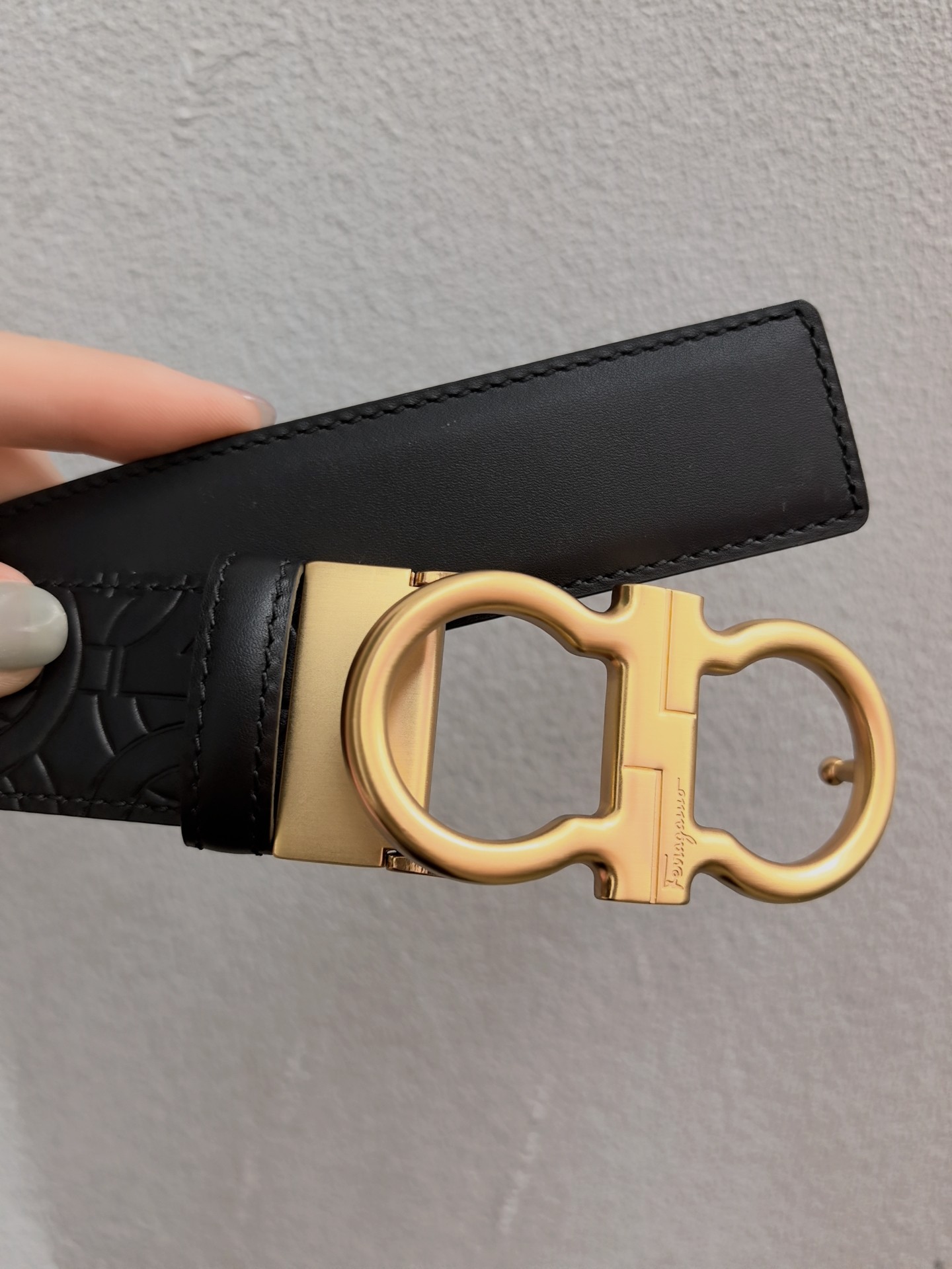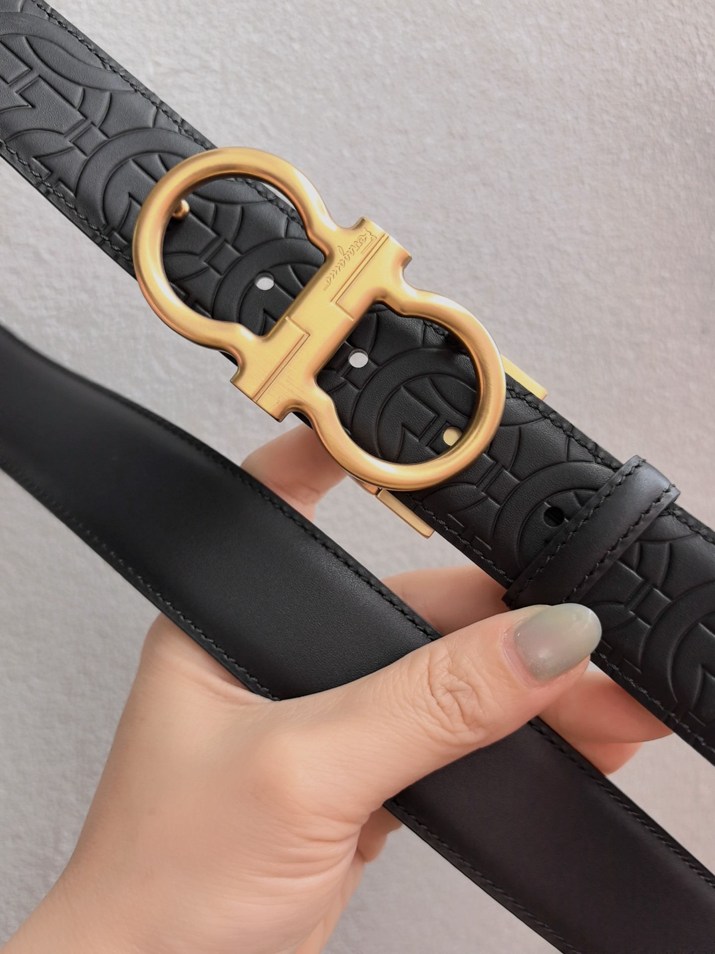 This belt features a double-sided design, with contrasting texture effects on both sides. One side is treated with wax immersion and natural tannin dyeing, resulting in a delicate and refined finish. The other side undergoes grinding and aniline dyeing, creating a luxurious and captivating texture. The painted buckle complements the Gancio silhouette, accentuated by a central rectangular cut-out pattern. The length is adjustable, allowing the belt to be trimmed to size or additional eyelets to be added. 3.5 wide