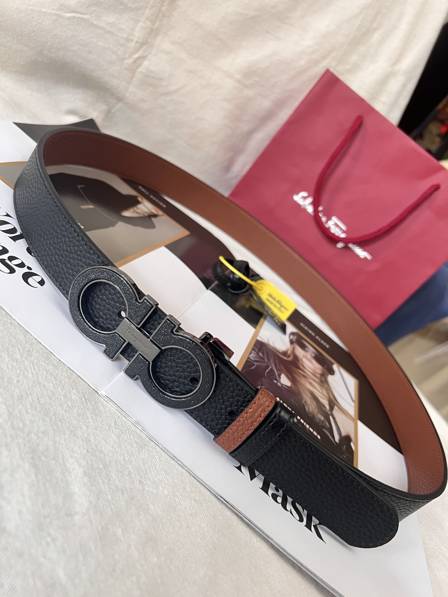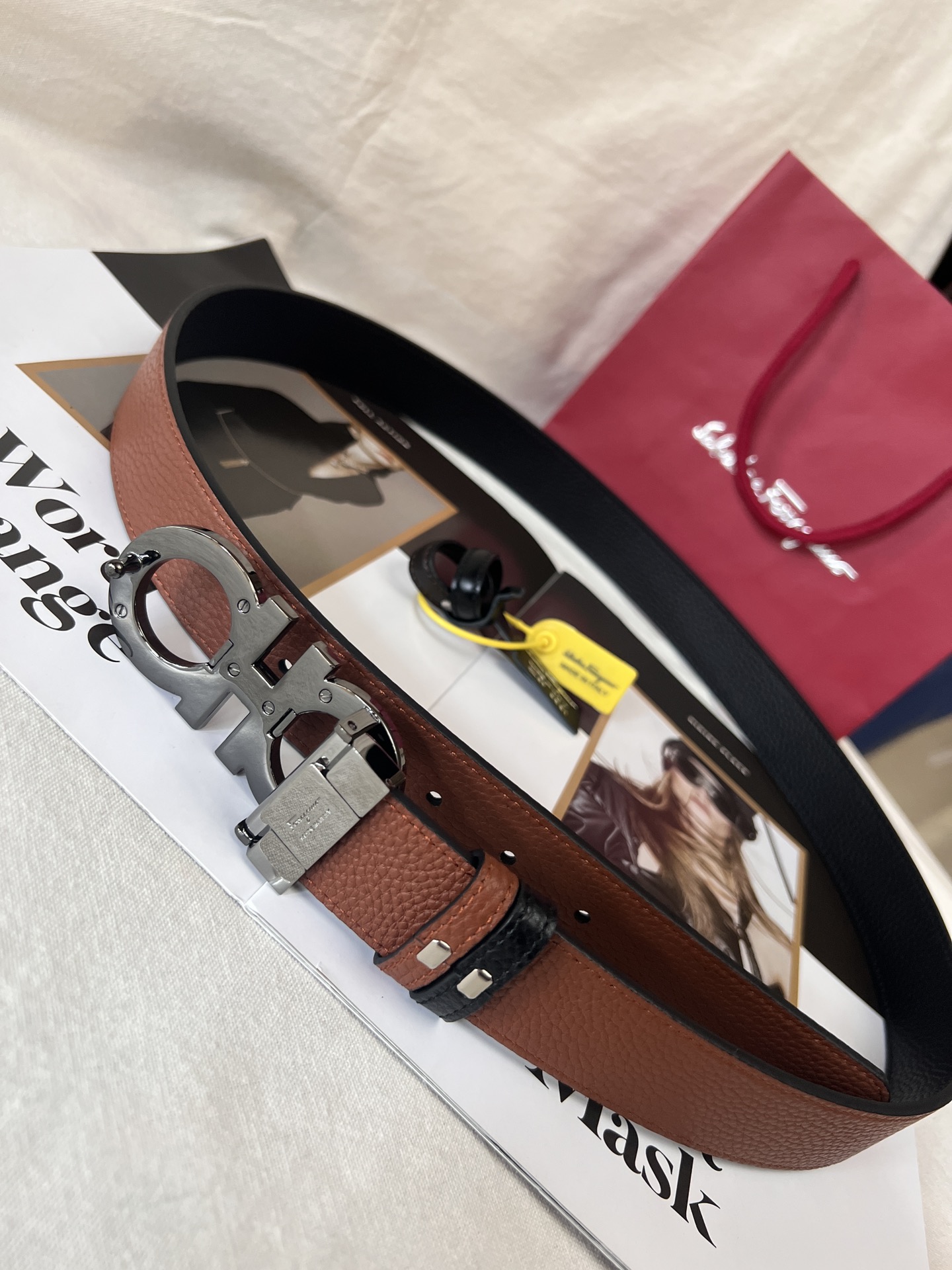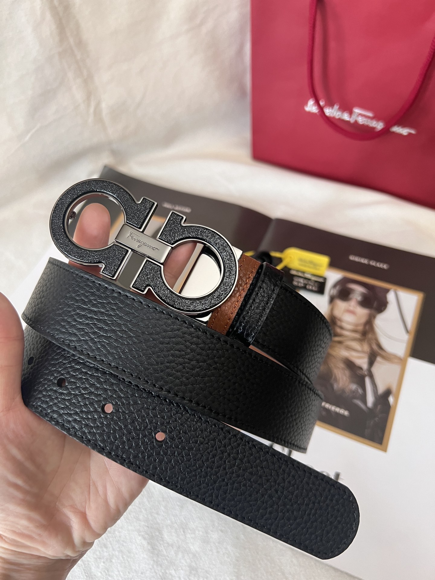 This belt features a striking style, elegant and luxurious, making it a classic brand item. Made from imported cowhide with embossed patterns and adorned with a ruthenium gray metal Gancini buckle, it exudes exquisite and unique personality. This accessory is designed with two sides and can be adjusted to fit the waist.