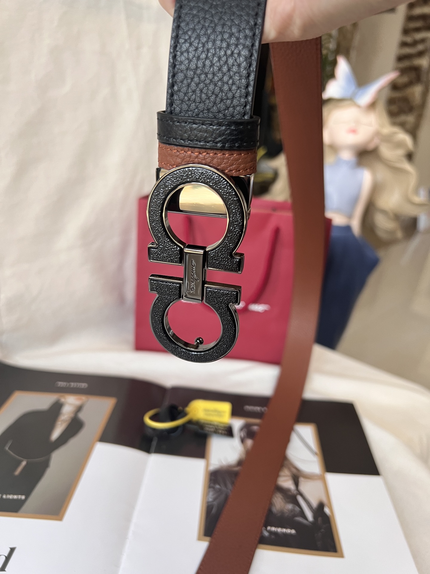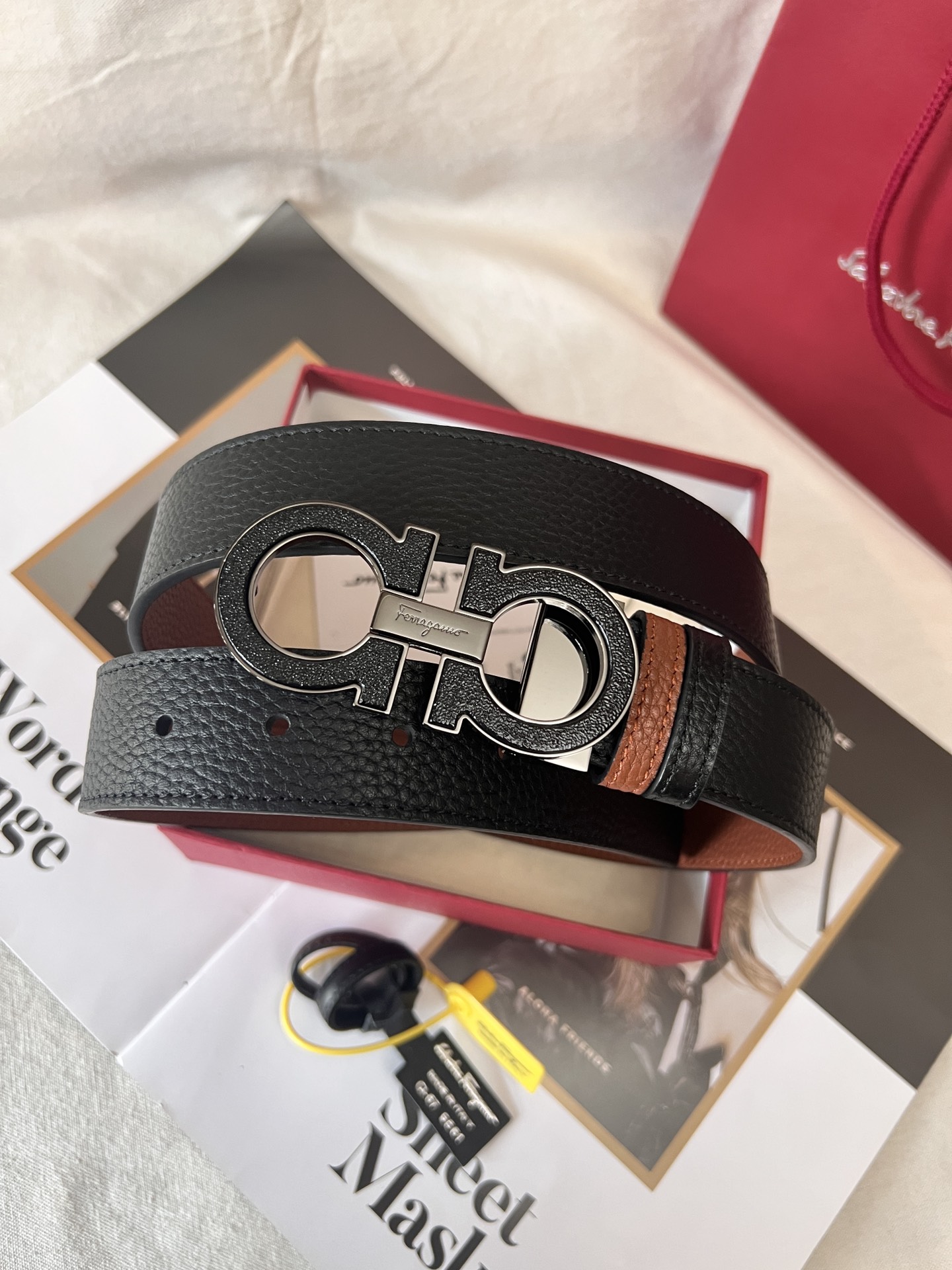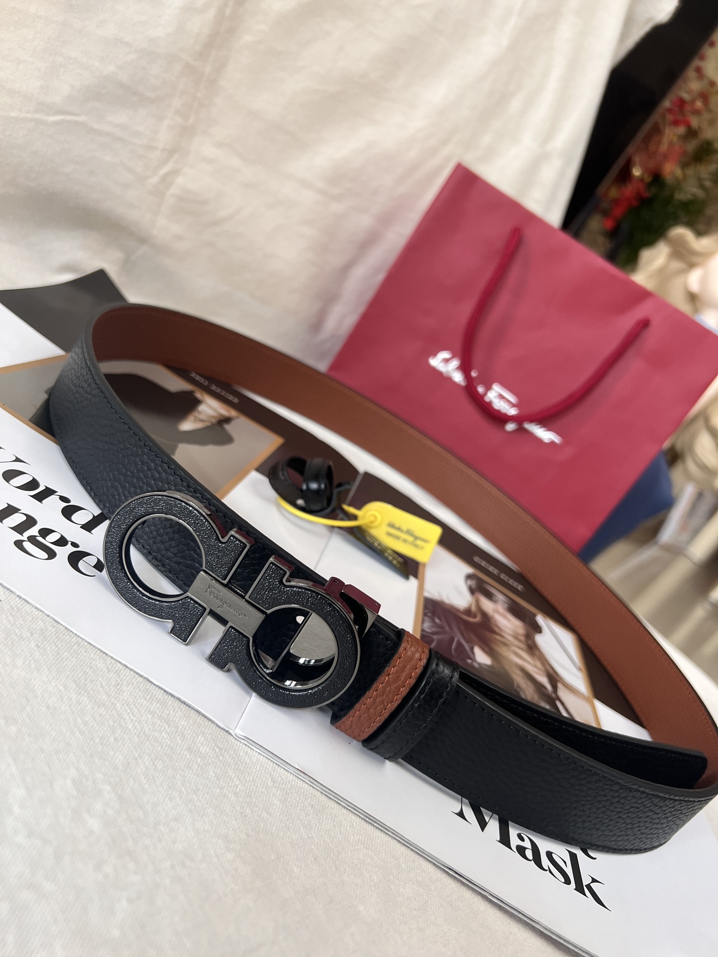This belt features a striking style, elegant and luxurious, making it a classic brand item. Made from imported cowhide with embossed patterns and adorned with a ruthenium gray metal Gancini buckle, it exudes exquisite and unique personality. This accessory is designed with two sides and can be adjusted to fit the waist.