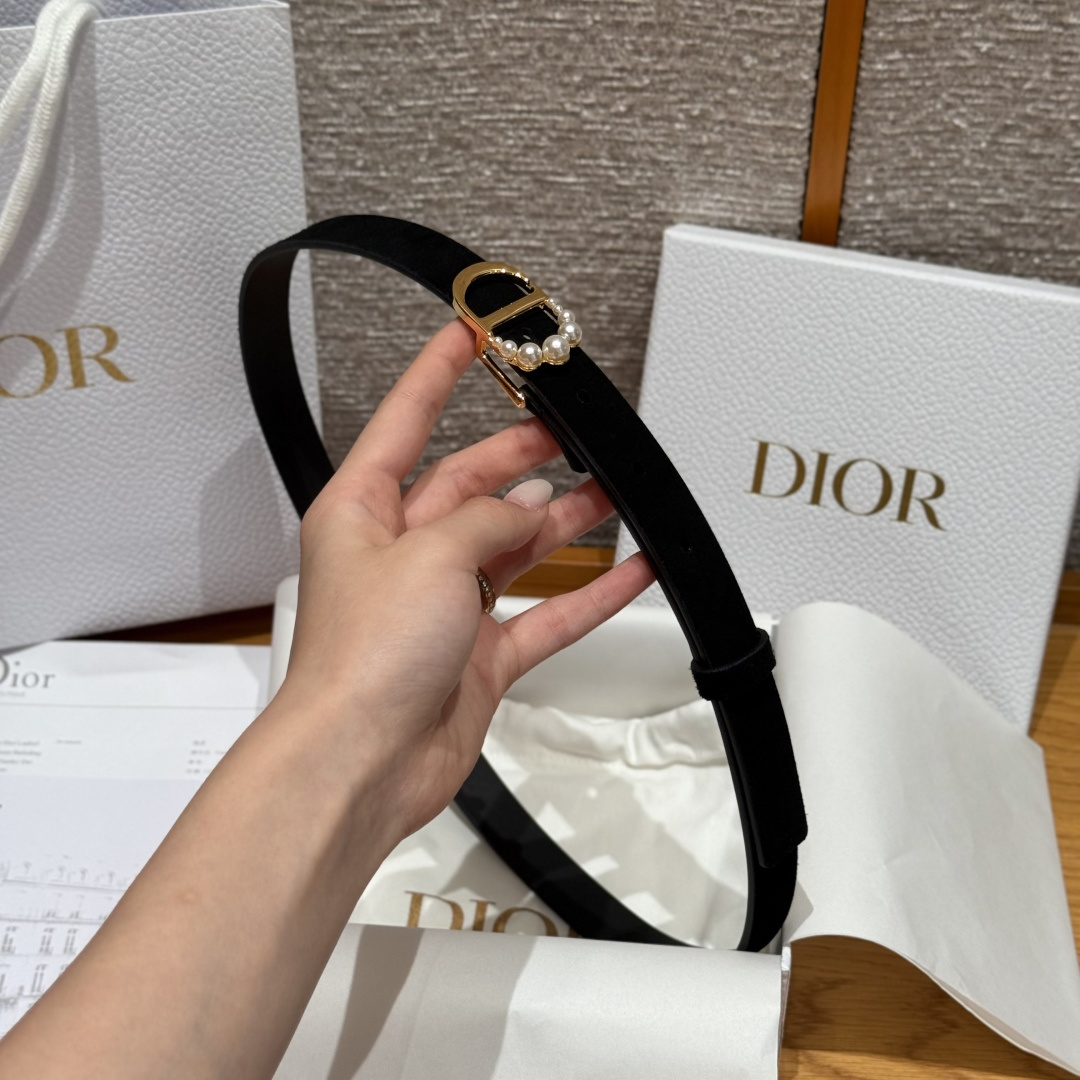 Dior new women's belt with suede front, smooth leather back, gold CD buckle with white resin beads. Elegant, matches jeans or dresses. 20mm width.
