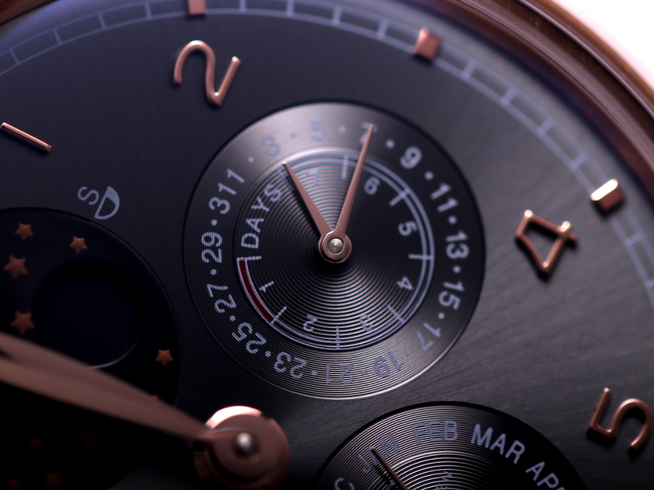 2. 【Date, Month, Day】—The date (3 o'clock position), month (6 o'clock position), and day (9 o'clock position) all operate normally and can be manually adjusted (the date can be adjusted bidirectionally by pulling out the second crown position; the month can be adjusted via the hidden button at 8 o'clock; the day can be adjusted by moving the hands).