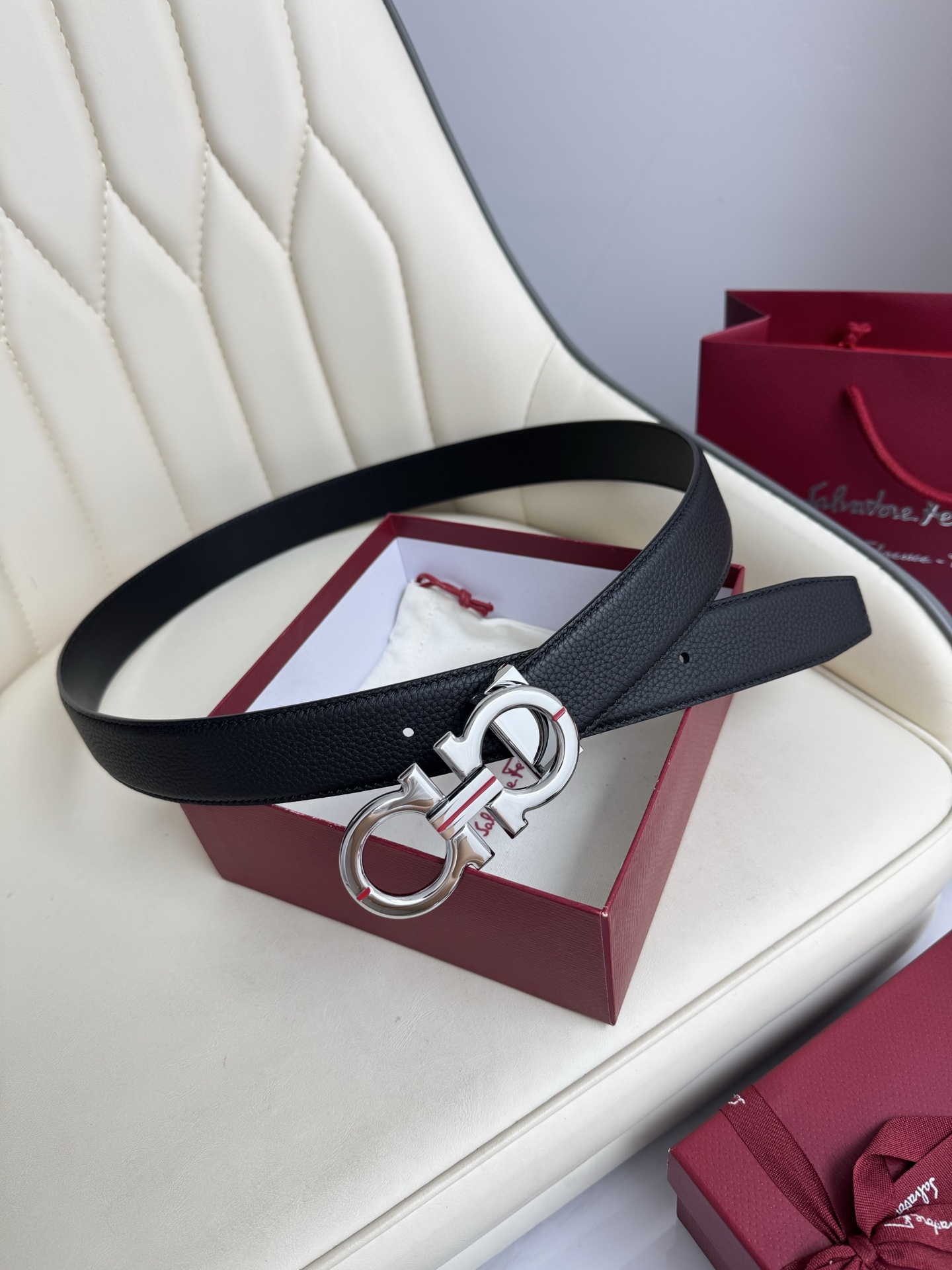 Ferragamo double-sided genuine leather belt with vacuum electroplated buckle. Versatile, stylish, and comes with full packaging.