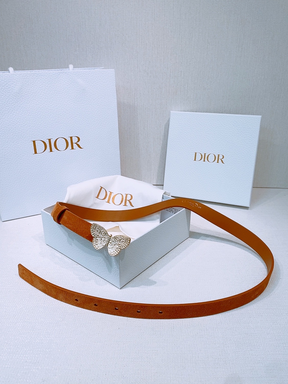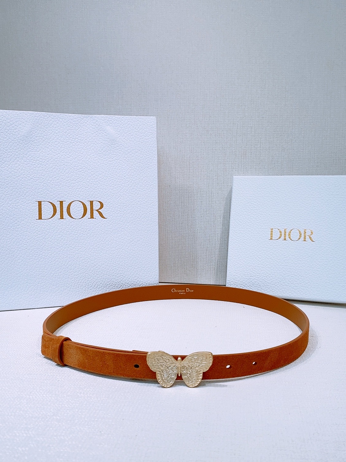 This model with an aged gold metal CD buckle is revisited in a light gold suede calfskin version, presenting a casual and modern look.