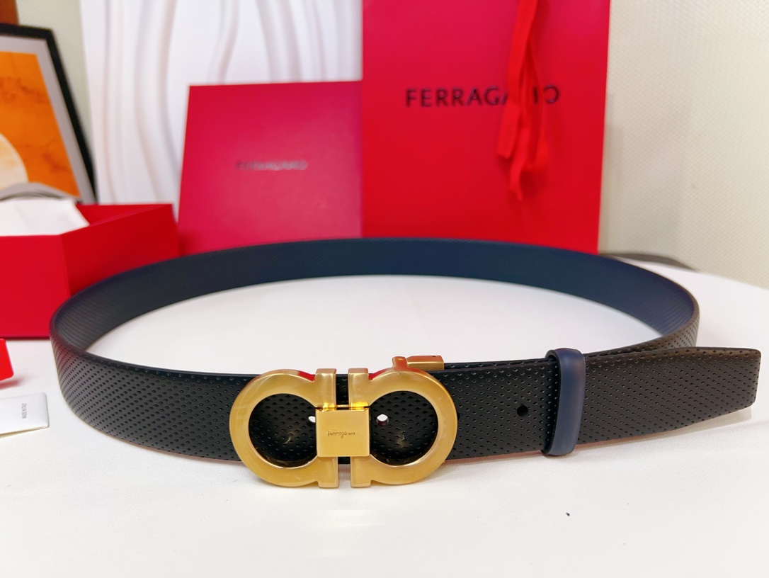 This double-sided belt is stylish and versatile, an indispensable men's accessory item. One side is made of hammered cowhide, while the other side is made of selected natural grained cowhide, adorned with a gold-finished Gancini buckle for an eye-catching touch. The interior features exquisite satin decorative details. The length is adjustable. The belt can be trimmed or additional eyelets can be added to create a tight or loose fit. 3.5 wide