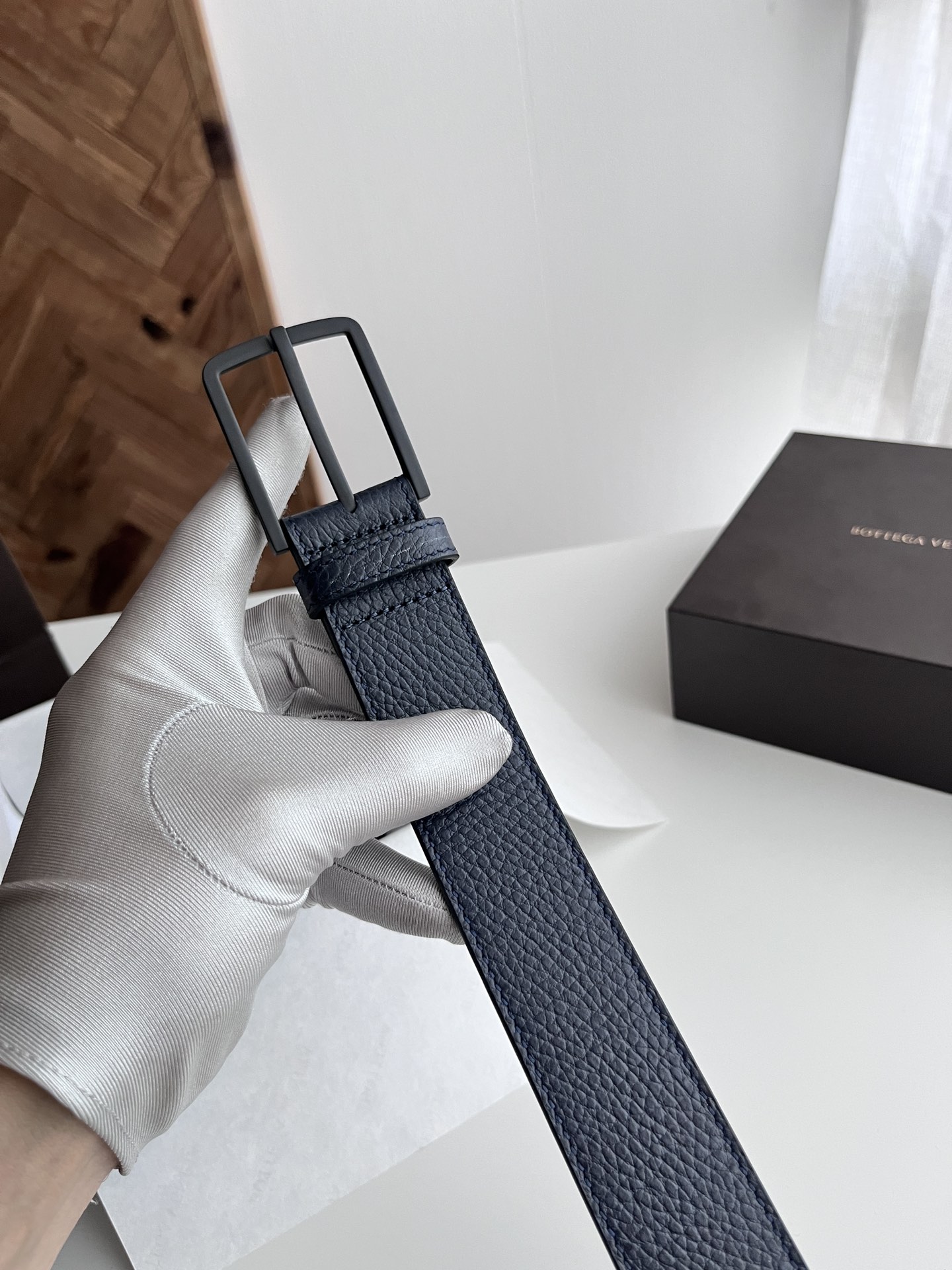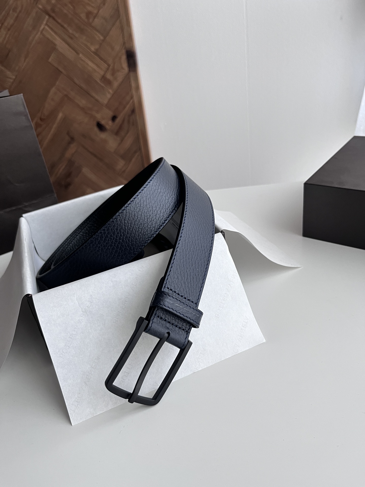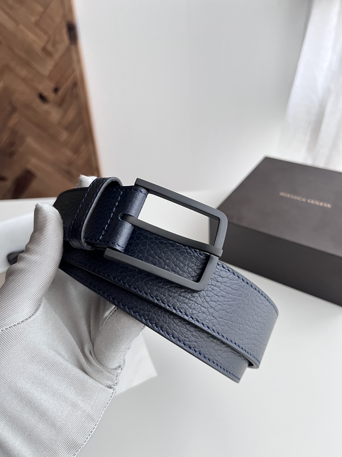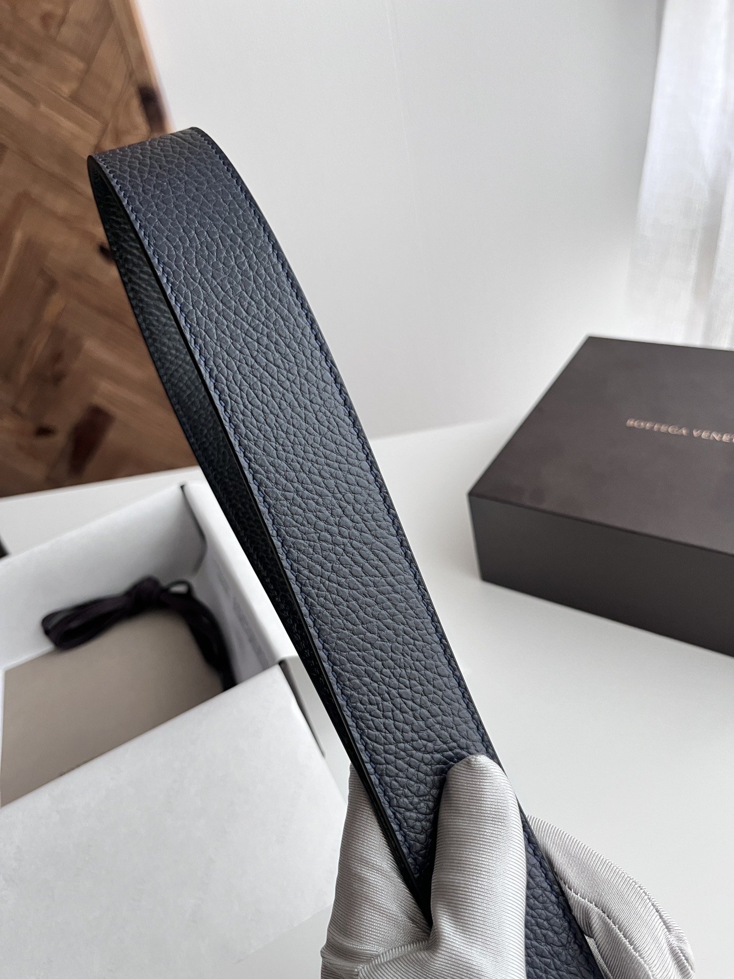 Bv 2024 latest men's flat belt double-sided Italian lychee grain calfskin with vacuum gunmetal pin buckle side marked width 35MM color: midnight blue plus black
