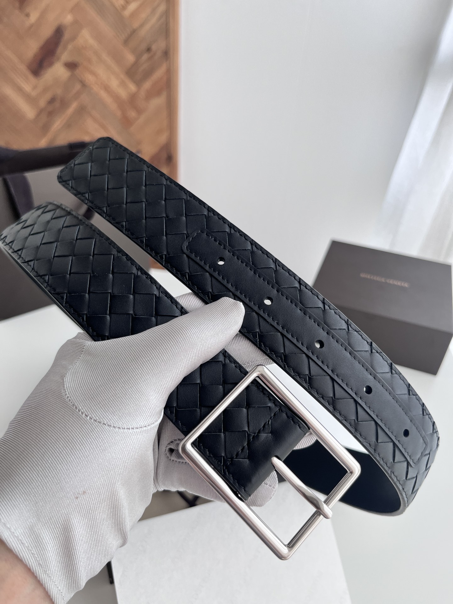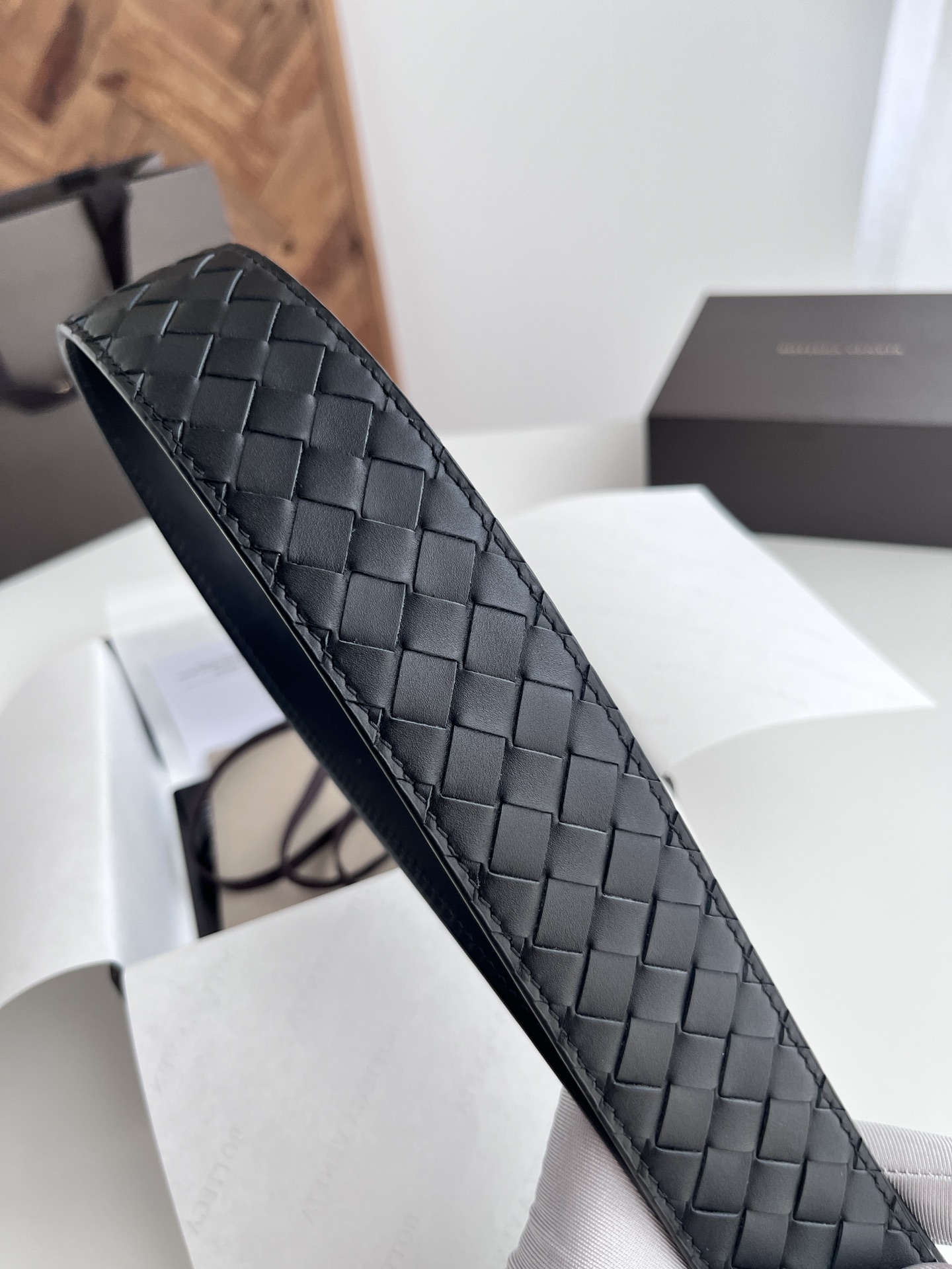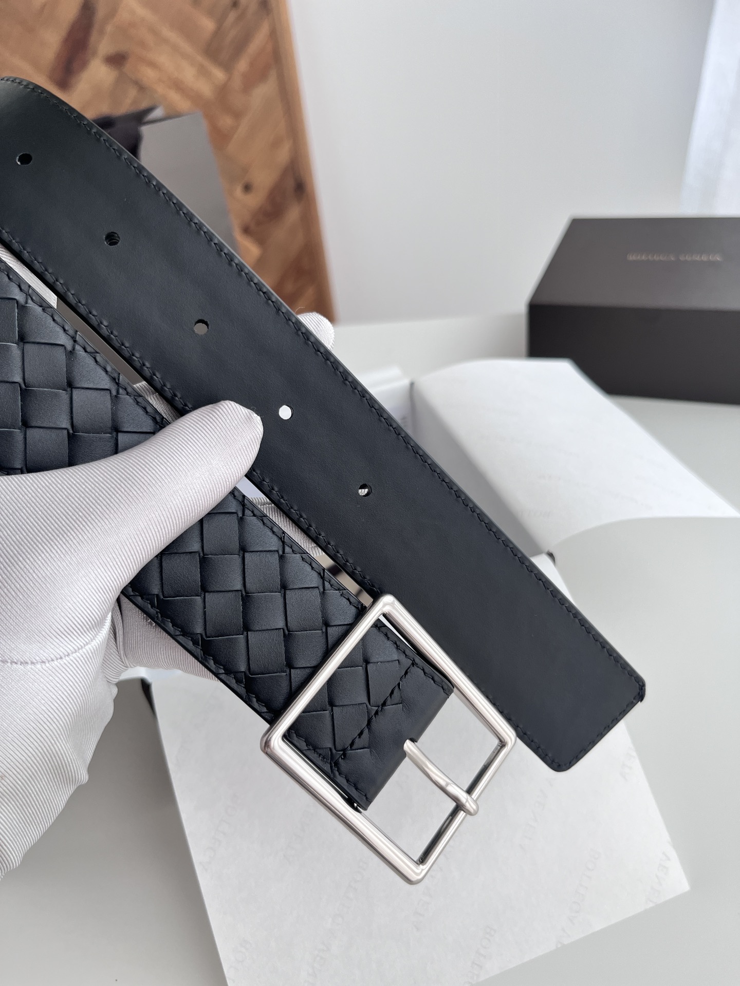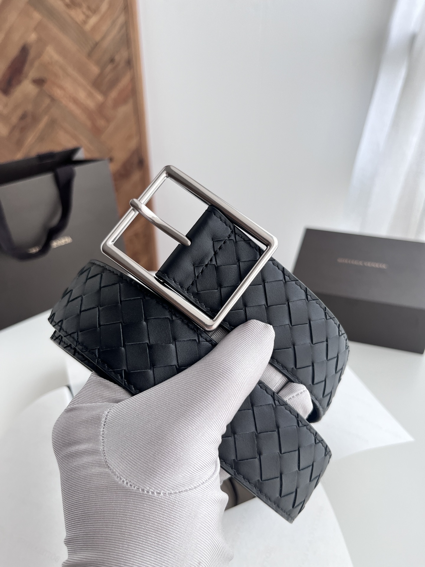 BV 2024 New Wide Version Men's Belt, Pure Handmade Small Checkerboard Intreccio Woven Italian Calfskin, Paired with Slightly Retro Silver Pin Buckle, New Hole Position Design, Belt Width 4.0cm, Color: Black