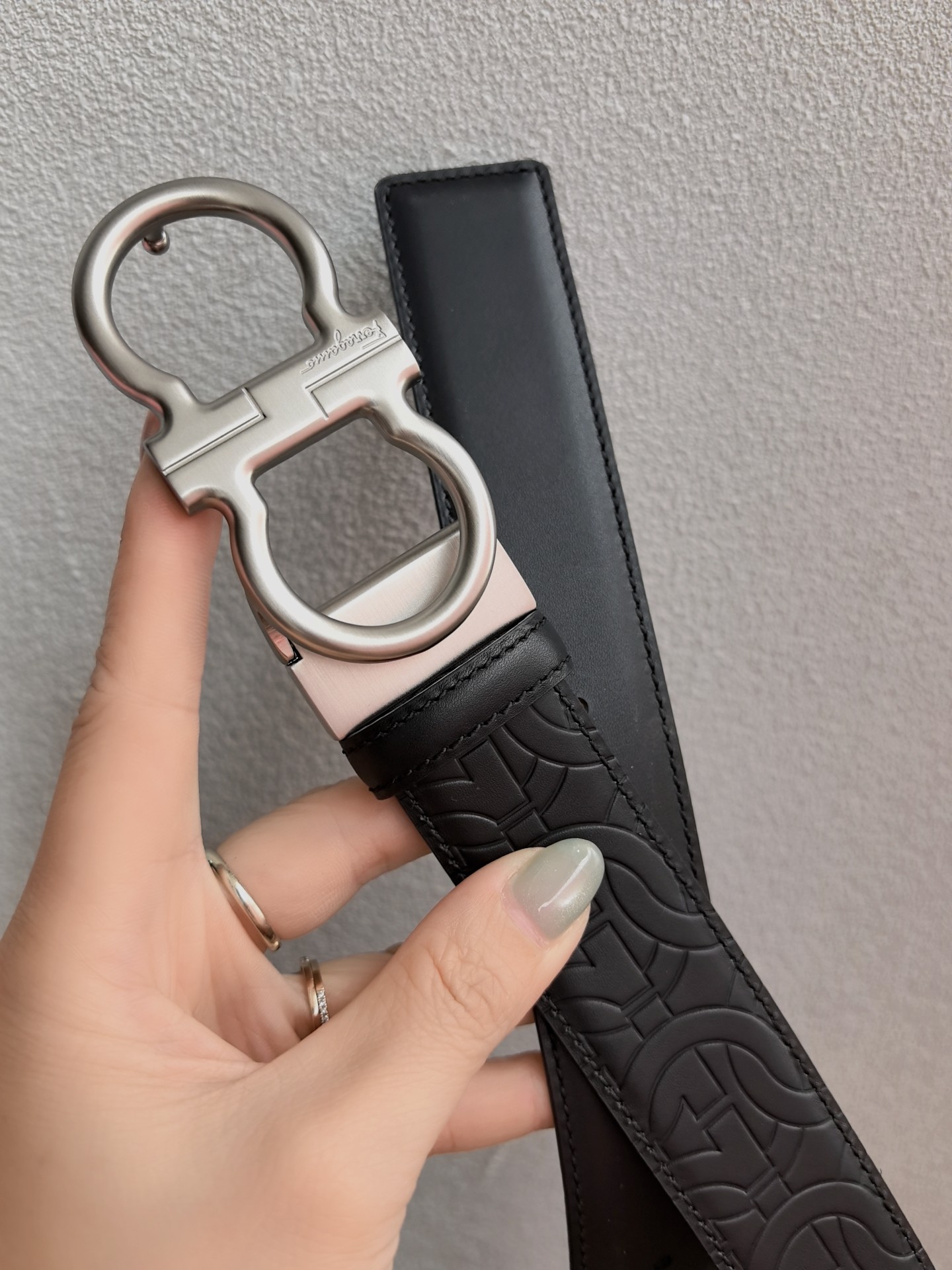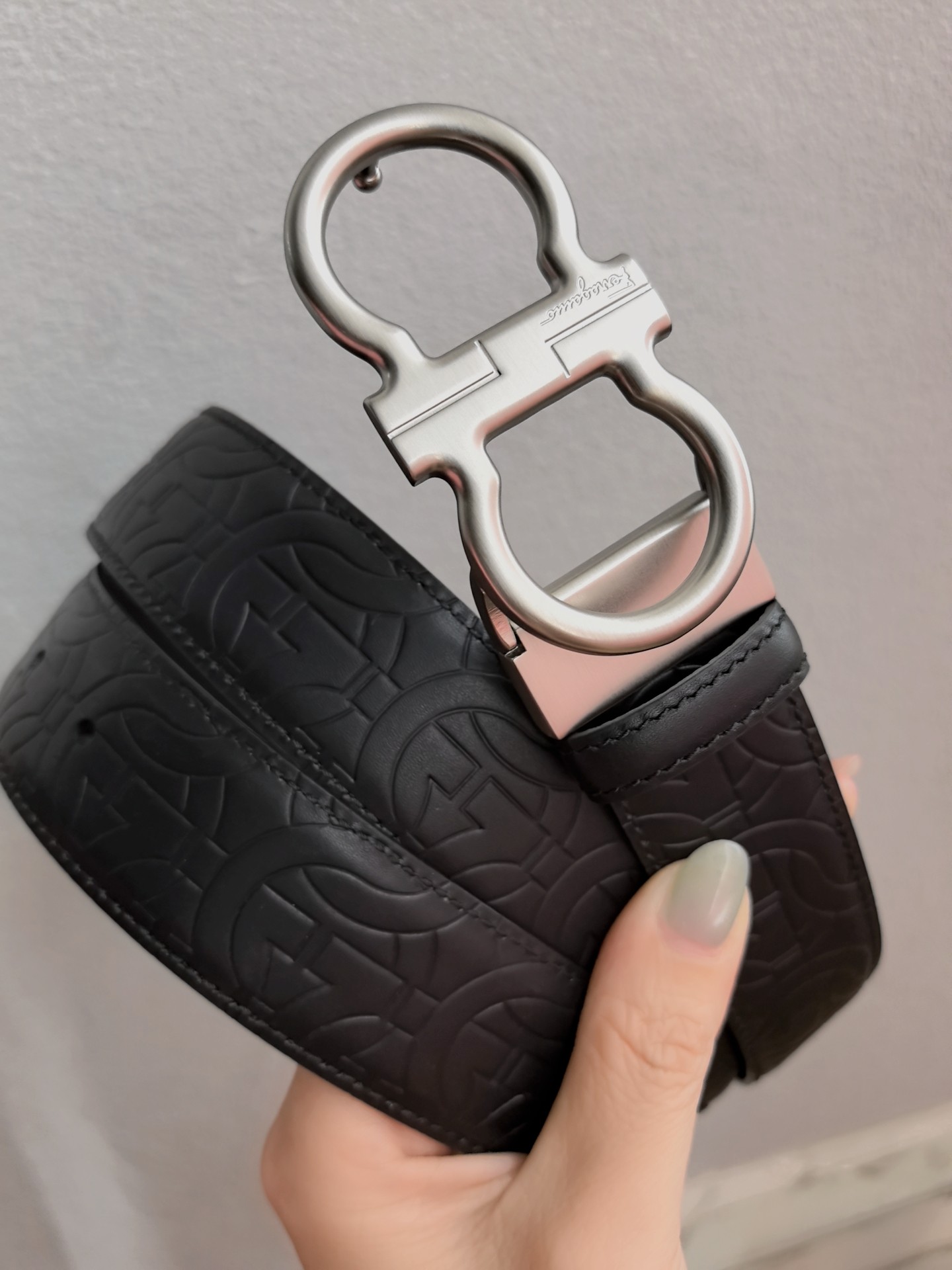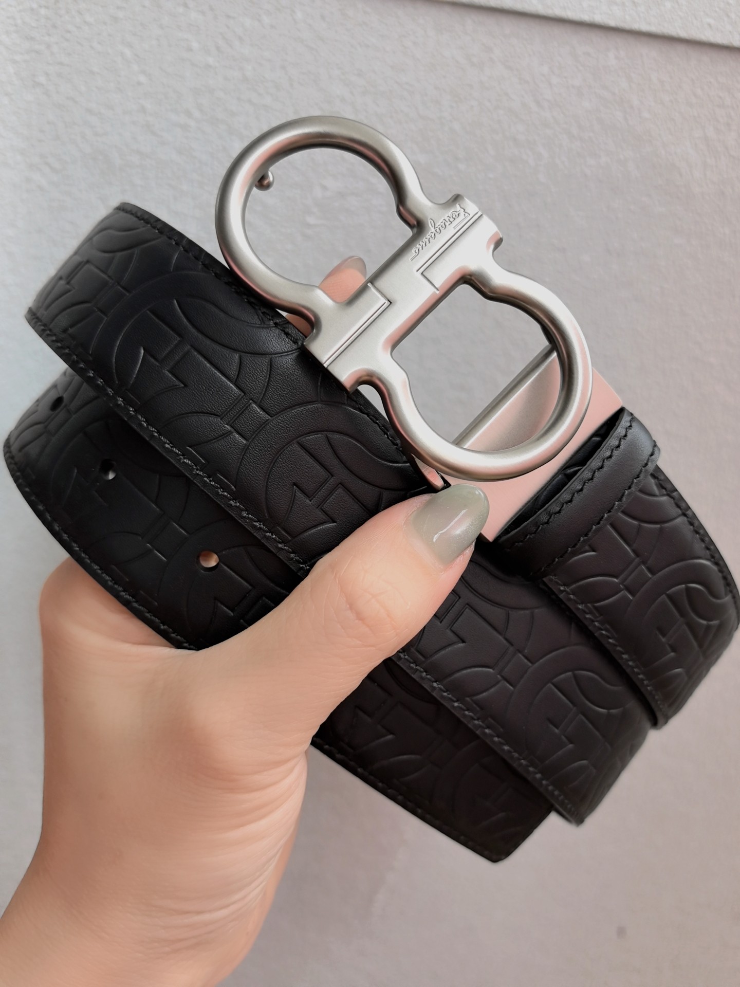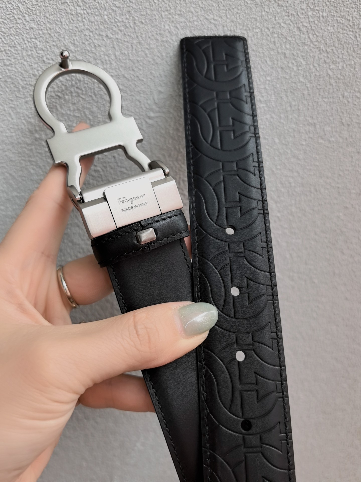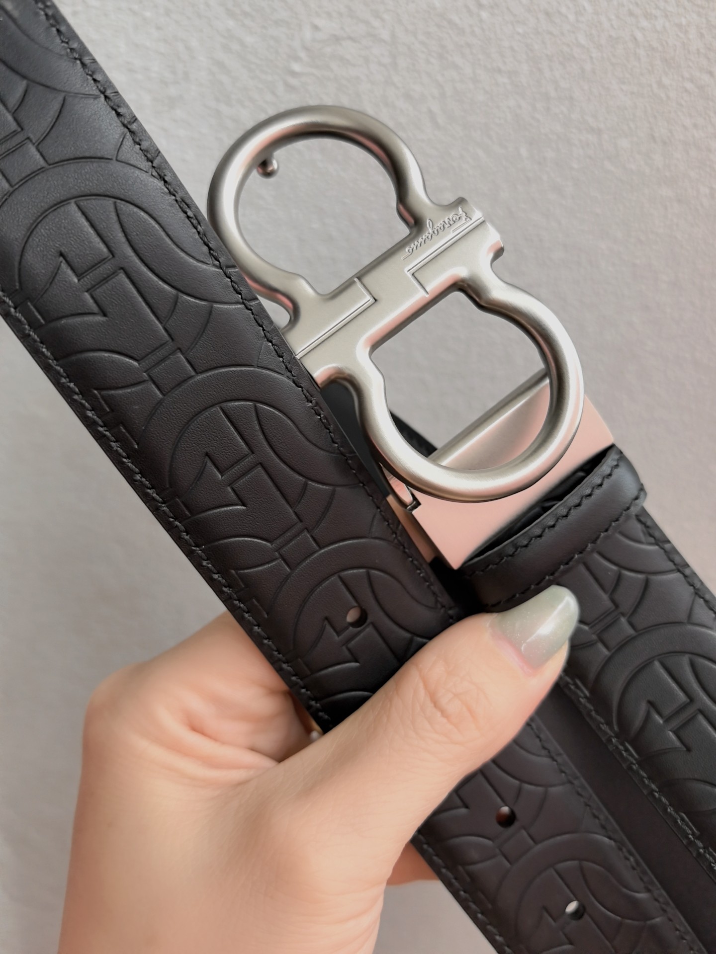 This belt features a double-sided design, with contrasting texture effects on both sides. One side is treated with wax immersion and natural tannin dyeing, resulting in a delicate and refined finish. The other side undergoes sanding and aniline dyeing, creating a luxurious and captivating texture. The painted buckle complements the Gancio profile, adorned with a central rectangular cut-out pattern. The length is adjustable, allowing the belt to be trimmed to size or additional eyelets to be added.