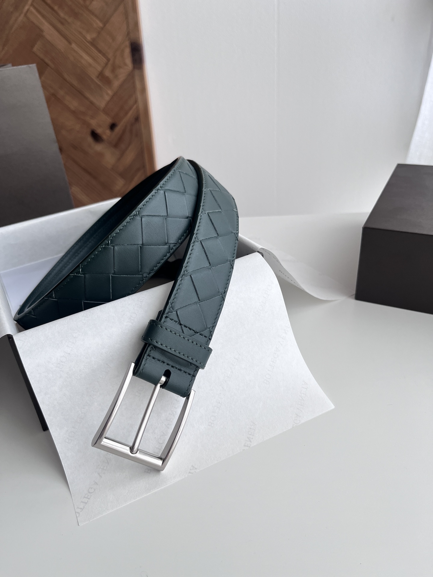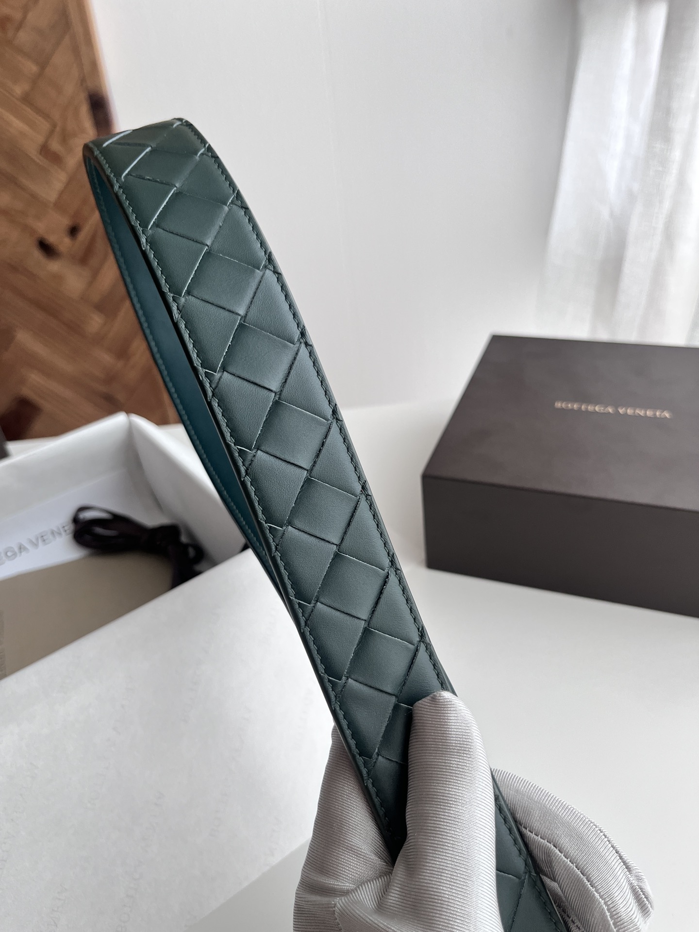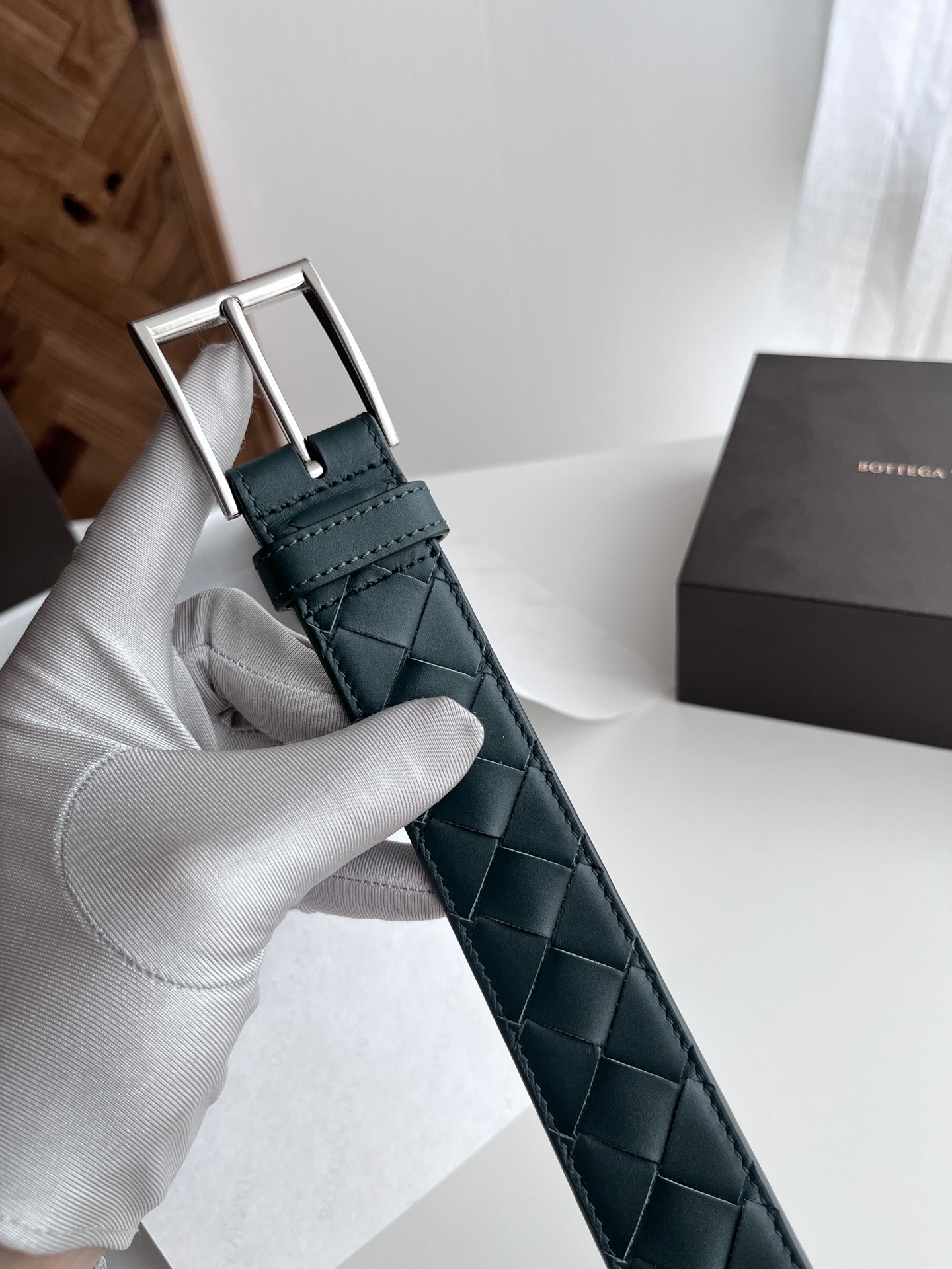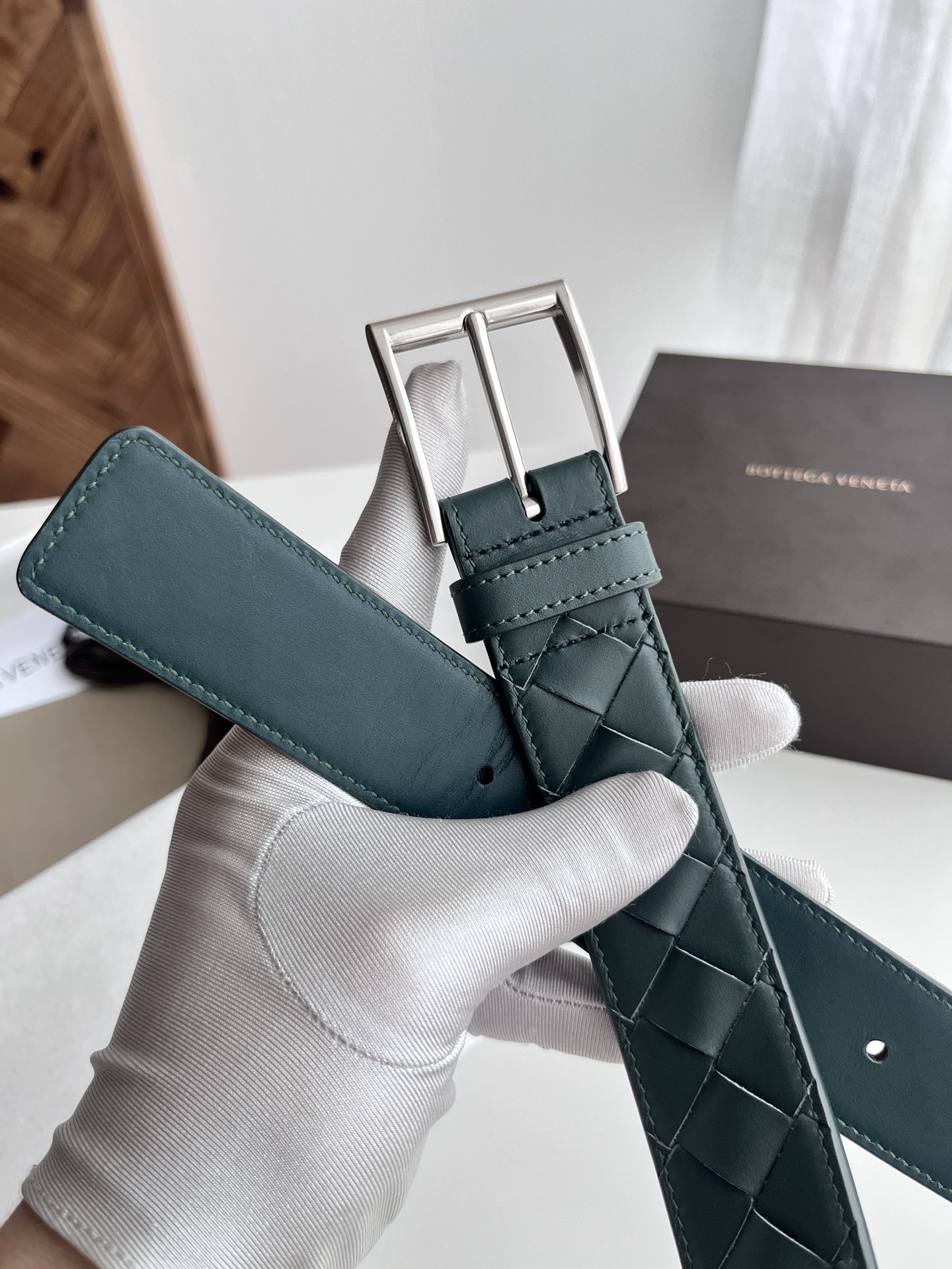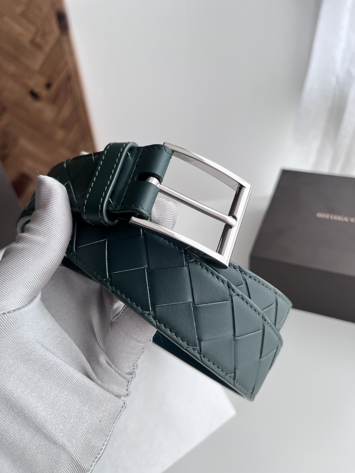 BV 2024 New Men's Belt, Fully Handcrafted Large Intrecciato Piccolo Weave Italian Calfskin, Paired with Slightly Vintage Silver Pin Buckle, Logo on the Side, Belt Width 3.5cm, Color: Cypress Green + Cypress Green