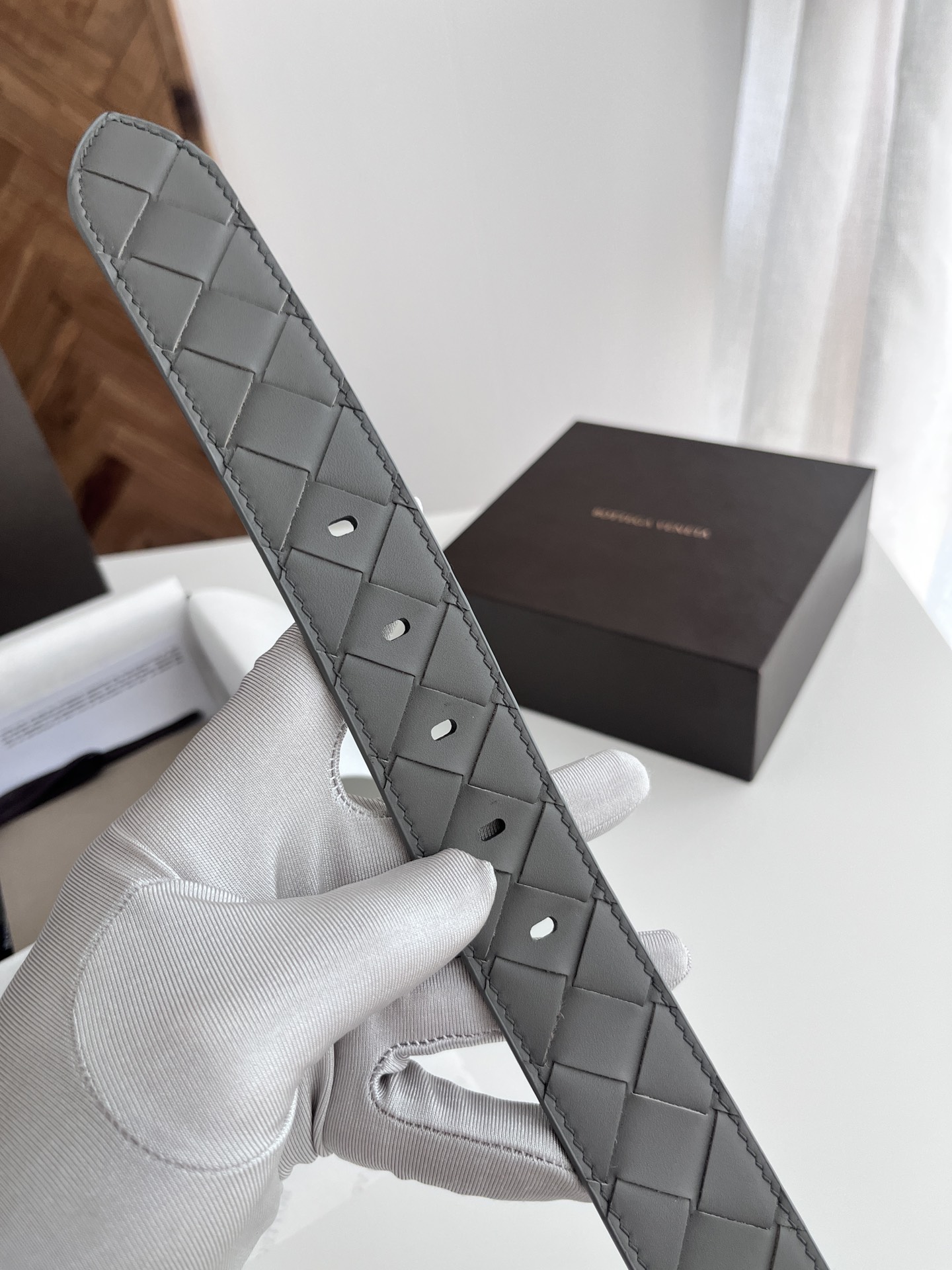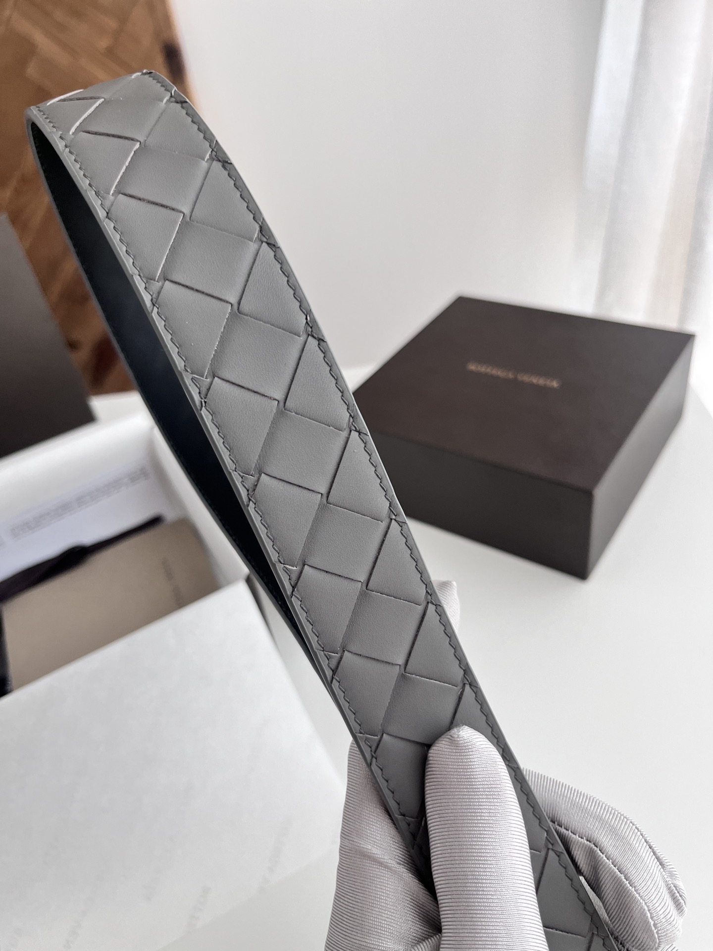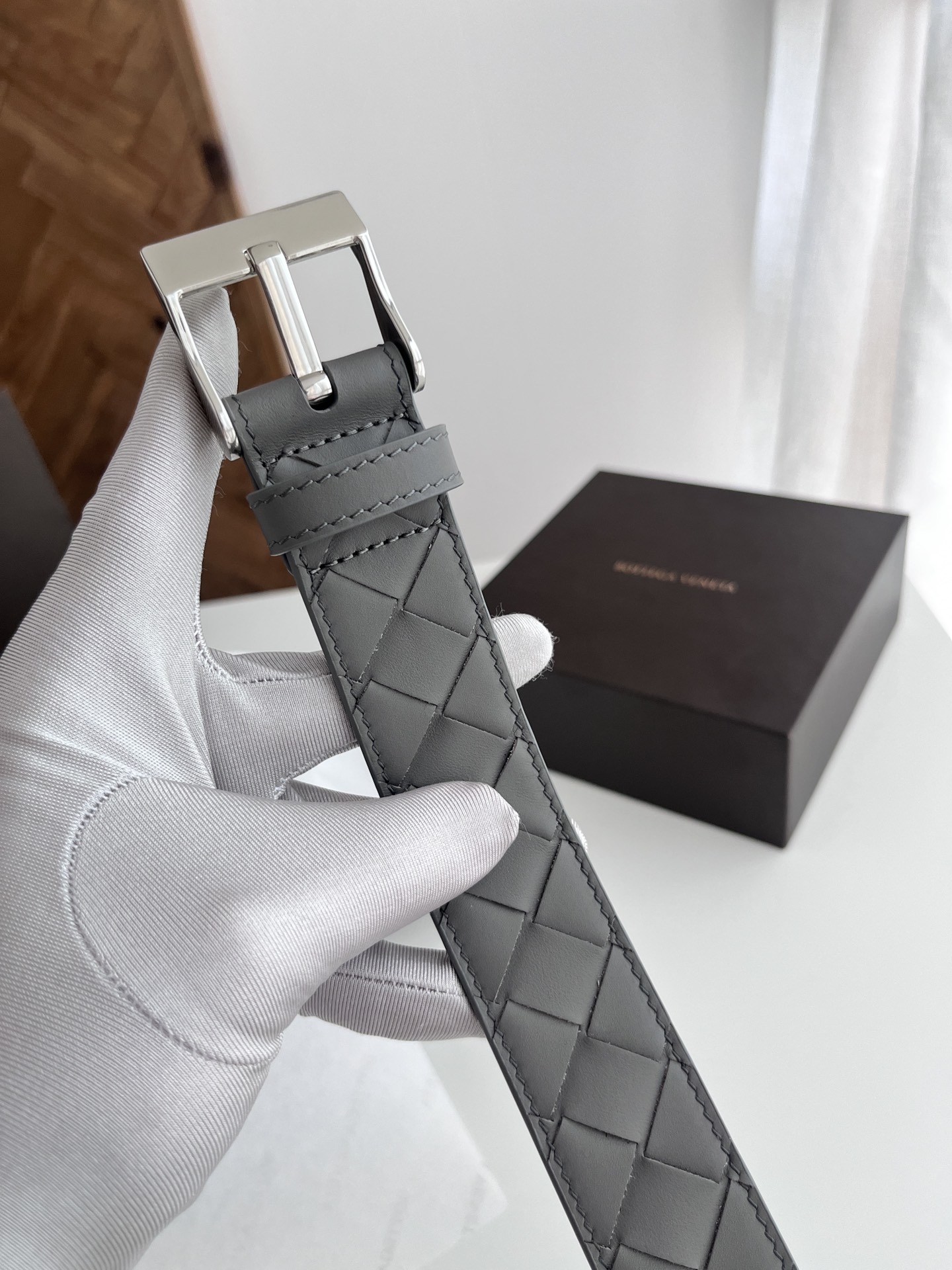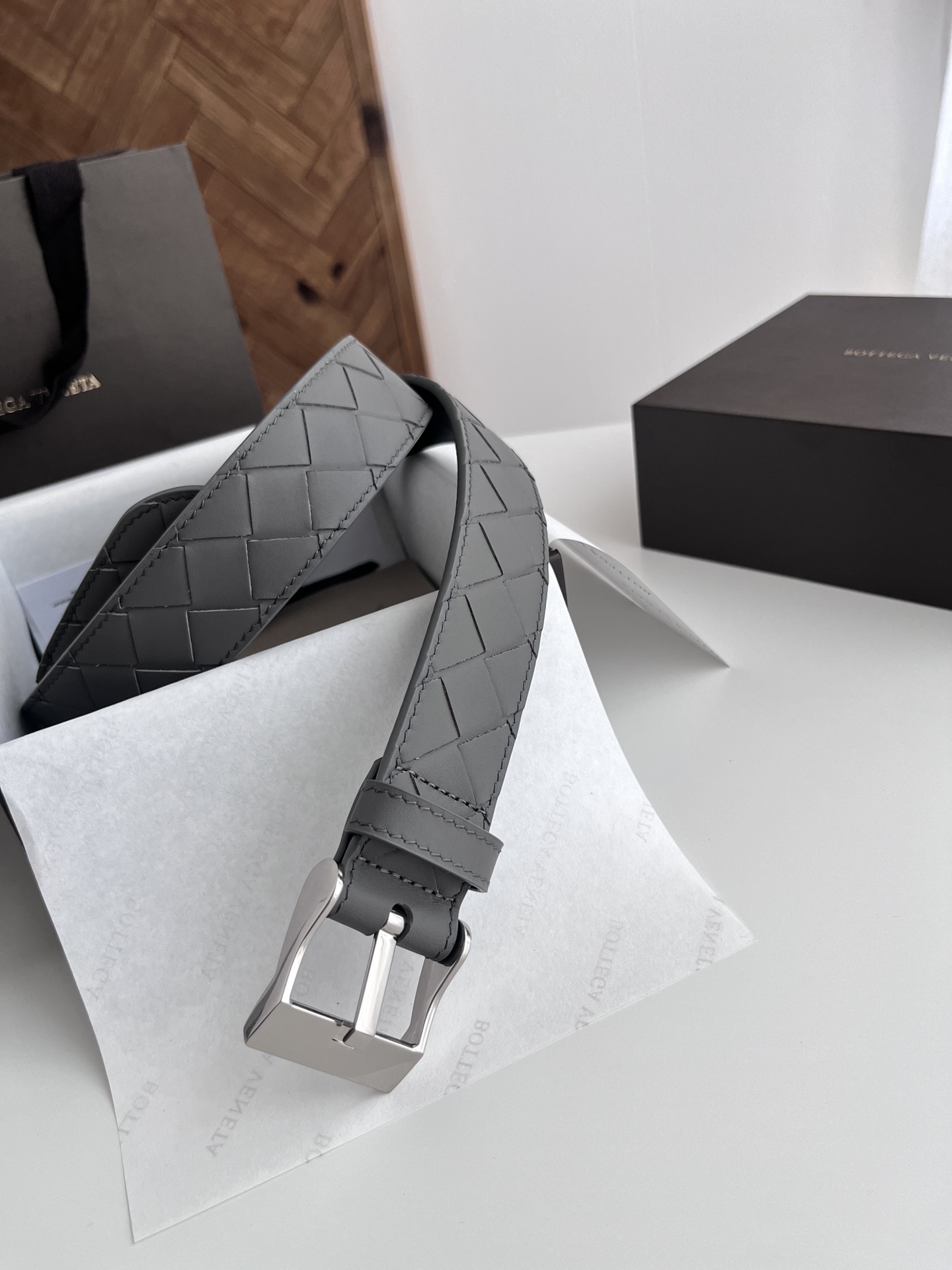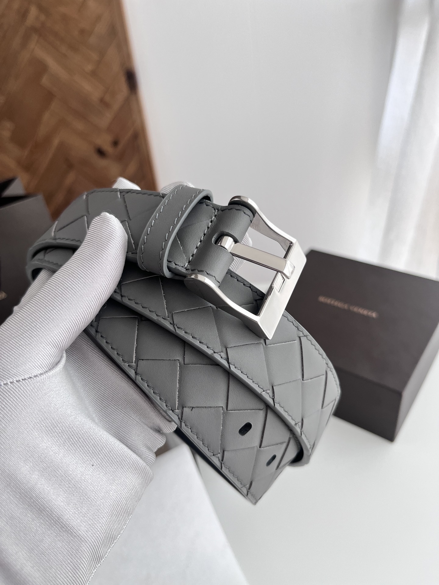 BV 2024 New Men's Belt Pure Handmade Large Intreccio Weave Italian Calfskin Paired with New Buckle Design Slightly Retro Silver Pin Buckle Strap Width 3.5cm Color: Gray