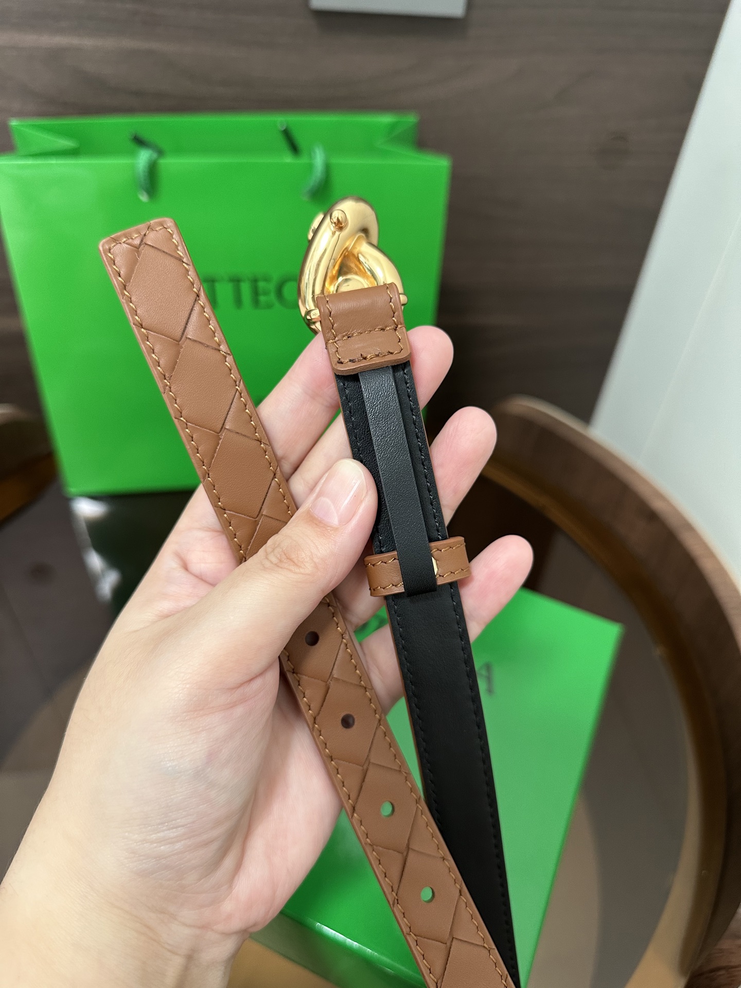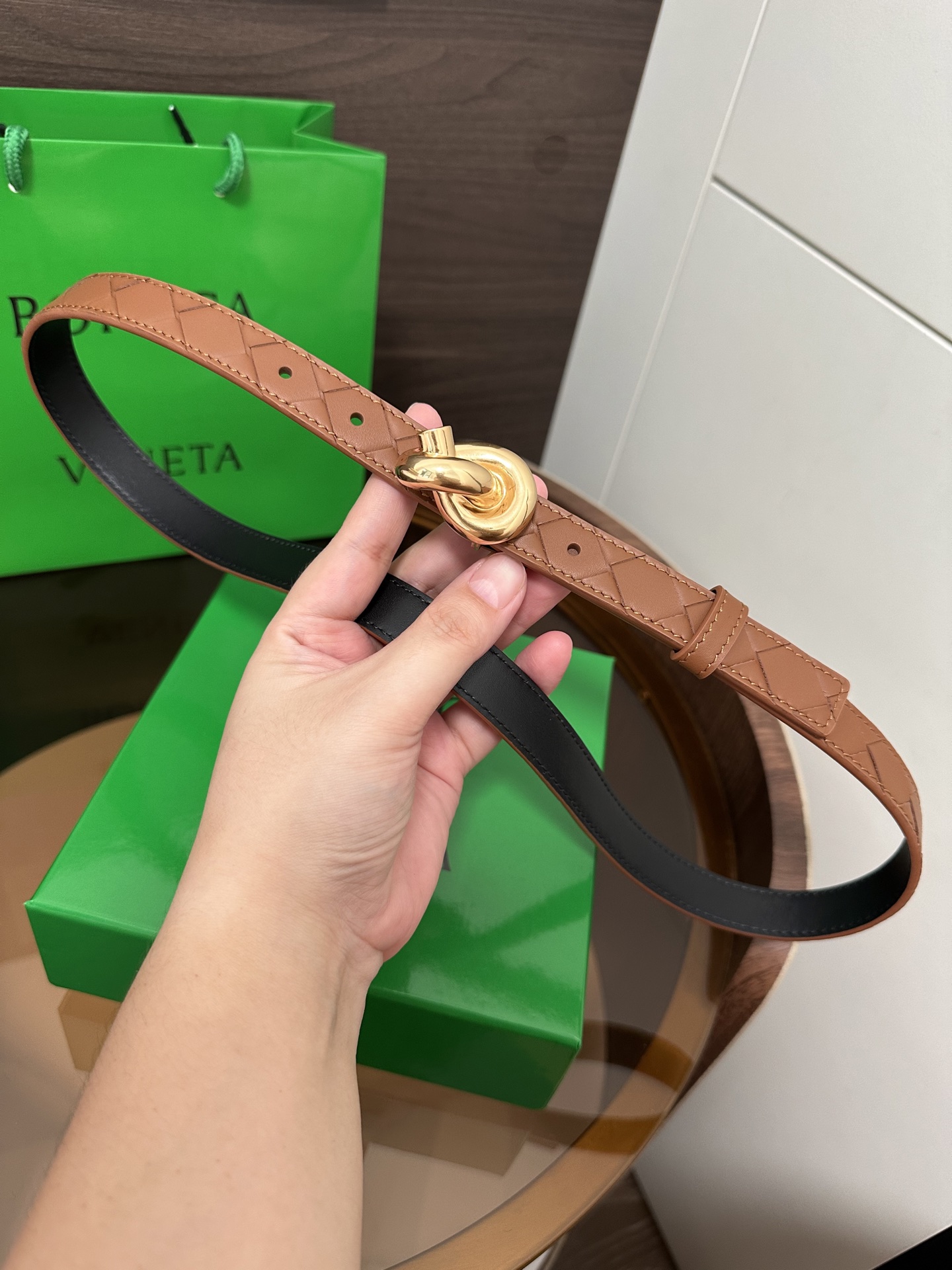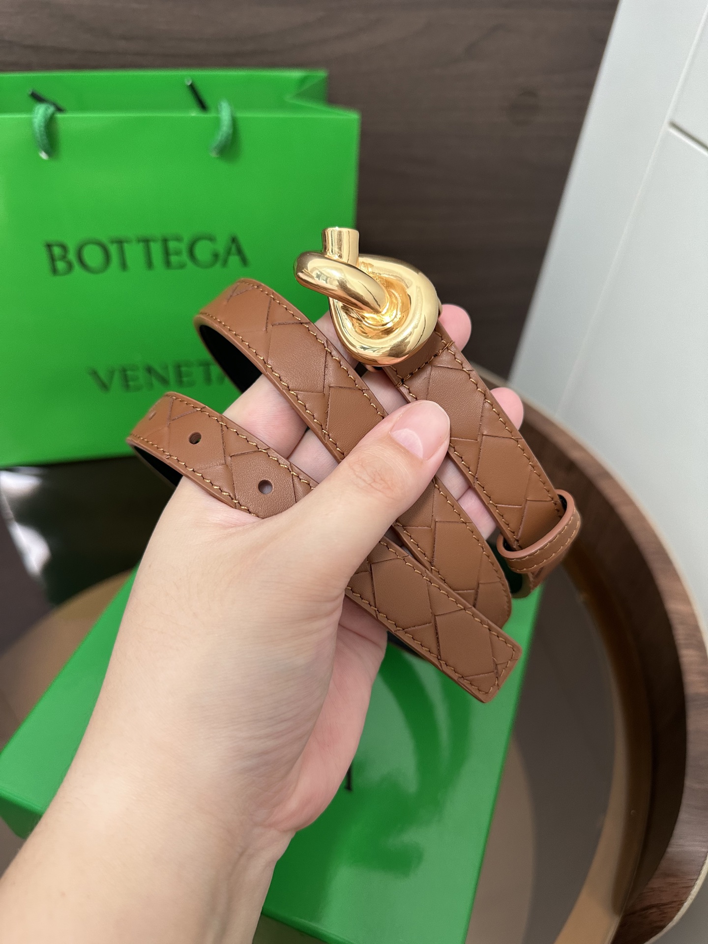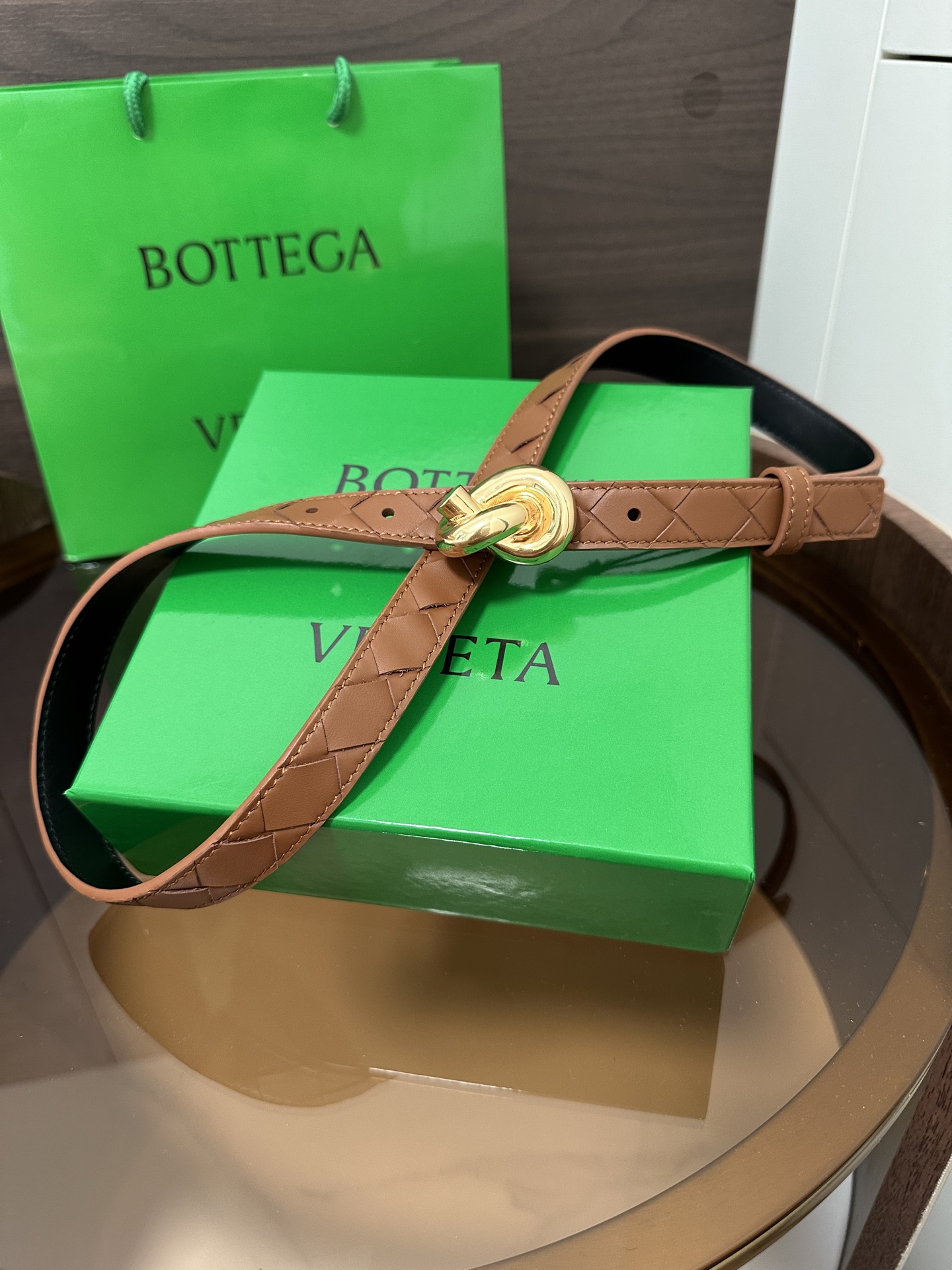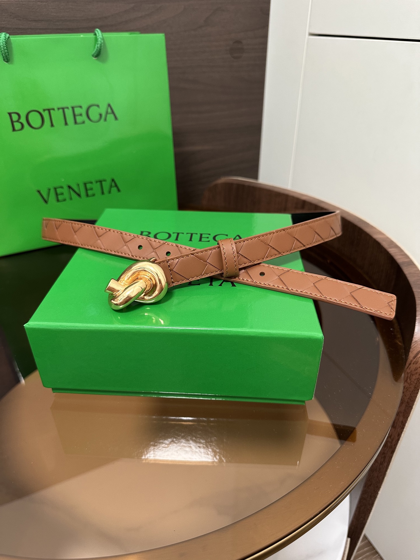 BV New Intrecciato woven smooth leather belt, featuring iconic knot buckle.