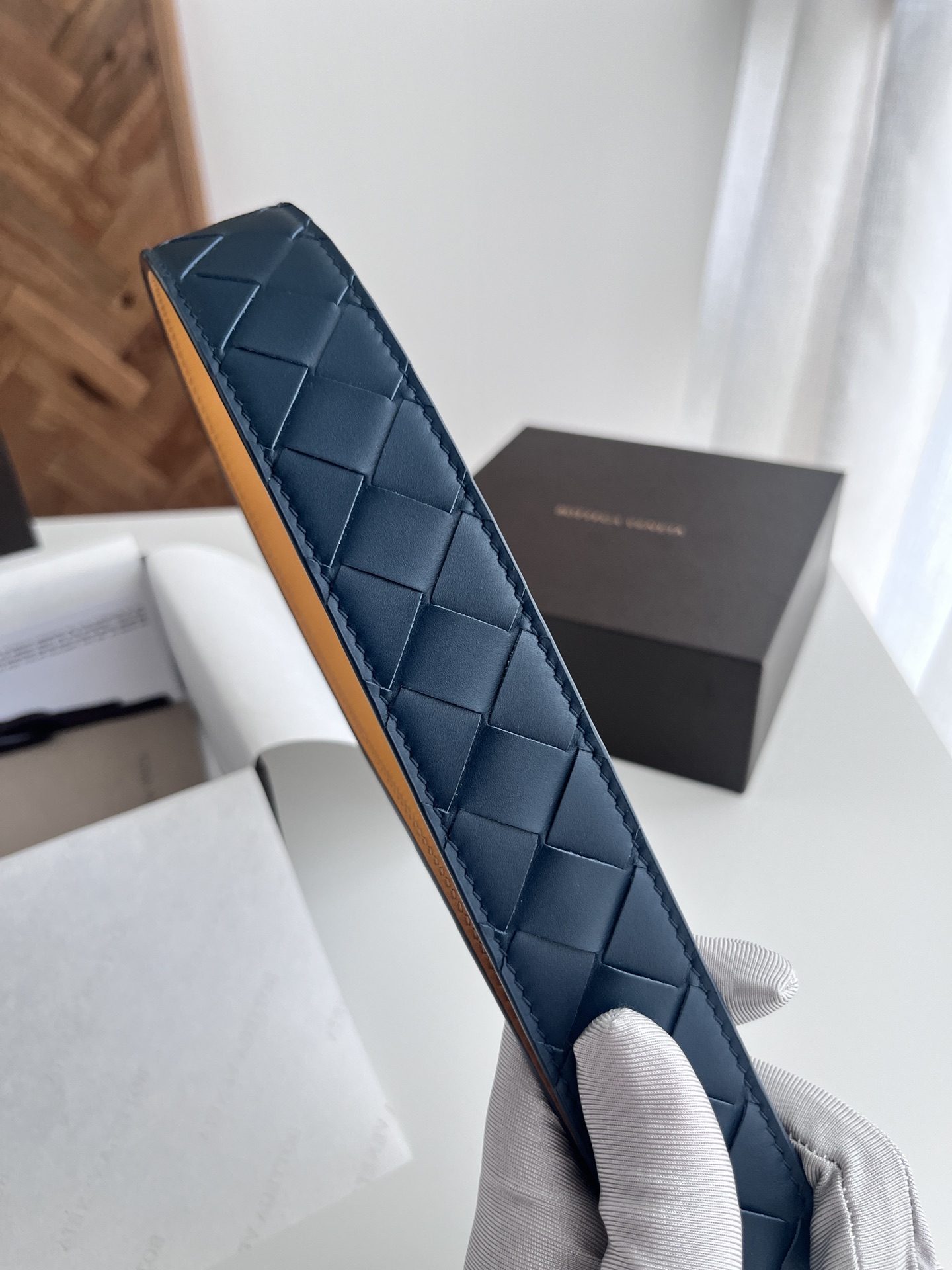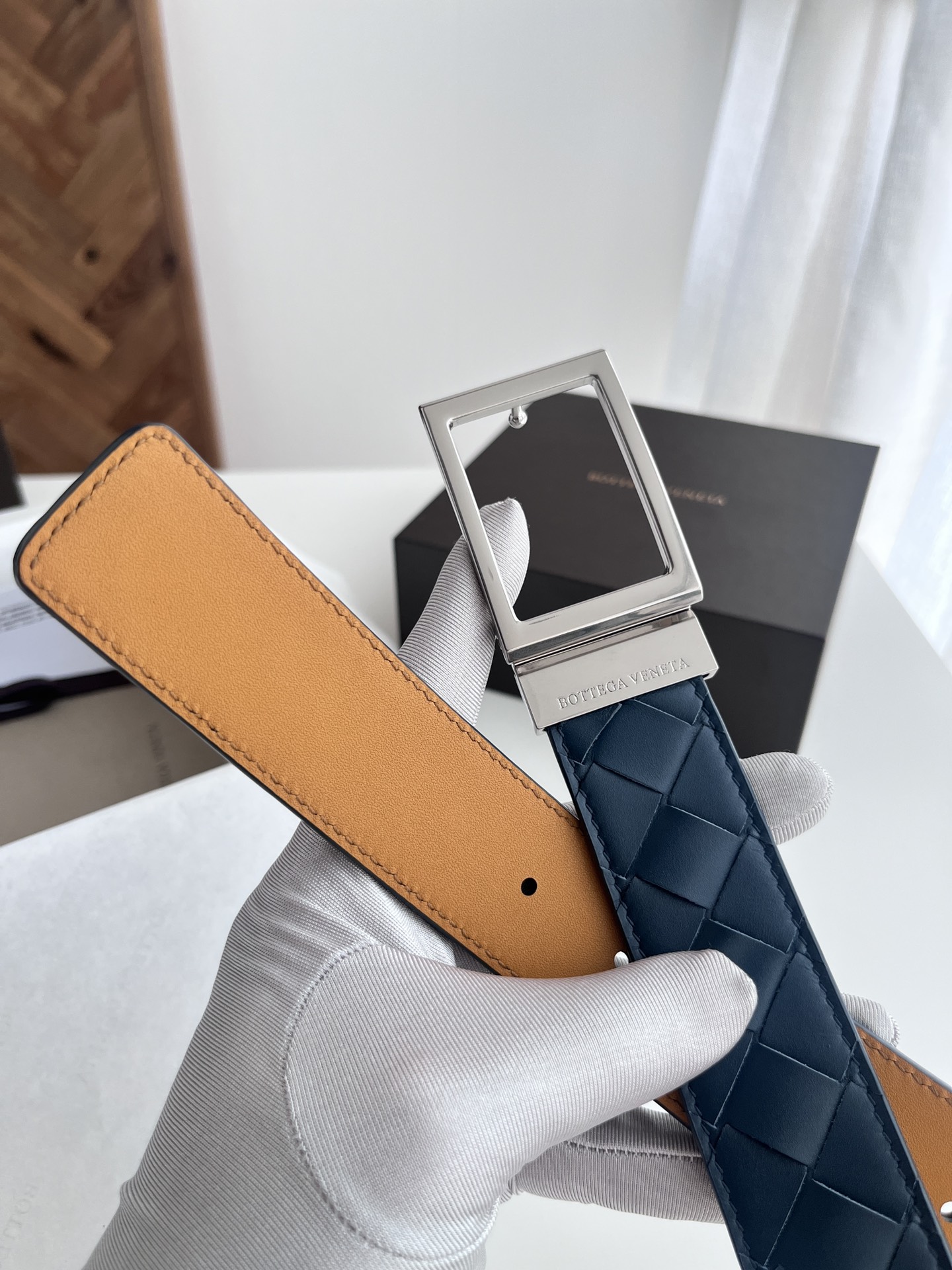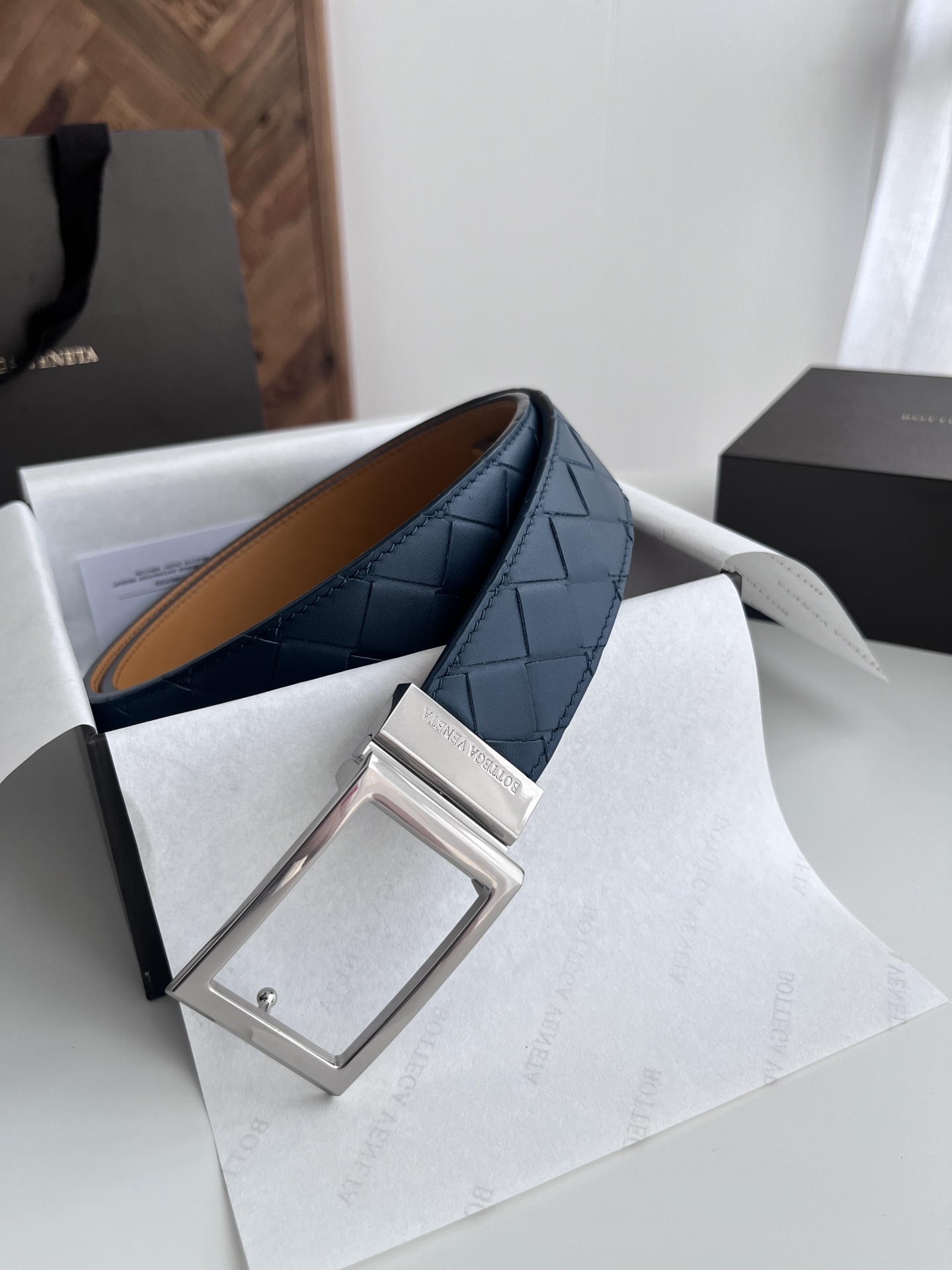 Bv latest men's woven belt double-sided use pure handmade intreccio large grid weaving double-sided Italian calfskin with slightly retro silver rotating buckle front has logo width 35MM color: space blue plus golden brown