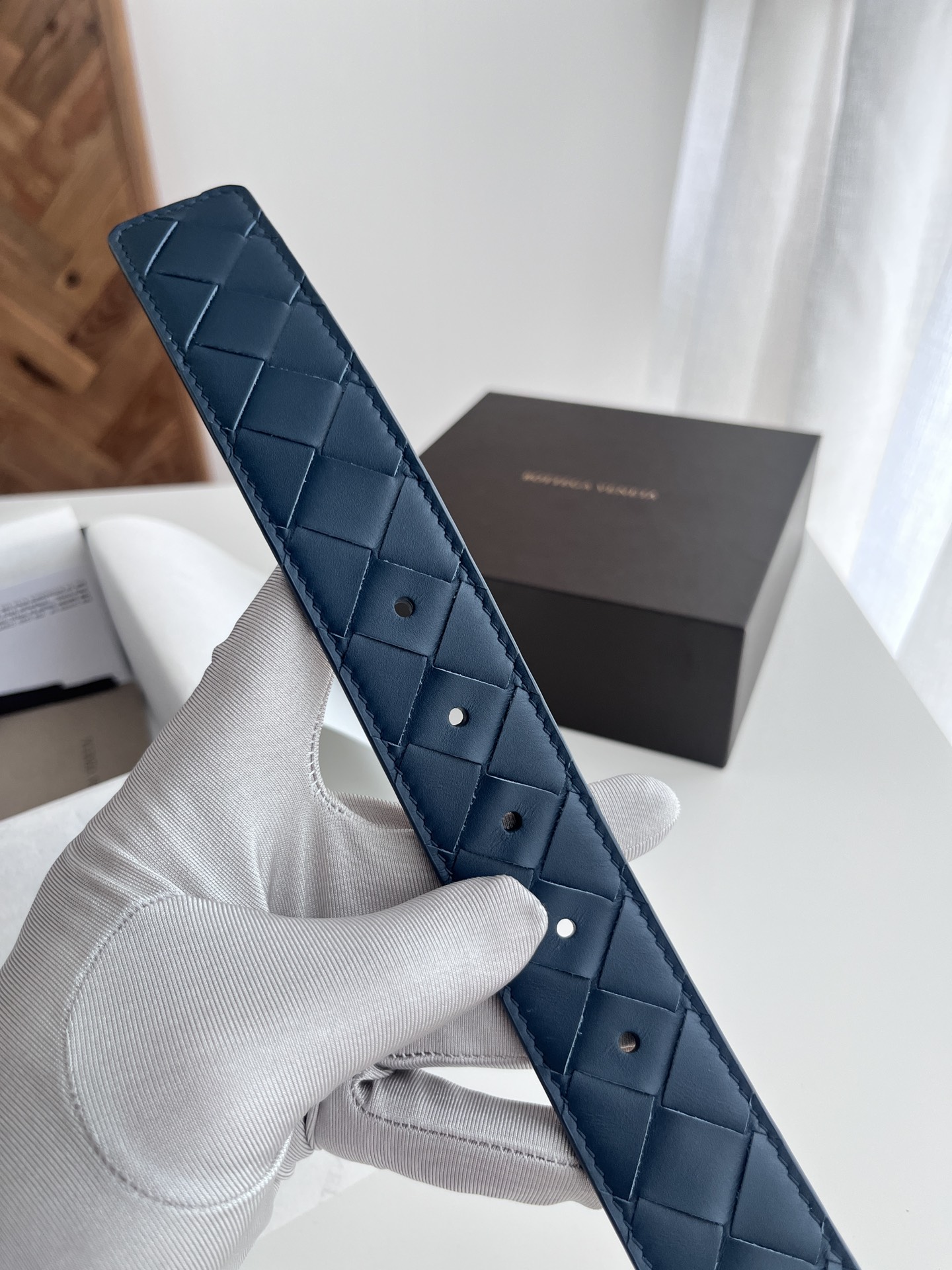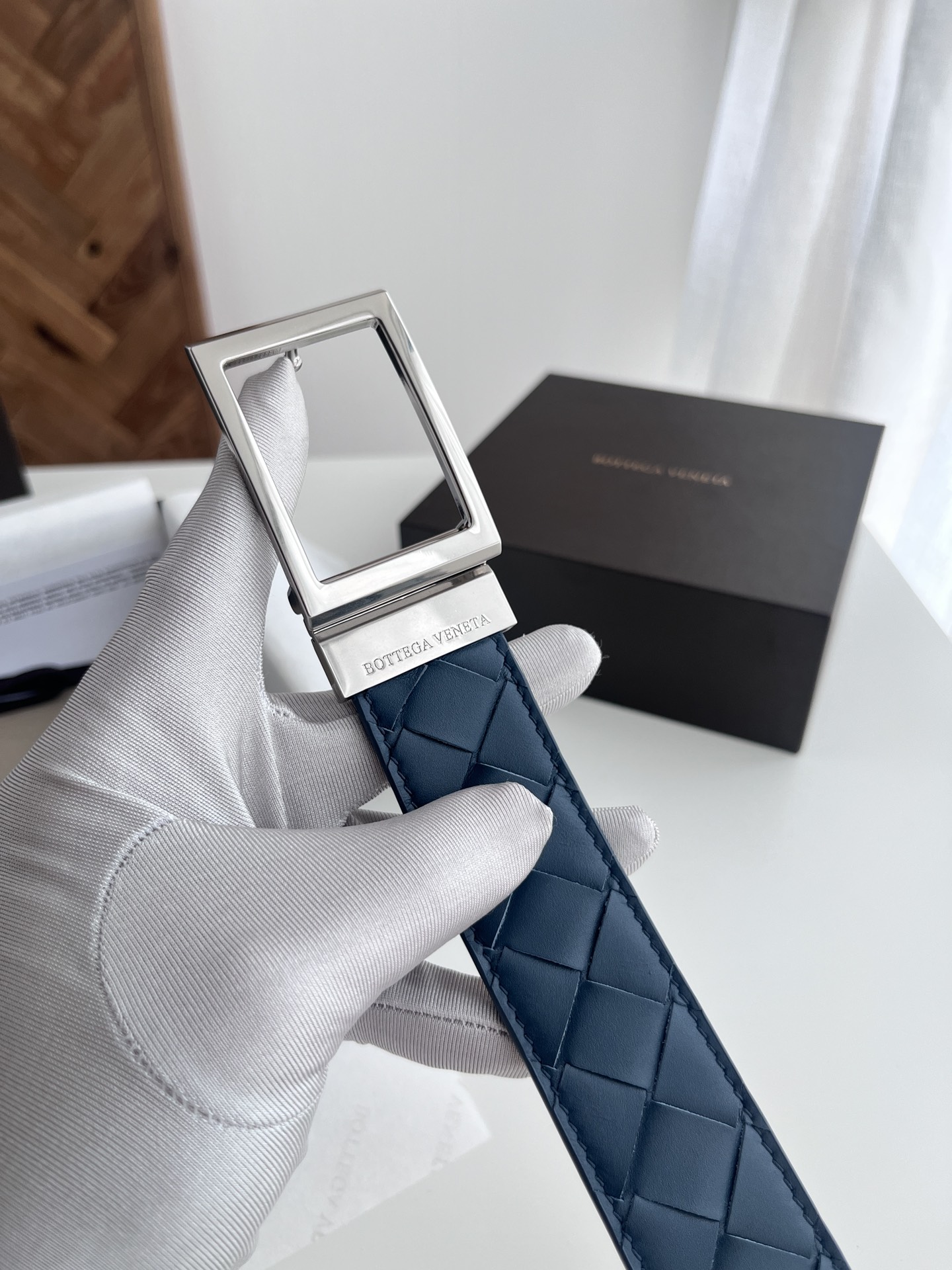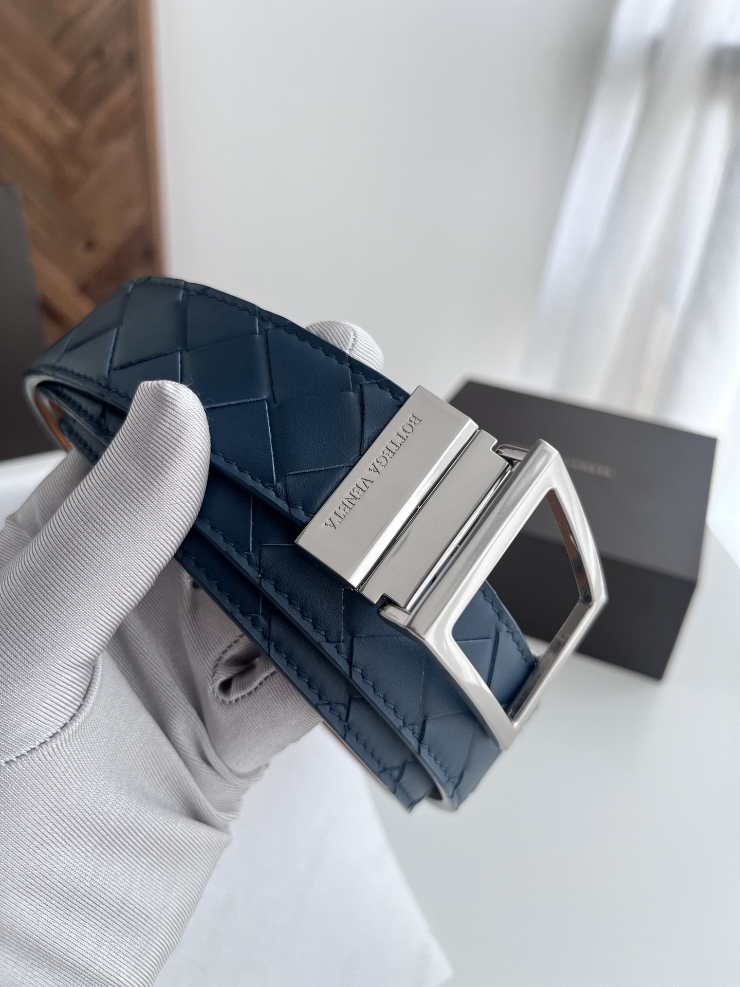 Bv latest men's woven belt double-sided use pure handmade intreccio large grid weaving double-sided Italian calfskin with slightly retro silver rotating buckle front has logo width 35MM color: space blue plus golden brown