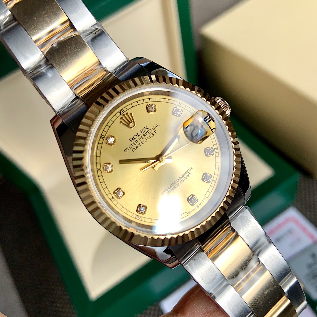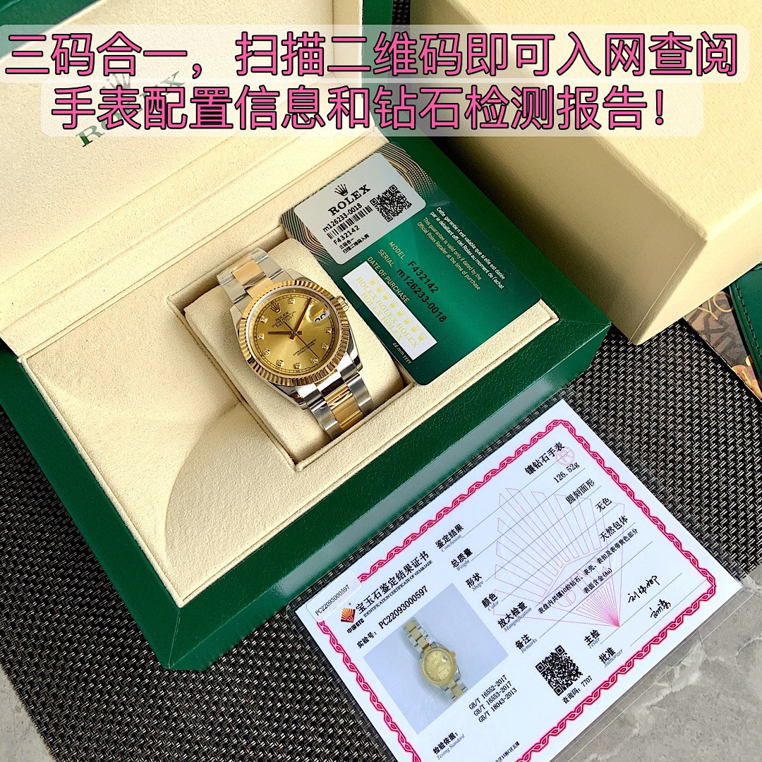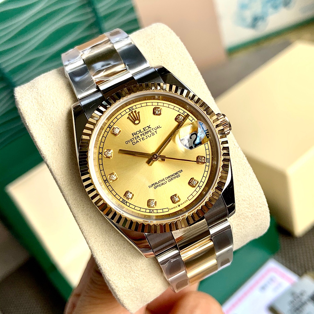 ROLEX - Rolex Datejust! 36mm latest model. Genuine 18K wrapped real gold, never worry about fading! Dial set with 10 natural real diamond hour markers! Comes with GTC China authoritative certification, 100% real gold verifiable and queryable! Three codes unified, scan the QR code to access online and view watch configuration information and real diamond inspection report! The Rolex Datejust series is a model of classic watches, timeless, a classic among classics. Equipped with Swiss SW200 movement, lifetime warranty! Case made from Rolex's unique Rolesor (combination of 904L stainless steel and 18K yellow gold) material. Crown uses the Triplock winding crown, the Triplock winding crown can be said to be a triple waterproof system specifically developed by Rolex for the Submariner type. The Triplock device consists of 10 different components, after configuration simply screw down to make the Oyster case completely sealed, with robust protection comparable to a submarine hatch. Bracelet made from Rolesor material, extremely sturdy and durable, metal brush design highlights a strong metallic texture! Ergonomically designed lugs and bracelet integrate perfectly into one, very comfortable to wear. Rolex's patented Glidelock clasp, the benefit of this clasp is that divers, even wearing a wetsuit, can easily adjust the bracelet without any tools; the sturdy toothed component under the clasp can extend the bracelet by 2mm per section, up to 20mm. Sapphire crystal, super strong luminescence, case and bracelet workmanship and polishing are very精细,处处彰显细节成就的经典! Comes with full set of top-tier packaging!