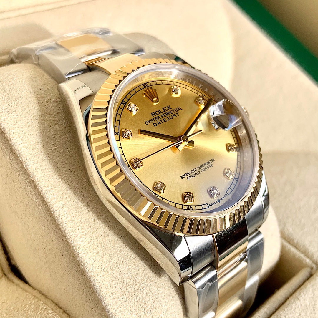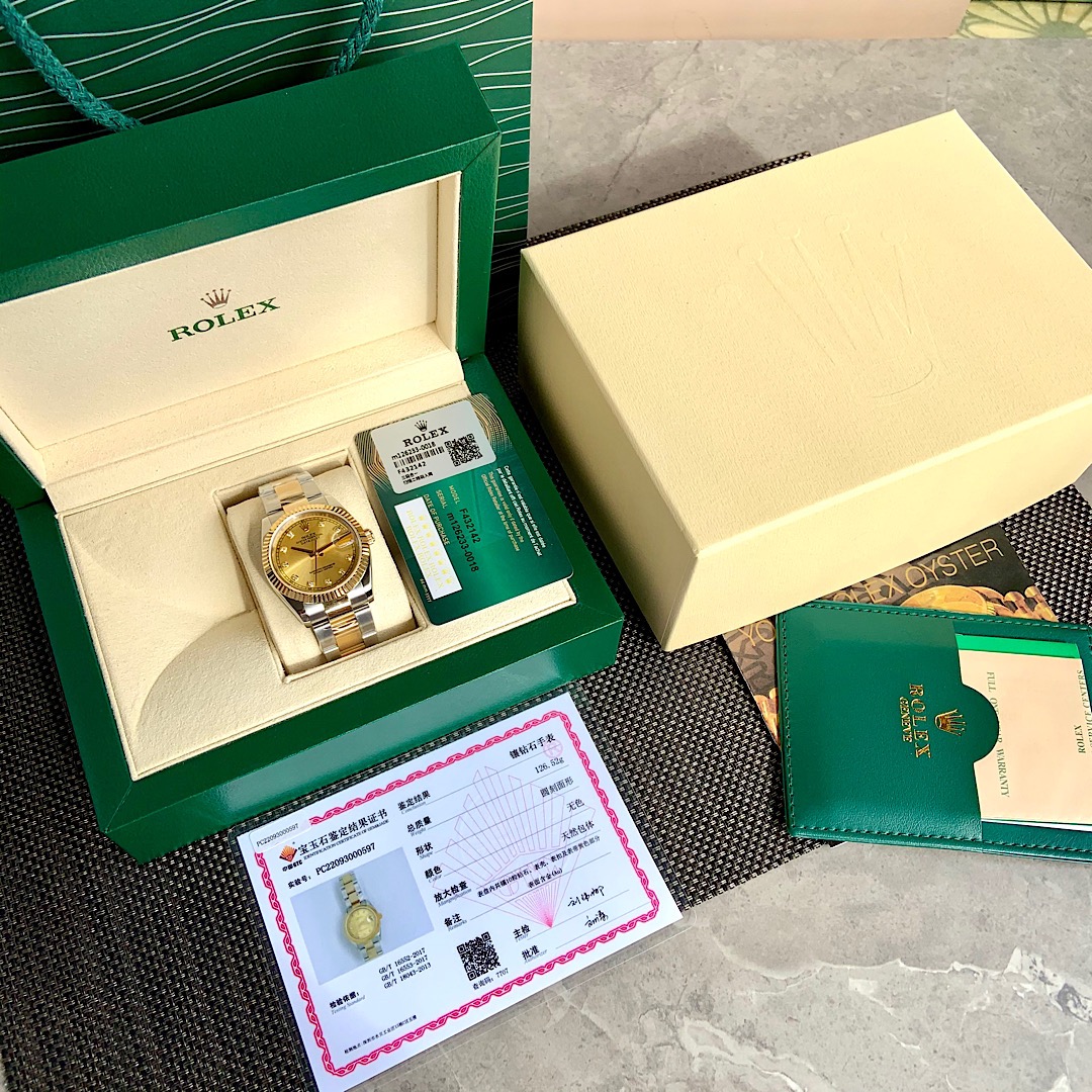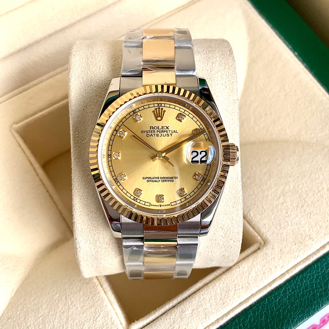 ROLEX - Rolex Datejust! 36mm latest model. Genuine 18K wrapped real gold, never worry about fading! Dial set with 10 natural real diamond hour markers! Comes with GTC China authoritative certification, 100% real gold verifiable and queryable! Three codes unified, scan the QR code to access online and view watch configuration information and real diamond inspection report! The Rolex Datejust series is a model of classic watches, timeless, a classic among classics. Equipped with Swiss SW200 movement, lifetime warranty! Case made from Rolex's unique Rolesor (combination of 904L stainless steel and 18K yellow gold) material. Crown uses the Triplock winding crown, the Triplock winding crown can be said to be a triple waterproof system specifically developed by Rolex for the Submariner type. The Triplock device consists of 10 different components, after configuration simply screw down to make the Oyster case completely sealed, with robust protection comparable to a submarine hatch. Bracelet made from Rolesor material, extremely sturdy and durable, metal brush design highlights a strong metallic texture! Ergonomically designed lugs and bracelet integrate perfectly into one, very comfortable to wear. Rolex's patented Glidelock clasp, the benefit of this clasp is that divers, even wearing a wetsuit, can easily adjust the bracelet without any tools; the sturdy toothed component under the clasp can extend the bracelet by 2mm per section, up to 20mm. Sapphire crystal, super strong luminescence, case and bracelet workmanship and polishing are very精细,处处彰显细节成就的经典! Comes with full set of top-tier packaging!
