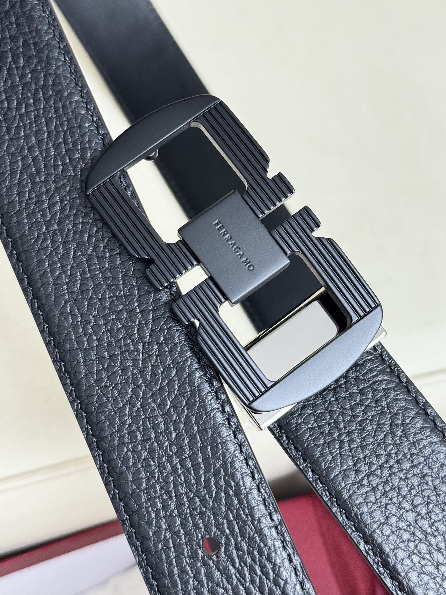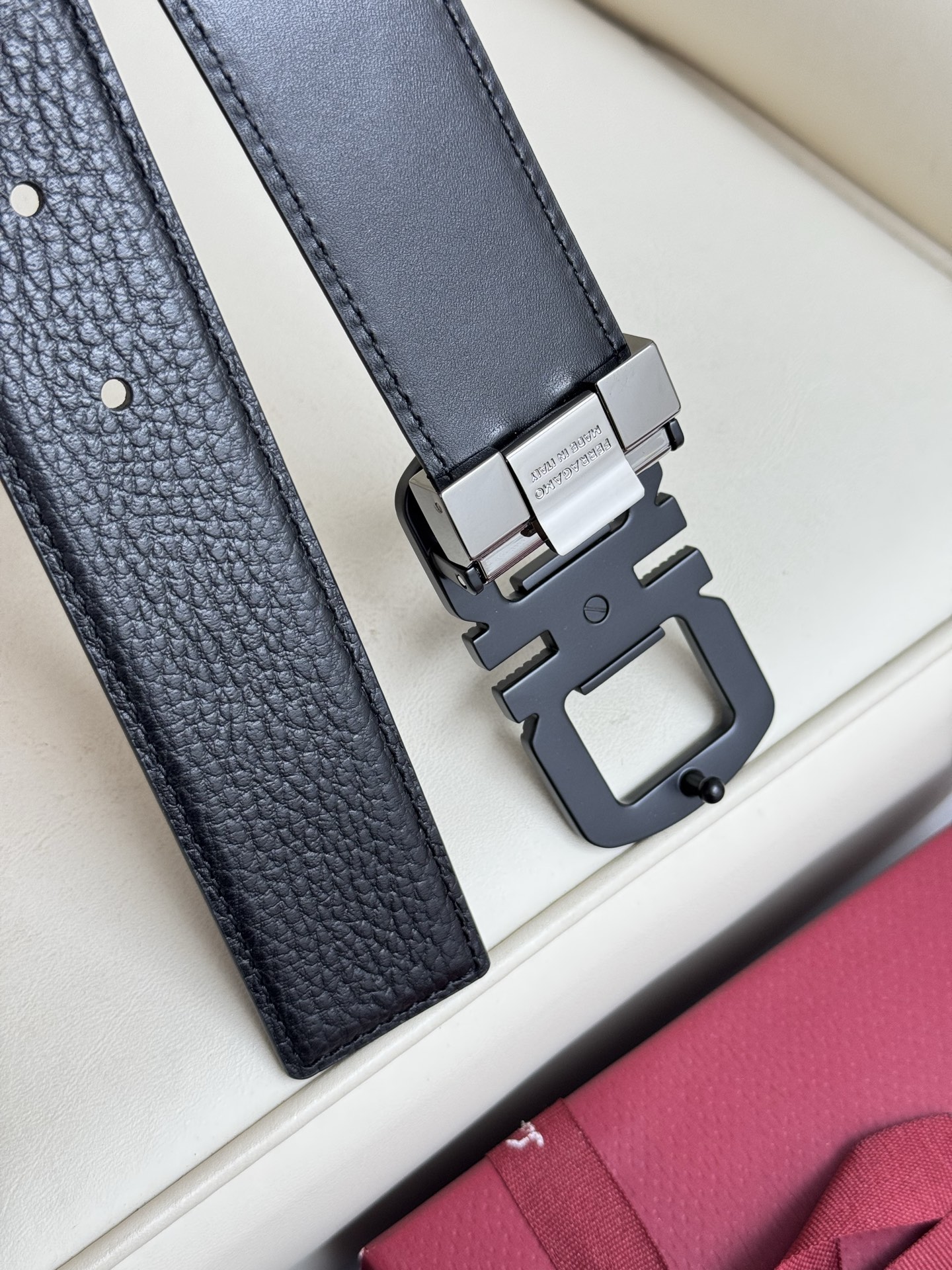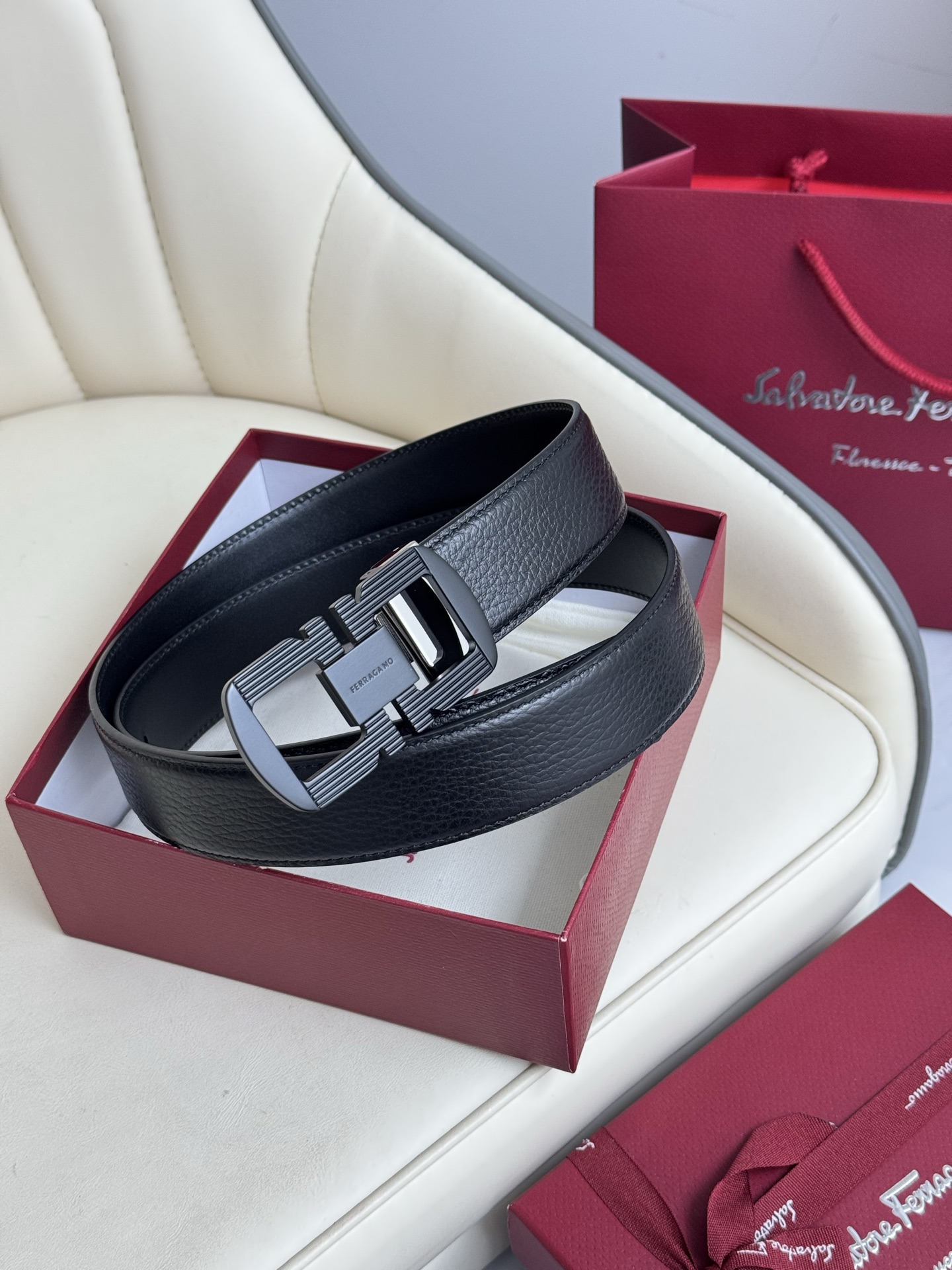 Home • Belt • Ferragamo double-sided genuine leather belt with brass buckle, versatile style. Complete set, 3.5cm width.