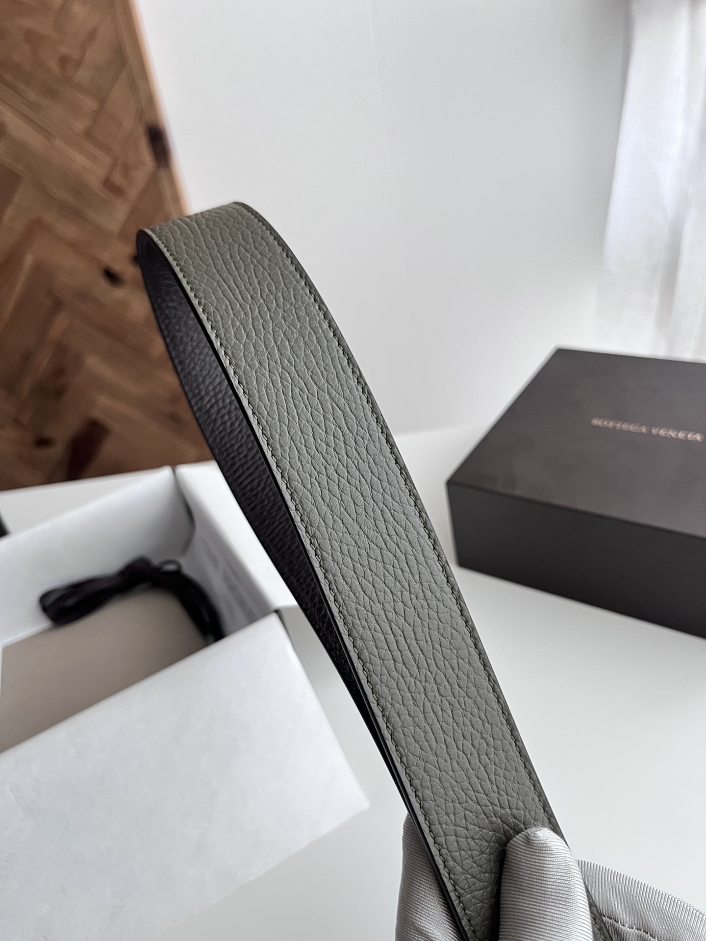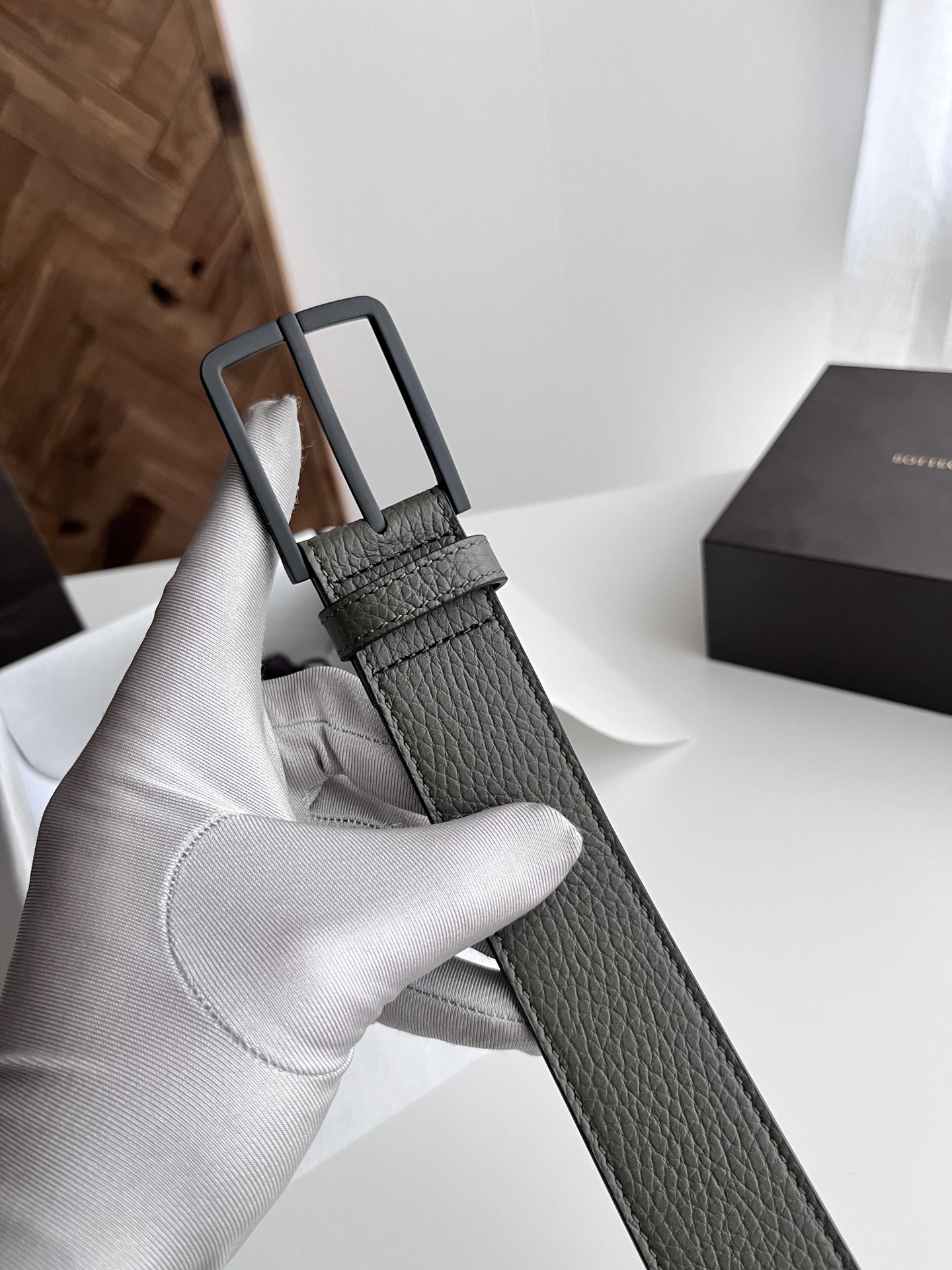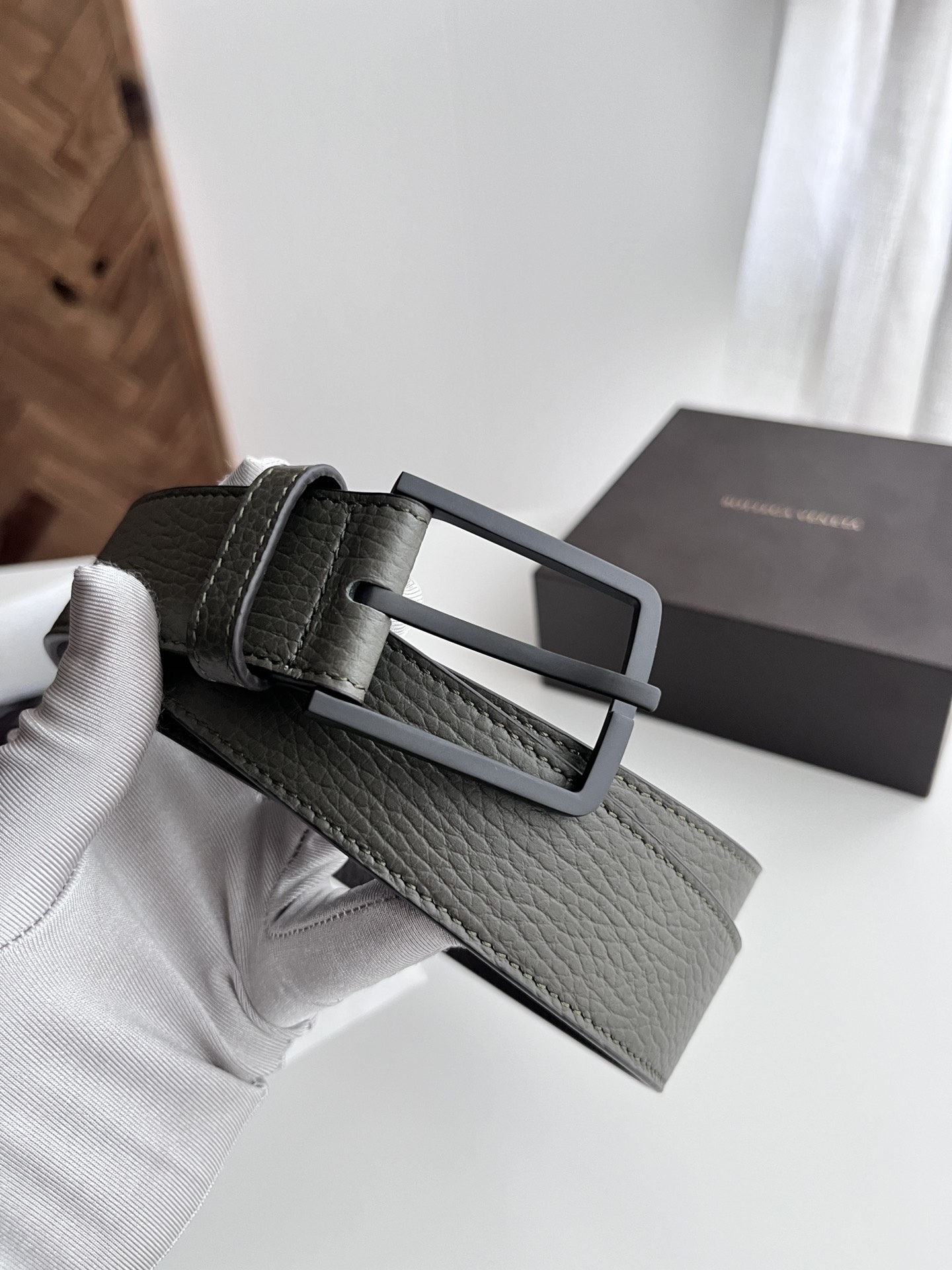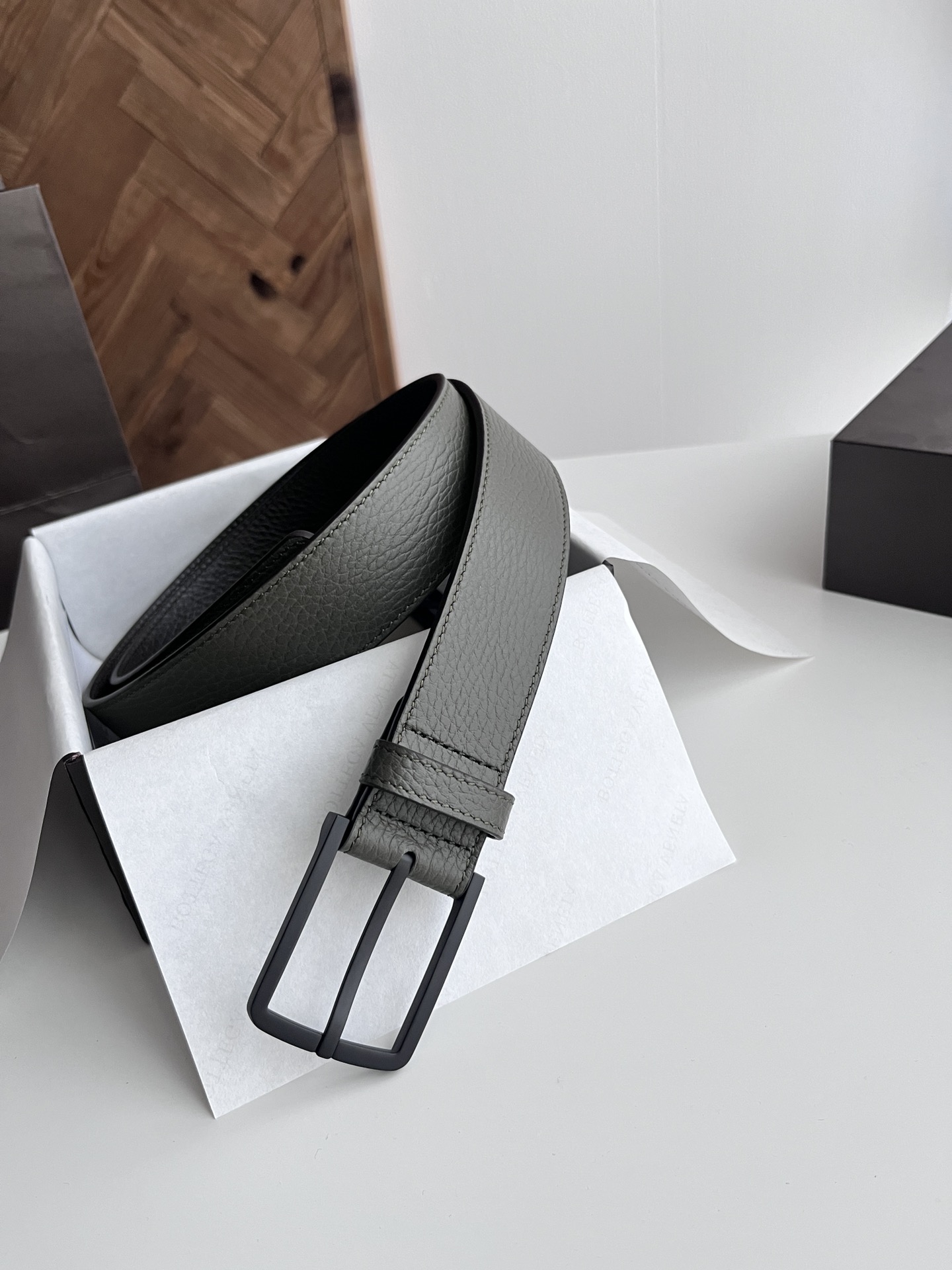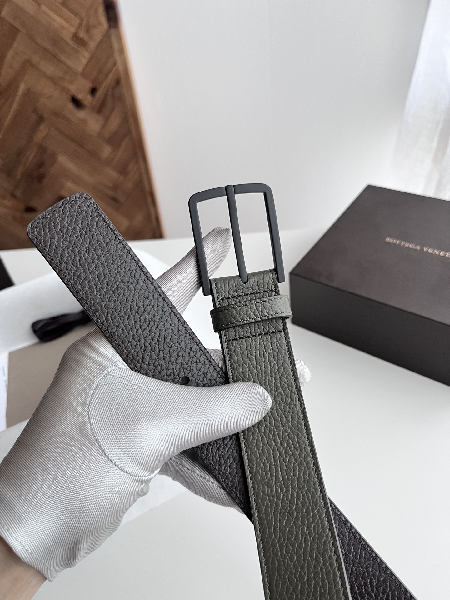 Bv 2024 latest men's flat belt double-sided Italian pebble grain calfskin with vacuum gunmetal pin buckle side with logo width 35MM color: military green + coffee