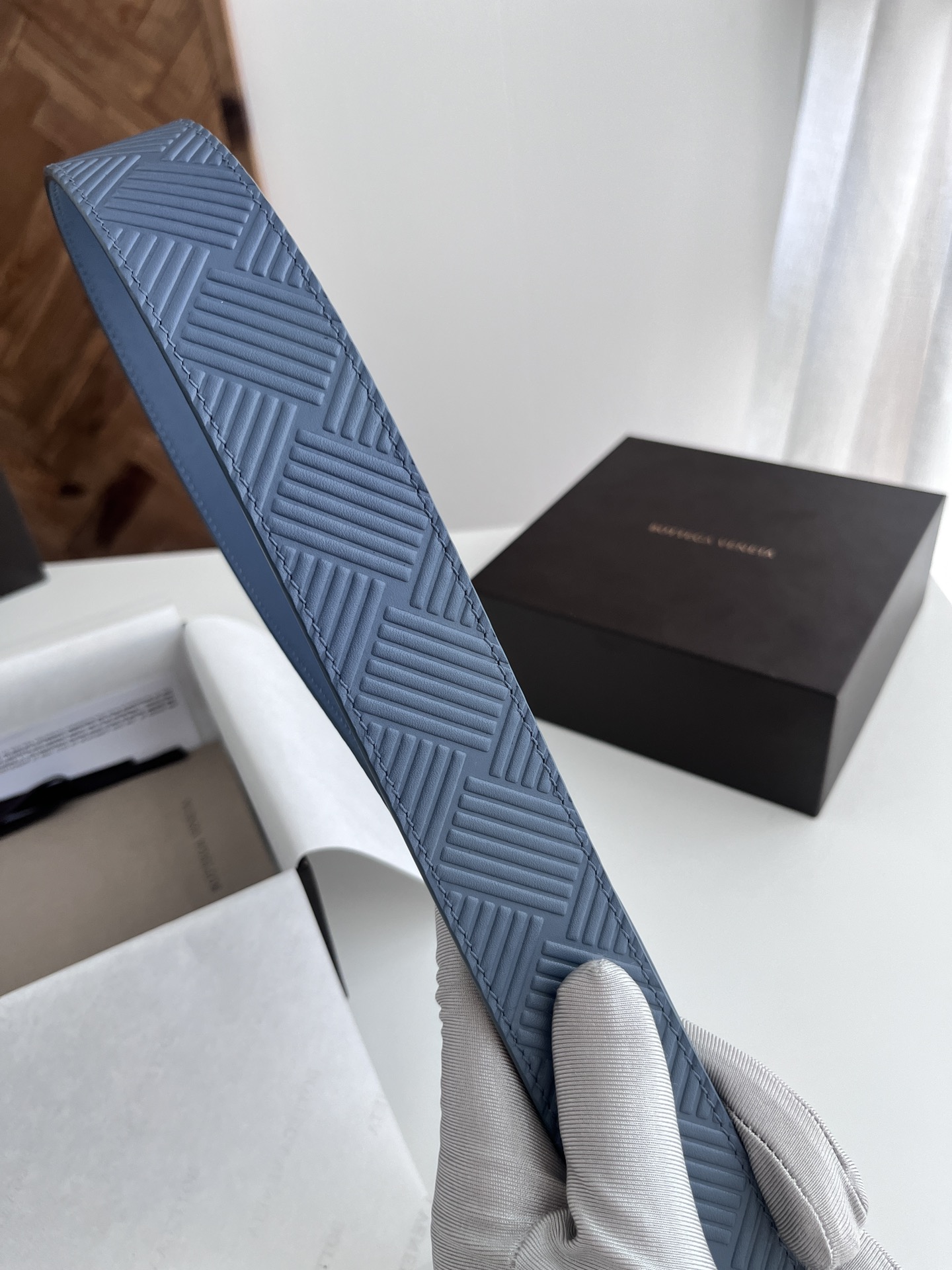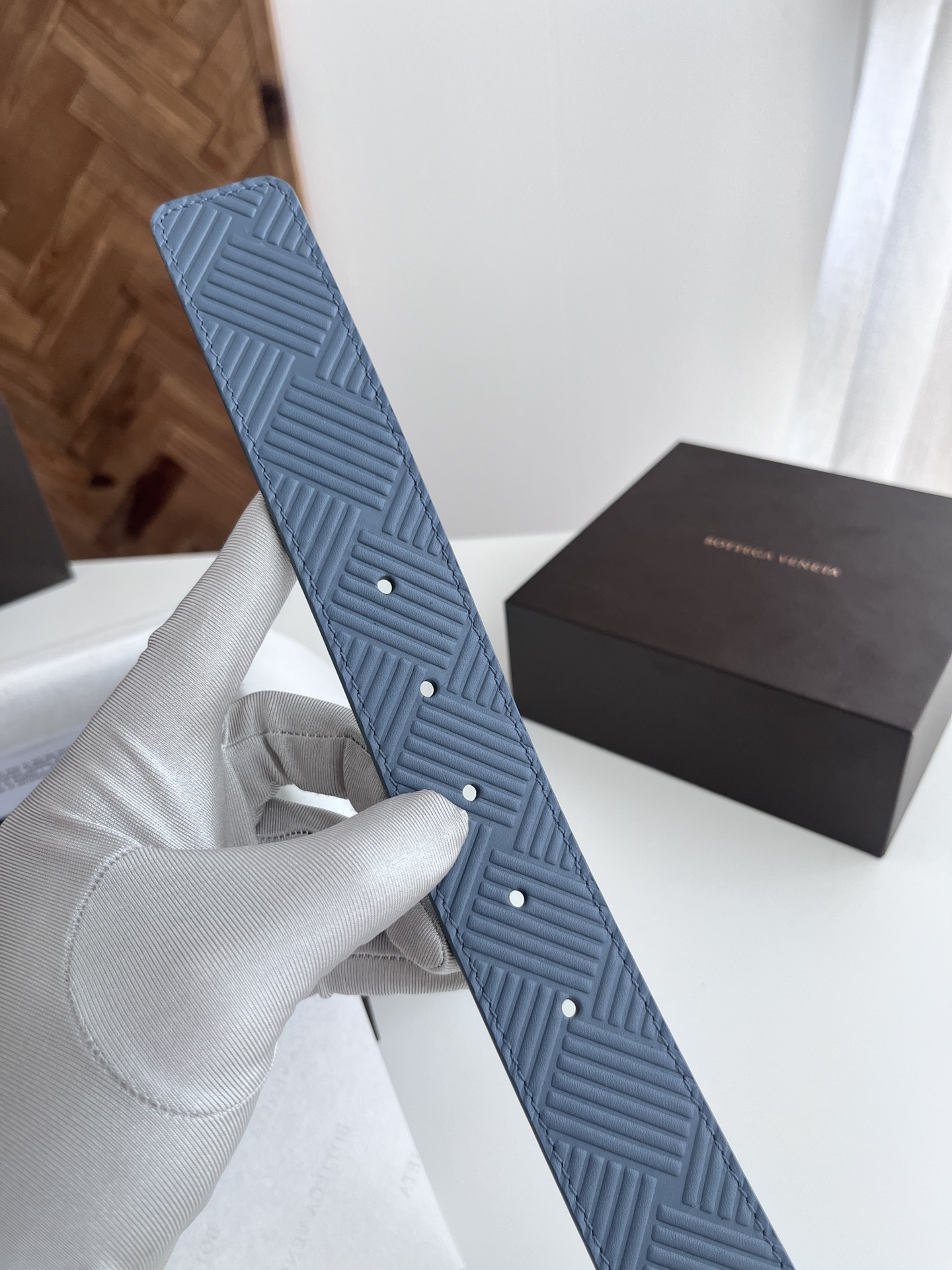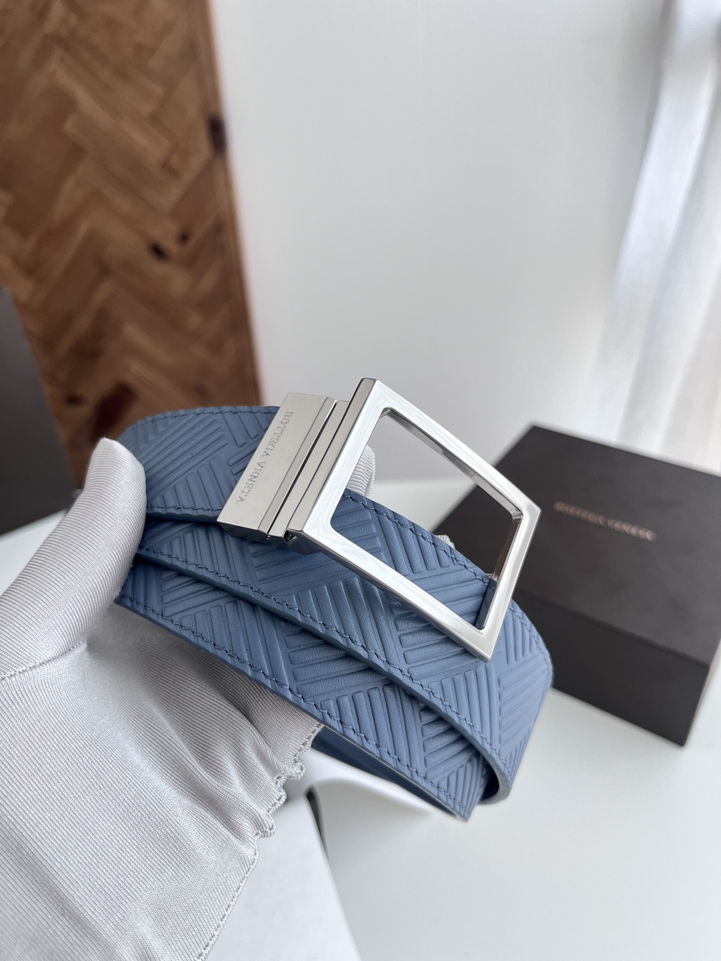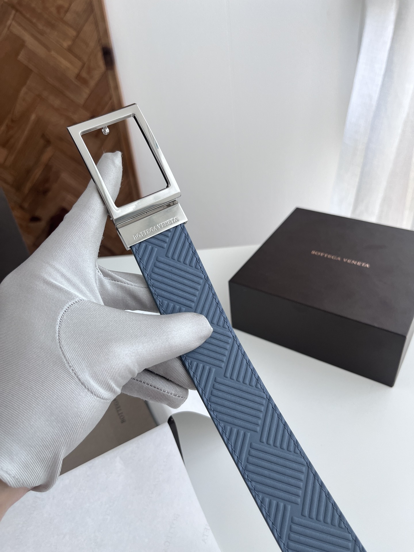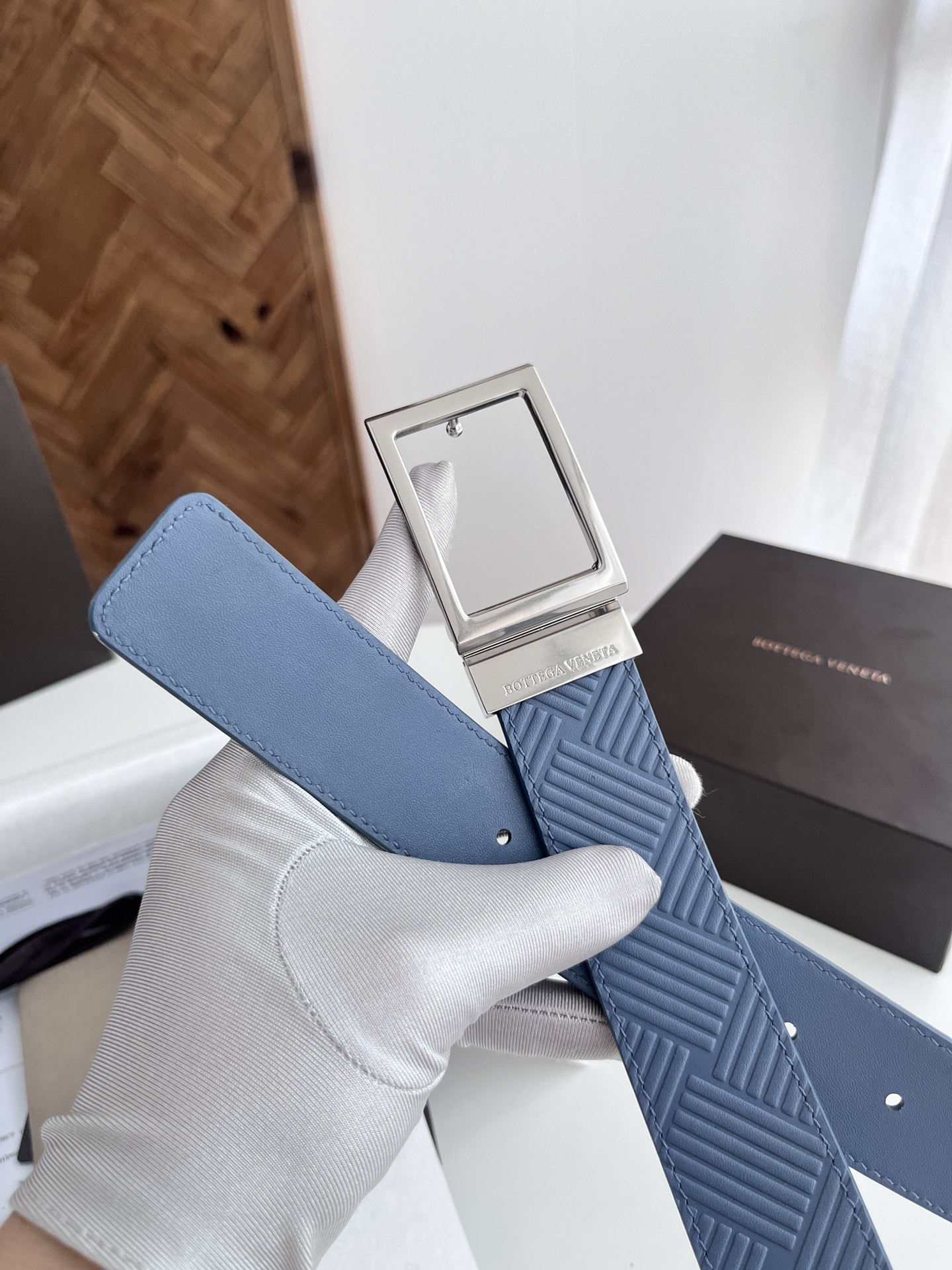 BV 2024 New Men's Reversible Belt Large Weave Embossing Craft Double-sided Italian Calfskin Paired with Slightly Retro Silver Square Rotating Buckle Front with Logo Width 3.5CM Color: Light Blue