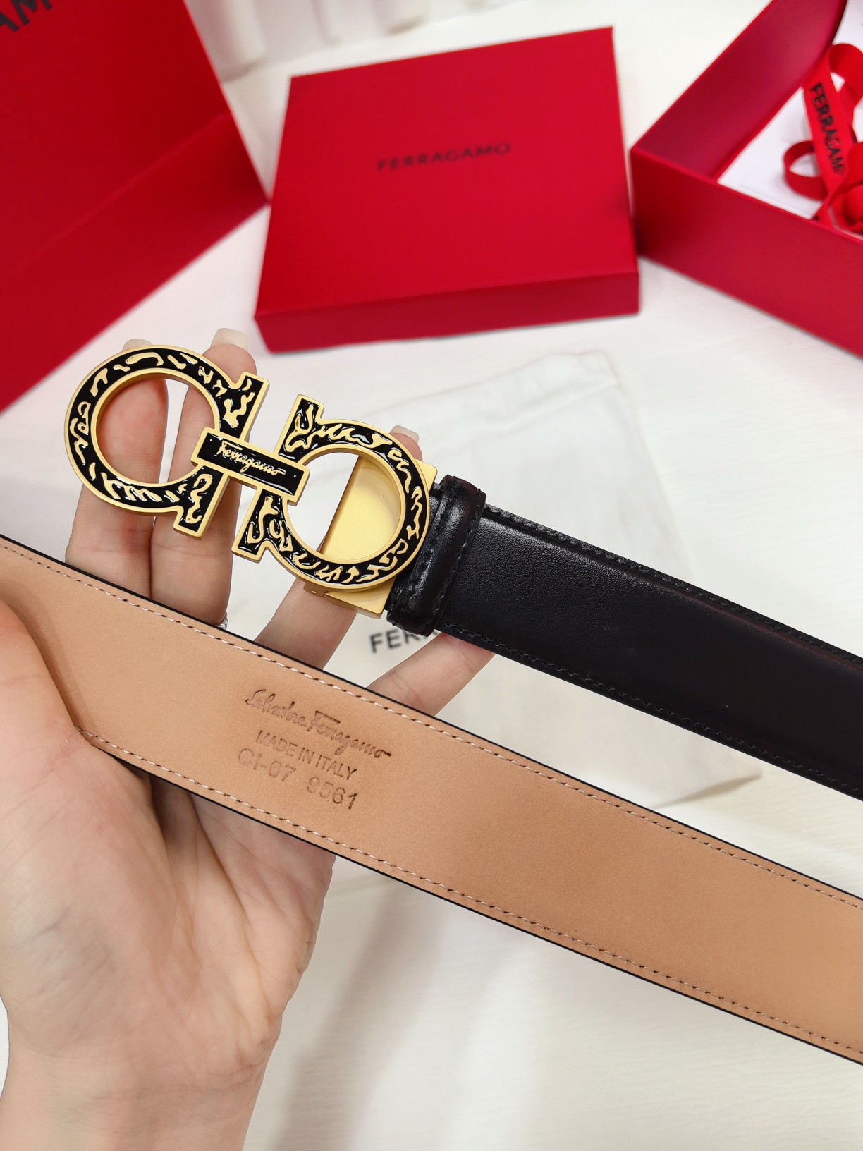 This double-sided belt features an elegant style with a dual-finish design, flexibly adapting to various looks while maintaining a sophisticated tone at all times, making it a staple accessory for the modern refined gentleman. The natural grained calfskin and hammered calfskin are spliced together, creating a bold and eye-catching edge effect. The Gancini buckle is paired with contrasting trim, and the connection point is adorned with a logo. The adjustable length allows for a tailored, slimming effect. The belt can be trimmed or additional eyelets can be added to achieve a tight or loose fit, with a width of 3.5.