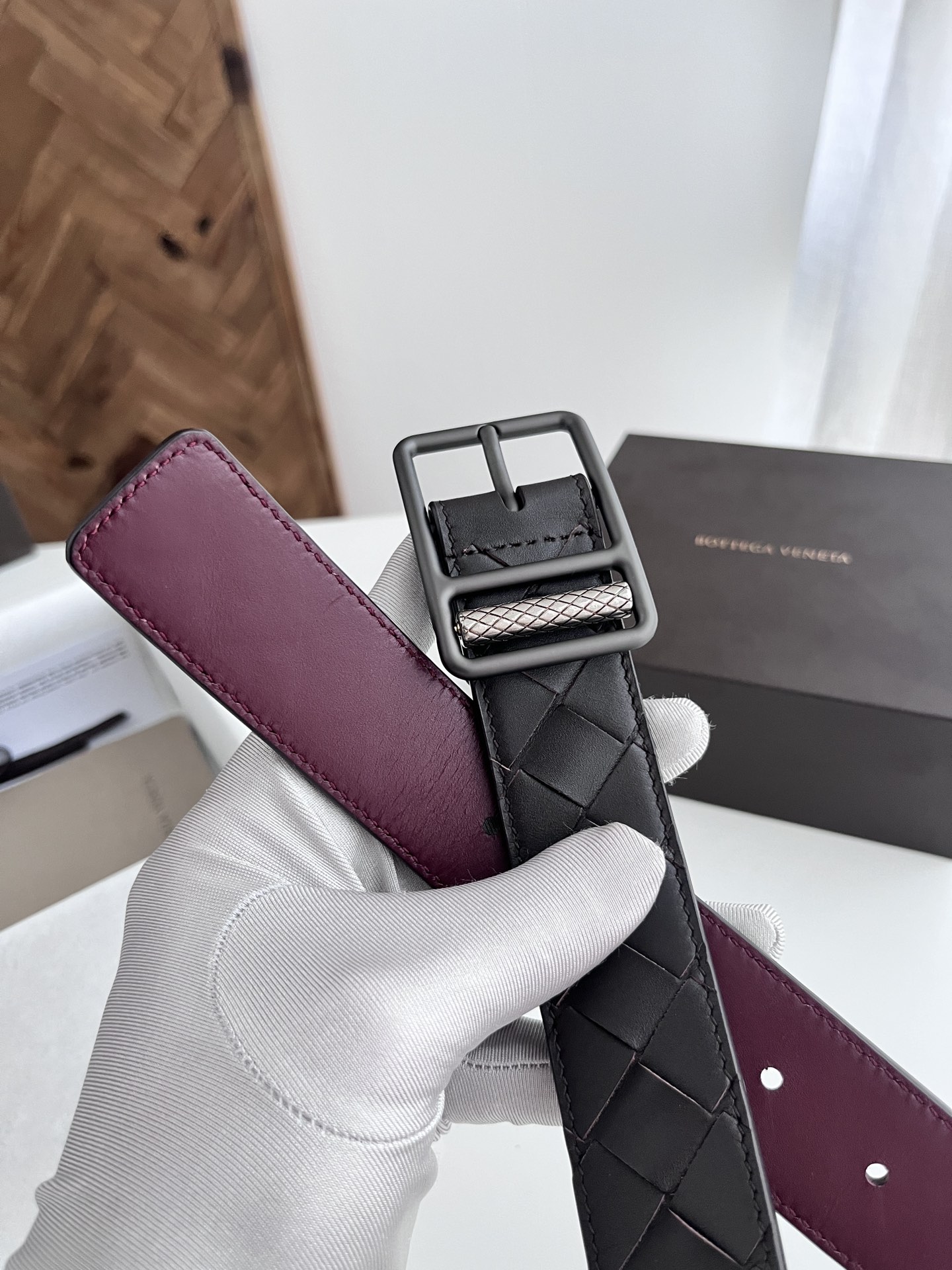 BV 2024 New Men's Belt Fully Handcrafted Large Grid Intrecciato Piccolo Woven Italian Calfskin Paired with Rotary Vacuum Gun Metal Pin Buckle Belt Width 3.5cm Color: Coffee Color + Bordeaux Red