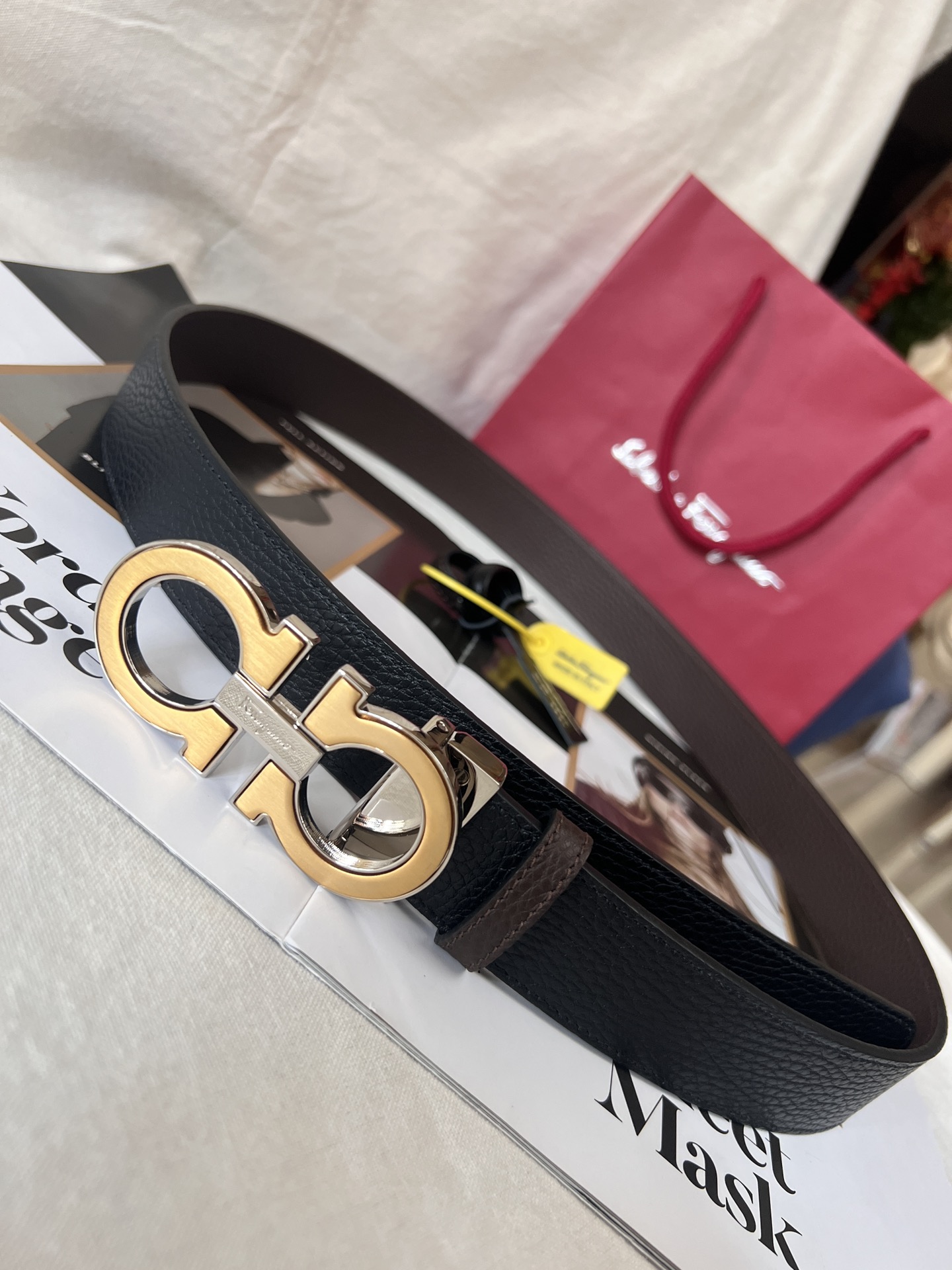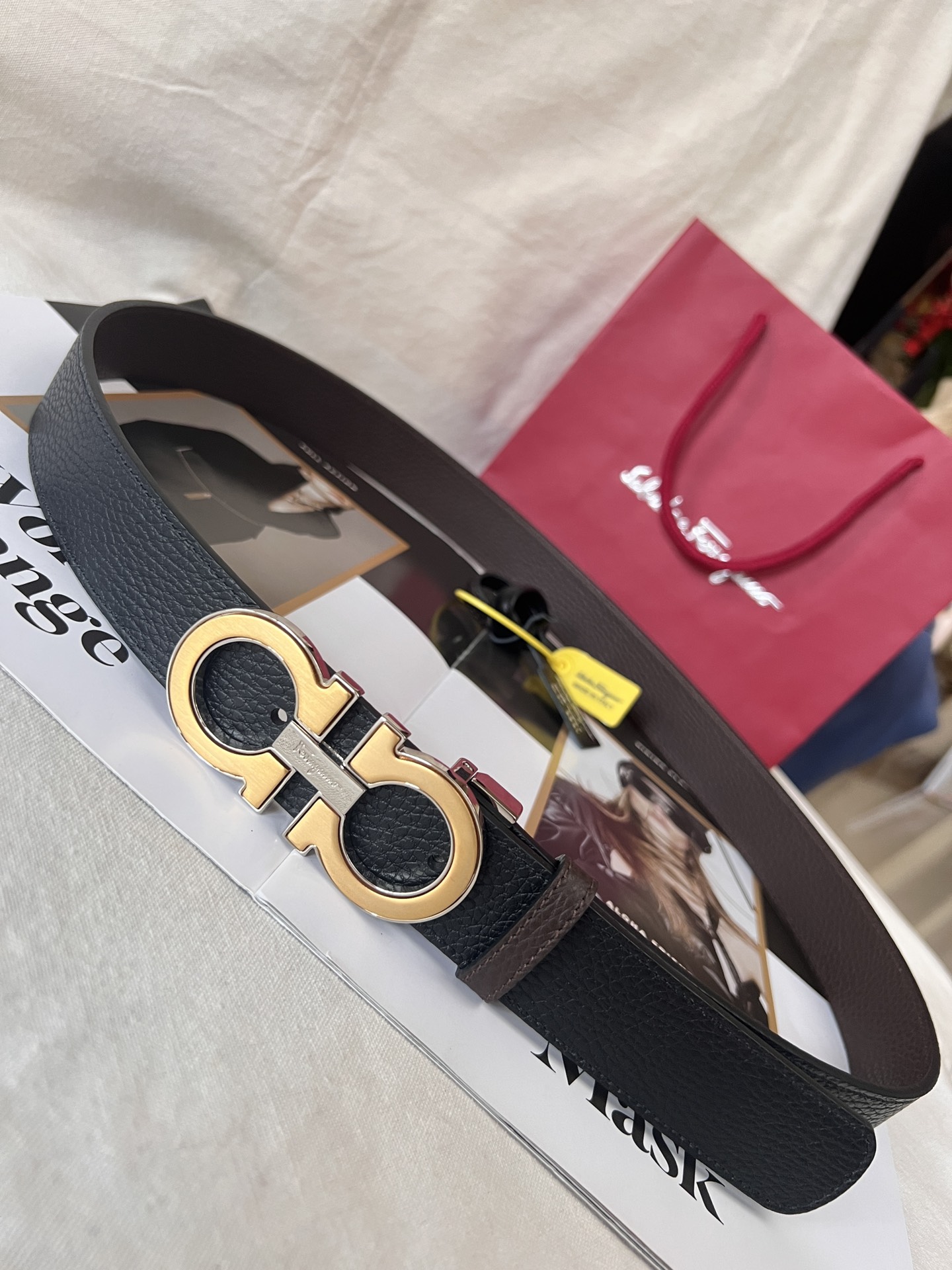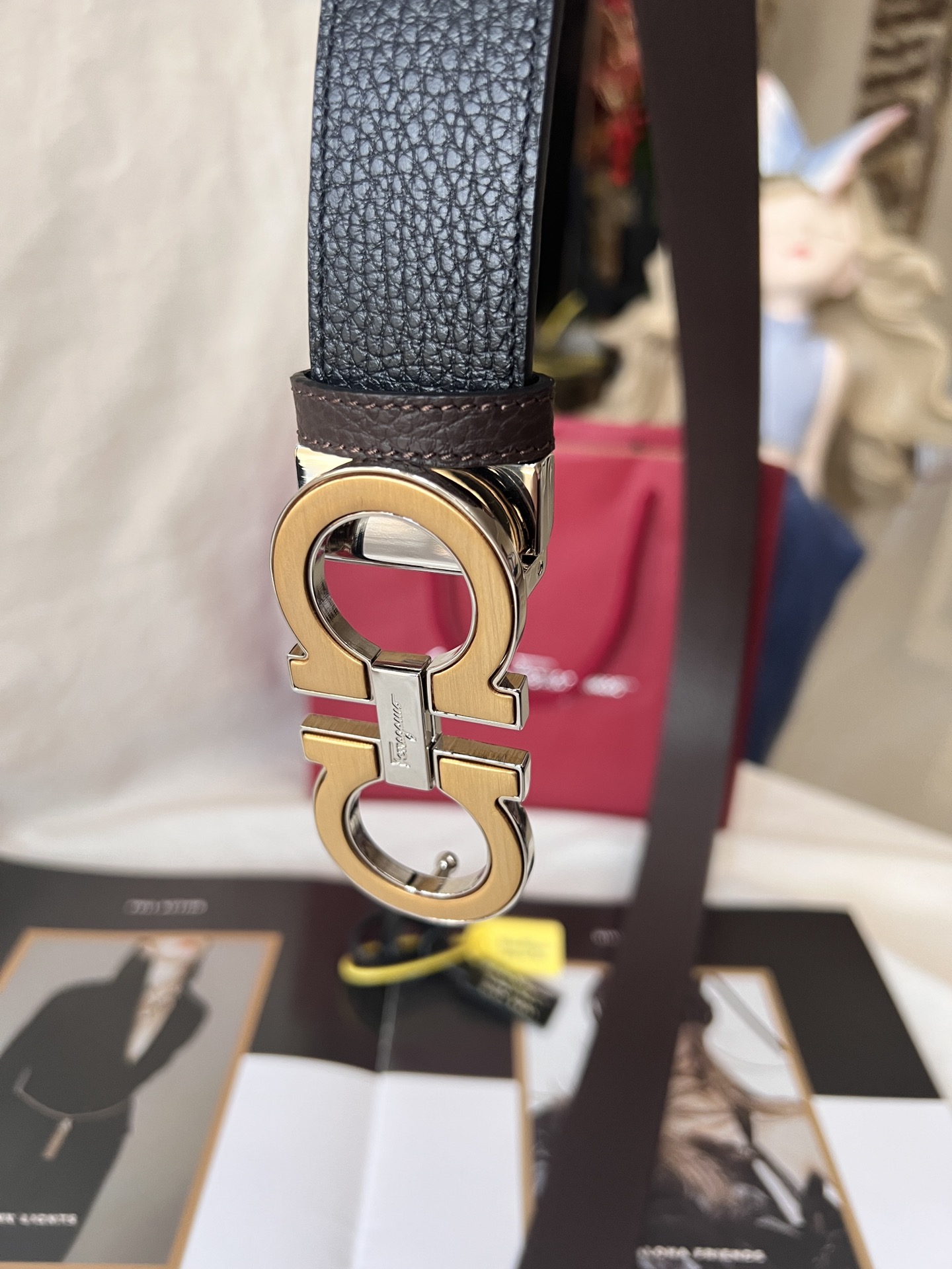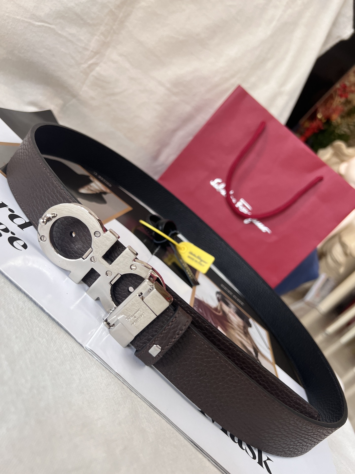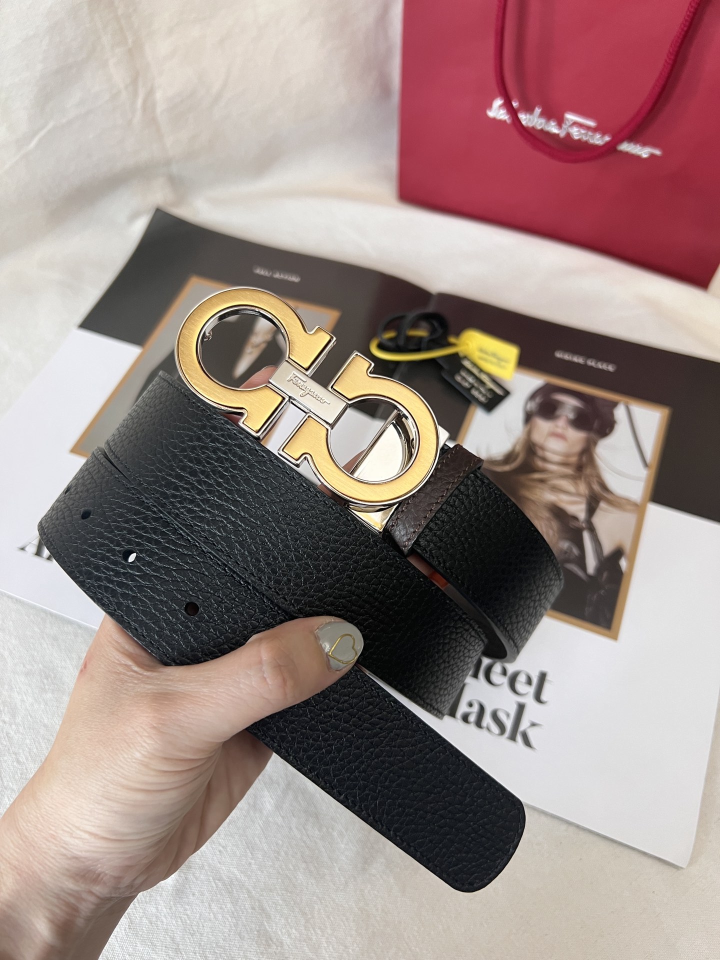 This belt has a striking style, elegant and luxurious, and is a classic brand item. Made of imported cowhide with embossed patterns, it features a ruthenium gray metal Gancini buckle. The style is exquisite and unique. This accessory has a double-sided design and can be adjusted to fit the waist.
