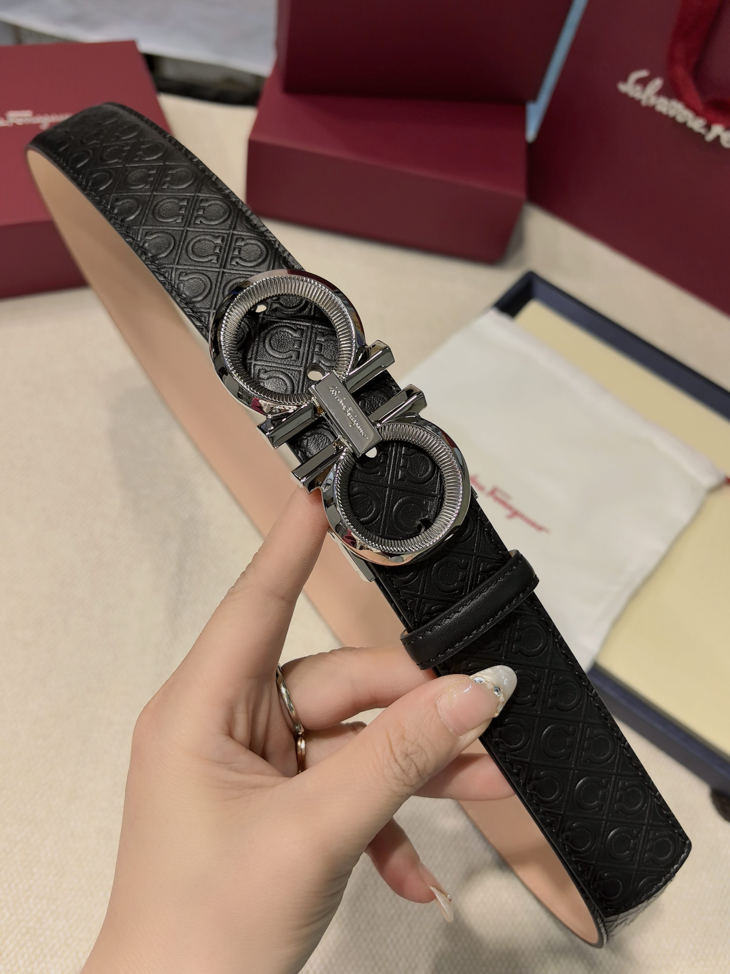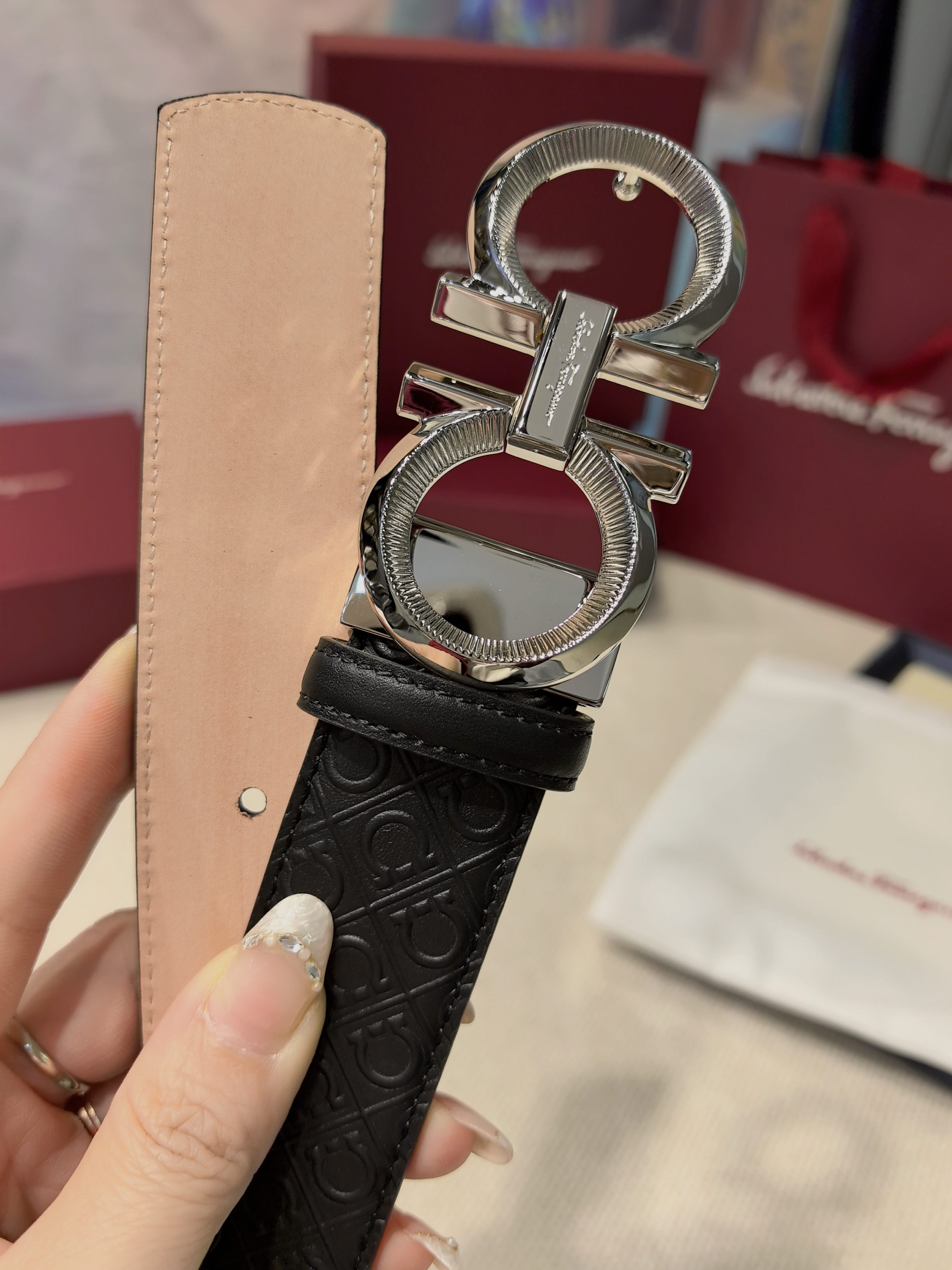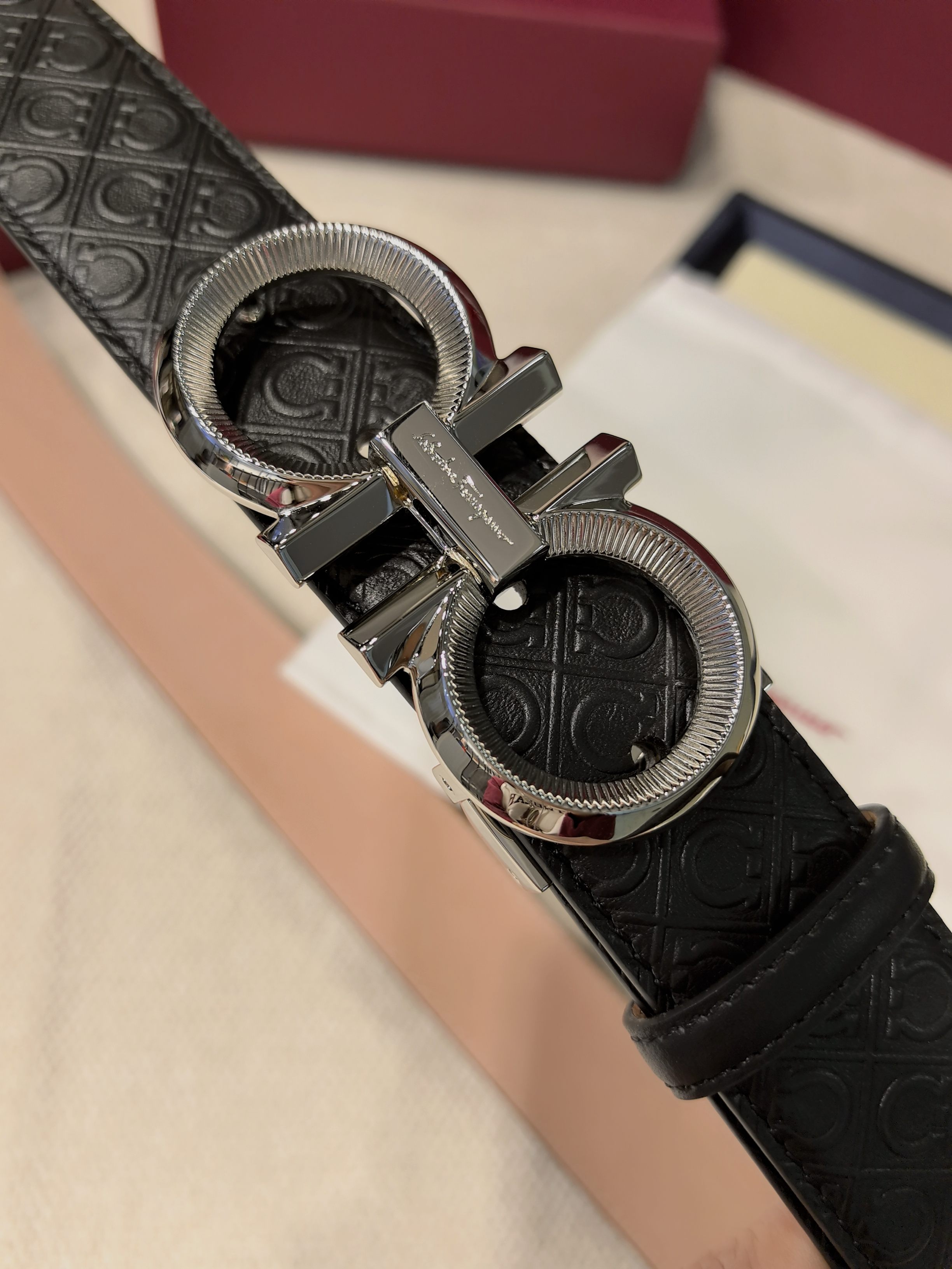 This belt is elegant and luxurious, a memorable Ferragamo classic. Made from natural textured calfskin, it features a clear grain finish. The ruthenium gray Gancini buckle complements the engraved logo. The adjustable length allows for a tailored, slim-fit effect. 3.5 wide