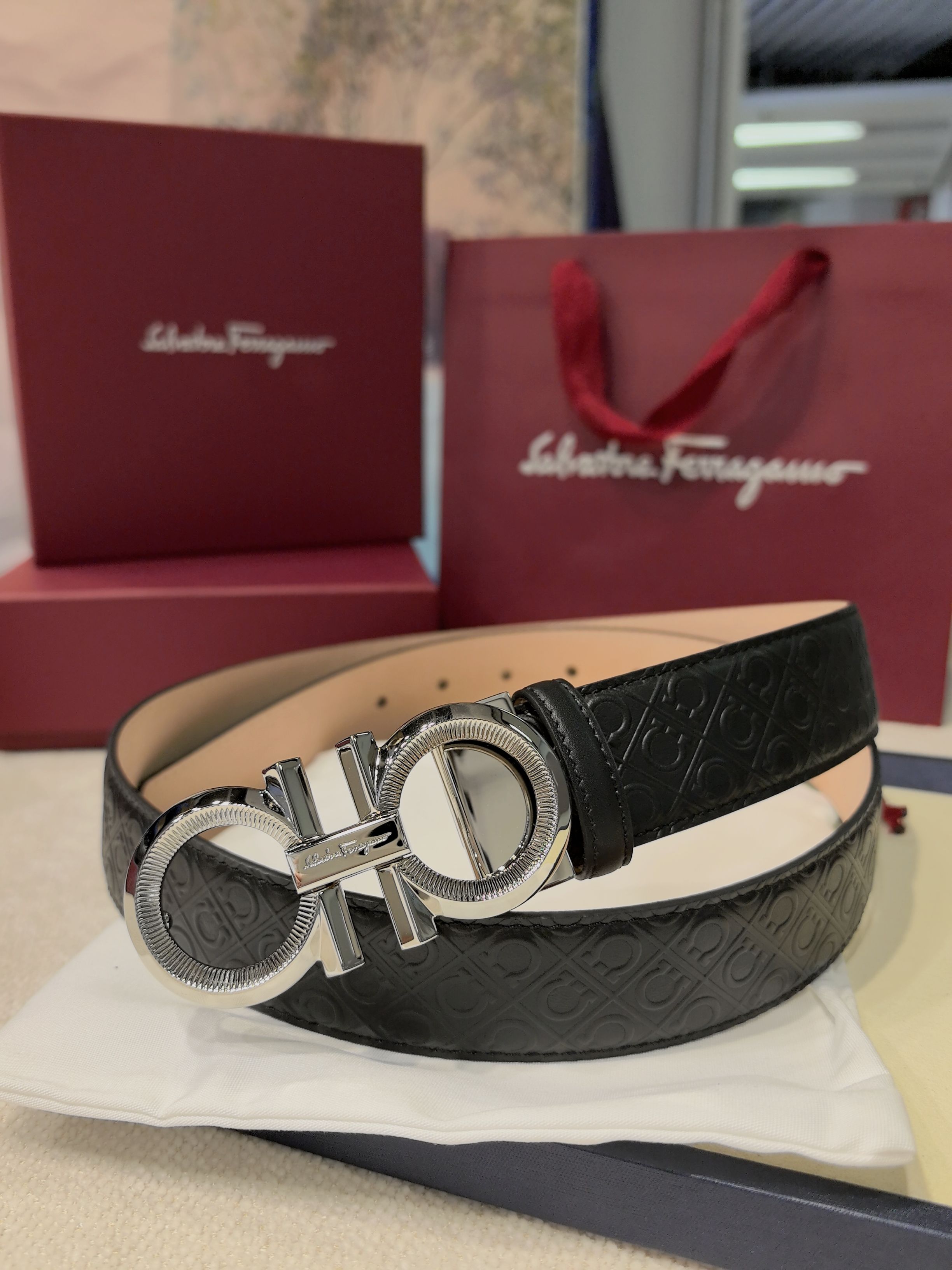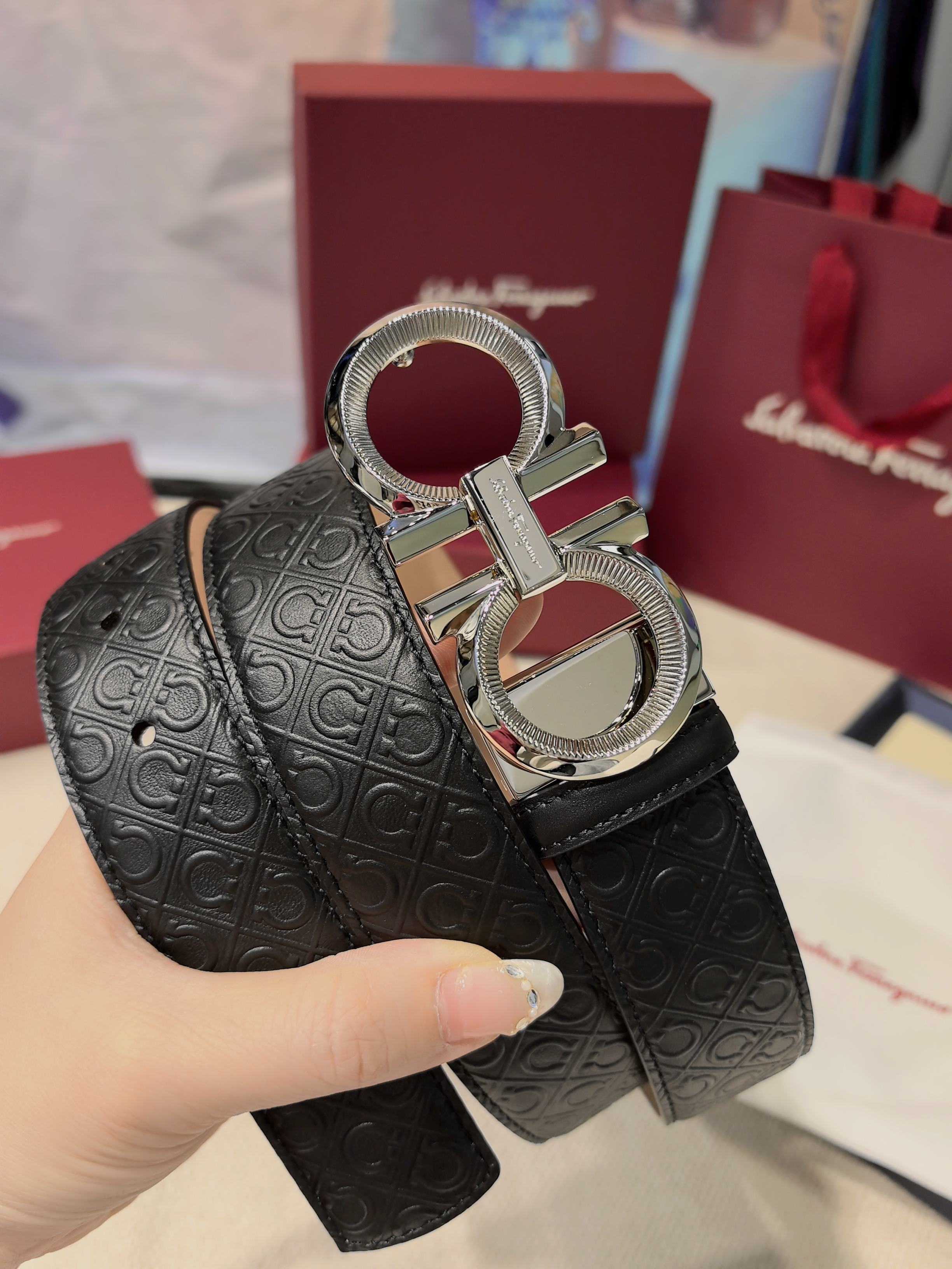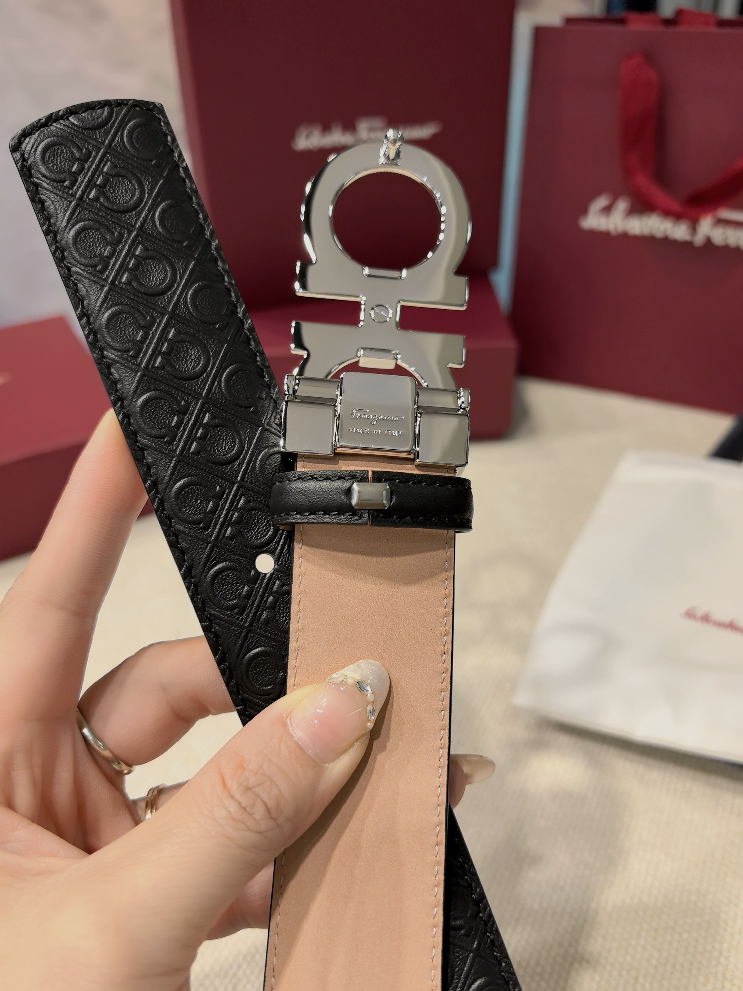 This belt is elegant and luxurious, a memorable Ferragamo classic. Made from natural textured calfskin, it features a clear grain finish. The ruthenium gray Gancini buckle complements the engraved logo. The adjustable length allows for a tailored, slim-fit effect. 3.5 wide