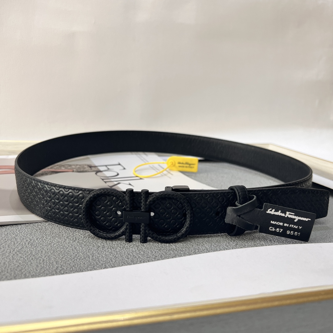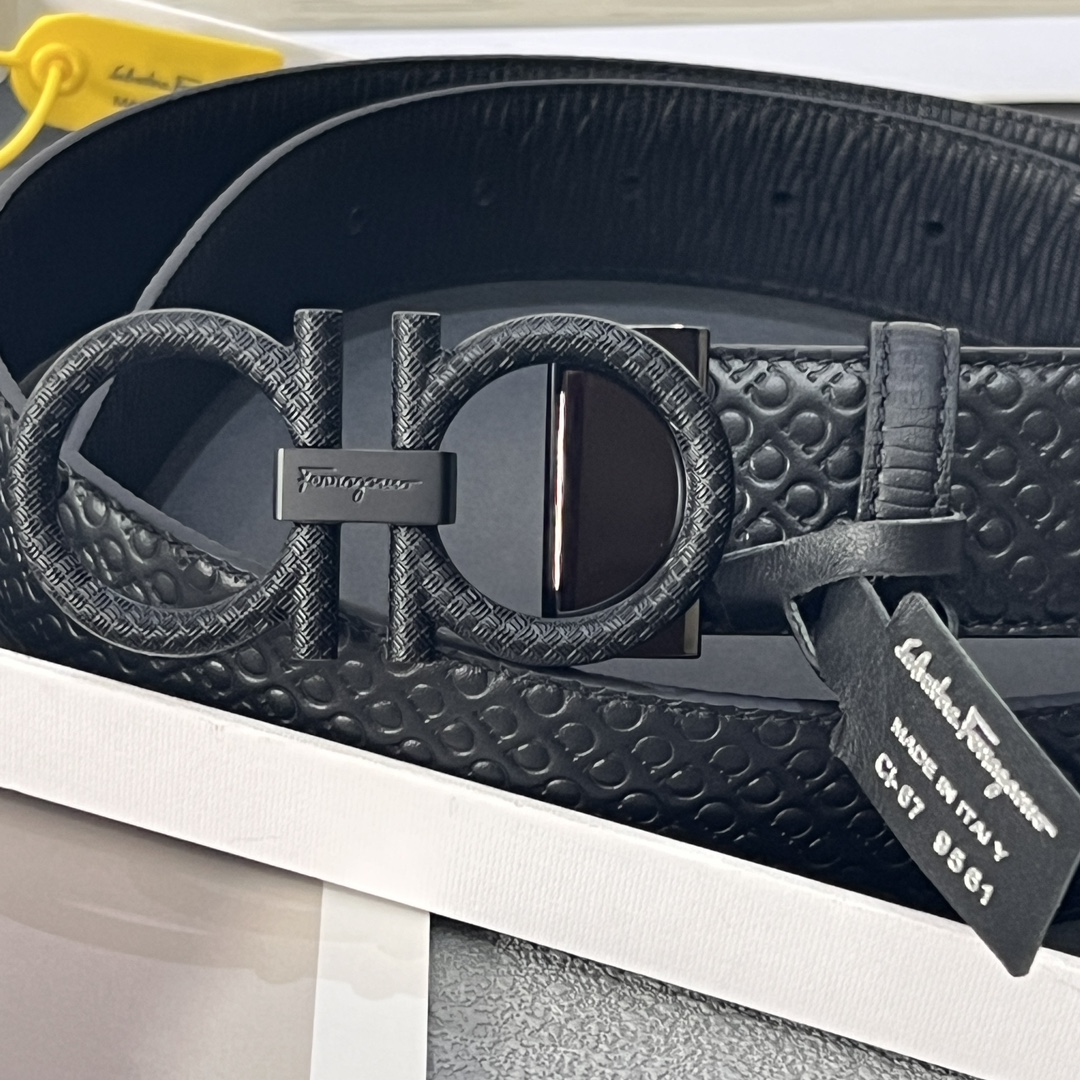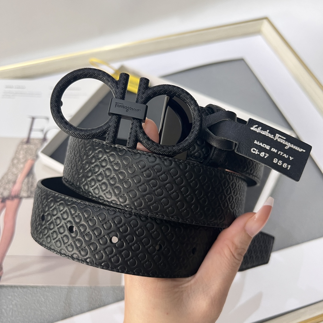 This belt has an elegant style, featuring a rectangular buckle adorned with a small Gancini. It is designed with two sides: one made of hammered texture material, and the other with an all-over Gancini embossed pattern as the base, exuding a classic charm in a low-key manner. The length is adjustable, achieving a tailored, slimming effect. 3.5 wide