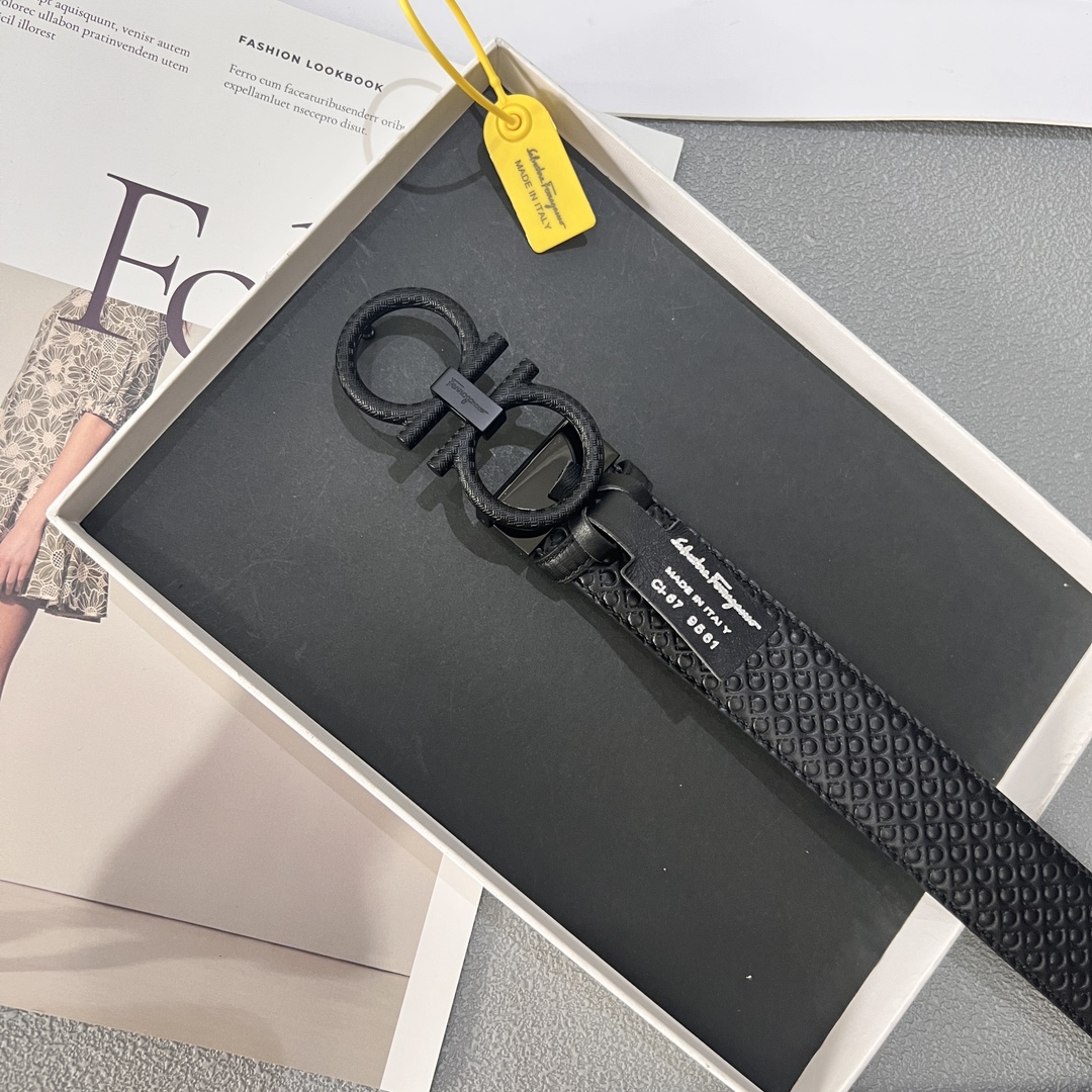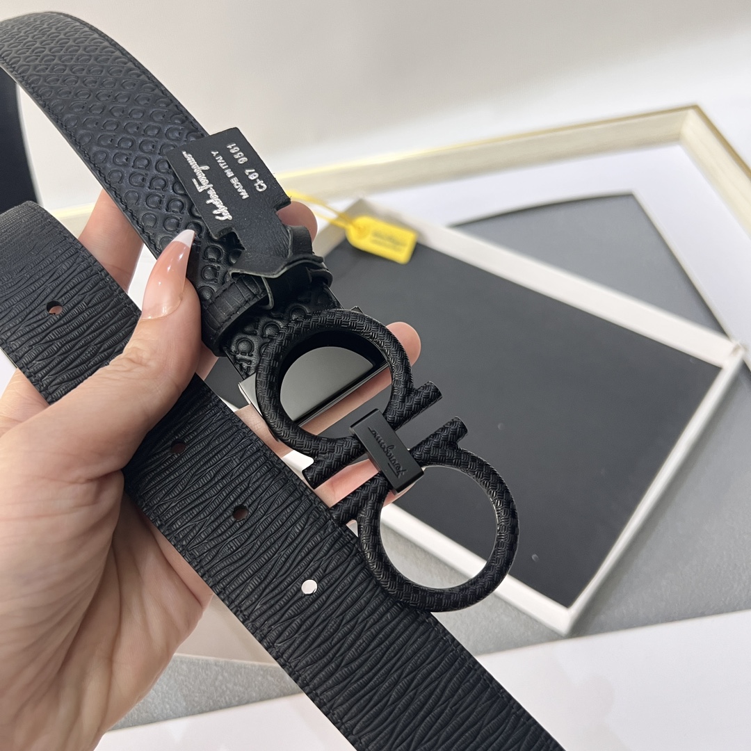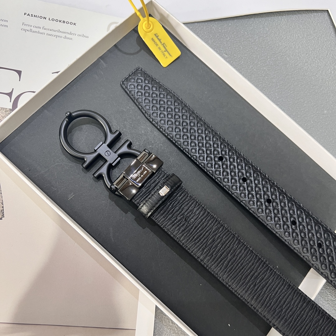 This belt has an elegant style, featuring a rectangular buckle adorned with a small Gancini. It is designed with two sides: one made of hammered texture material, and the other with an all-over Gancini embossed pattern as the base, exuding a classic charm in a low-key manner. The length is adjustable, achieving a tailored, slimming effect. 3.5 wide