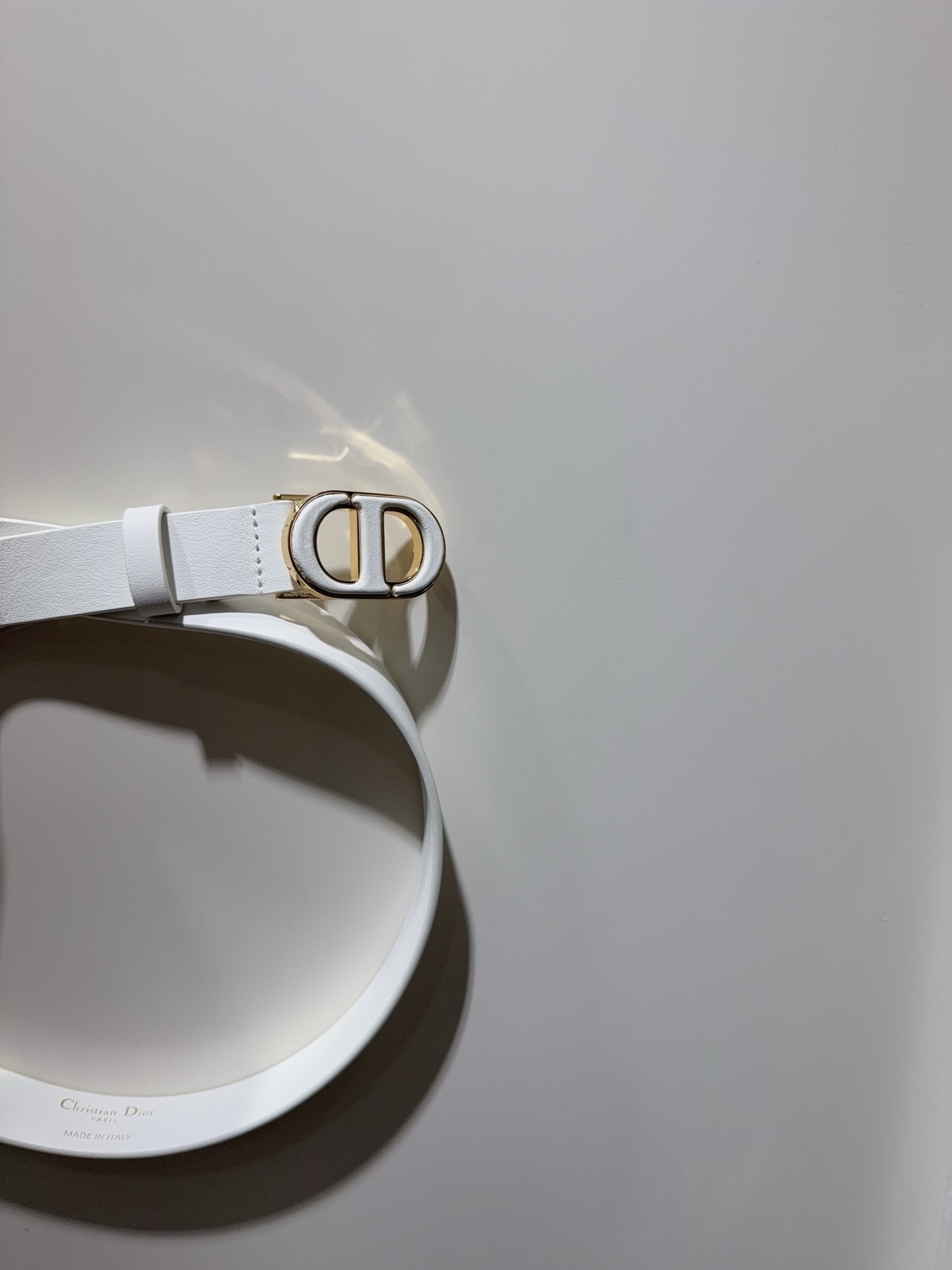 This 30Montaigne belt draws inspiration from the classic handbag of the same name, crafted from smooth calfskin and other materials. It features a classic CD buckle presented in lustrous vintage gold-finished metal and calfskin in the same tone, showcasing Di's exquisite craftsmanship. The style is fashionable and elegant, suitable for pairing with jeans, skirts, or dresses.