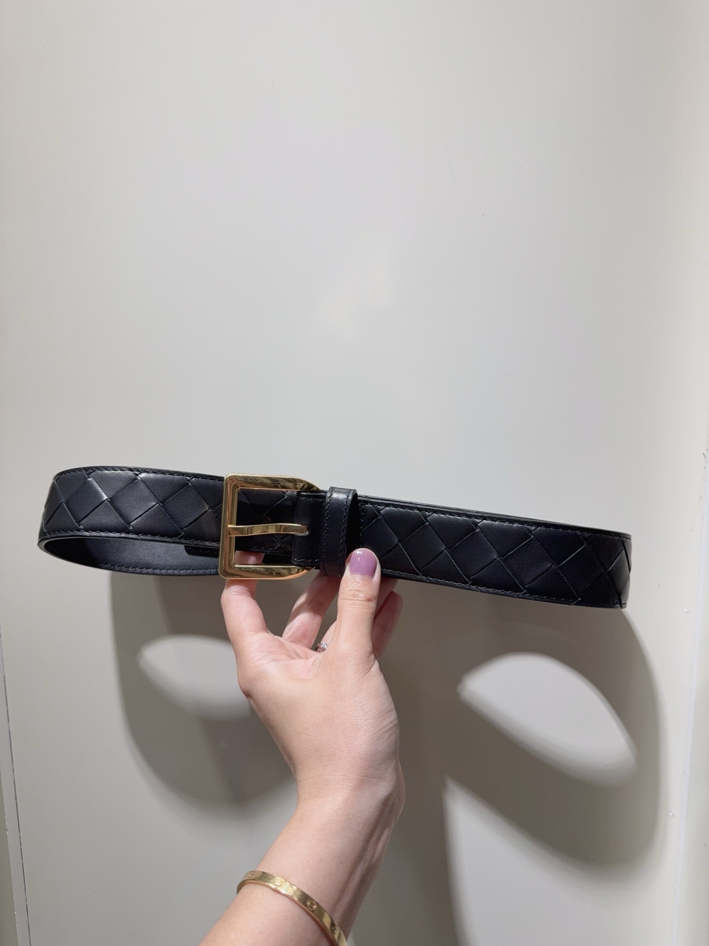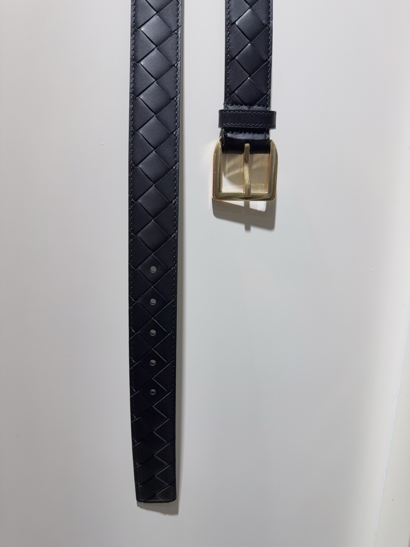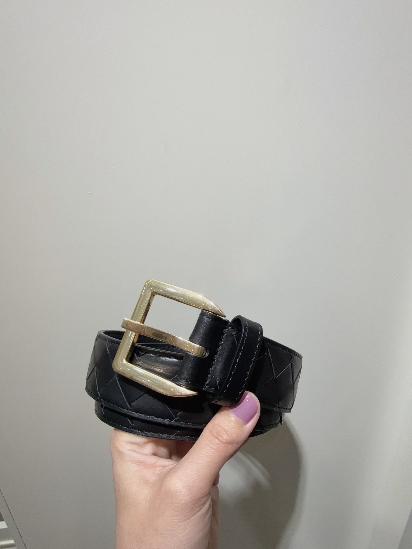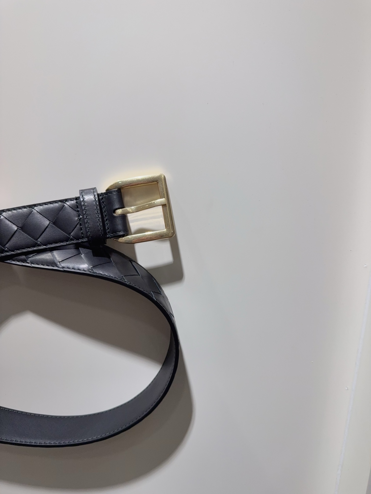New BV Intrecciato Piccolo woven belt. Buckle closure, calfskin lining, brass hardware. 3.5cm height.