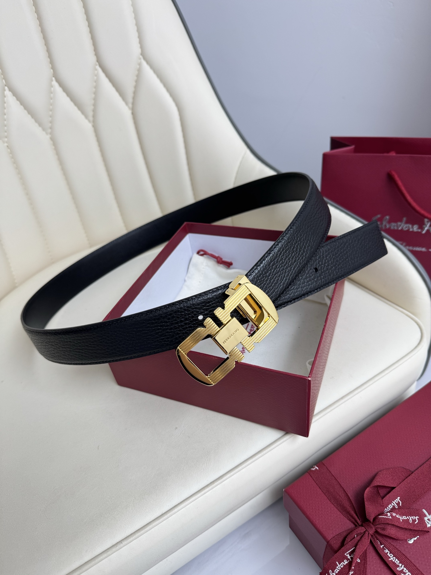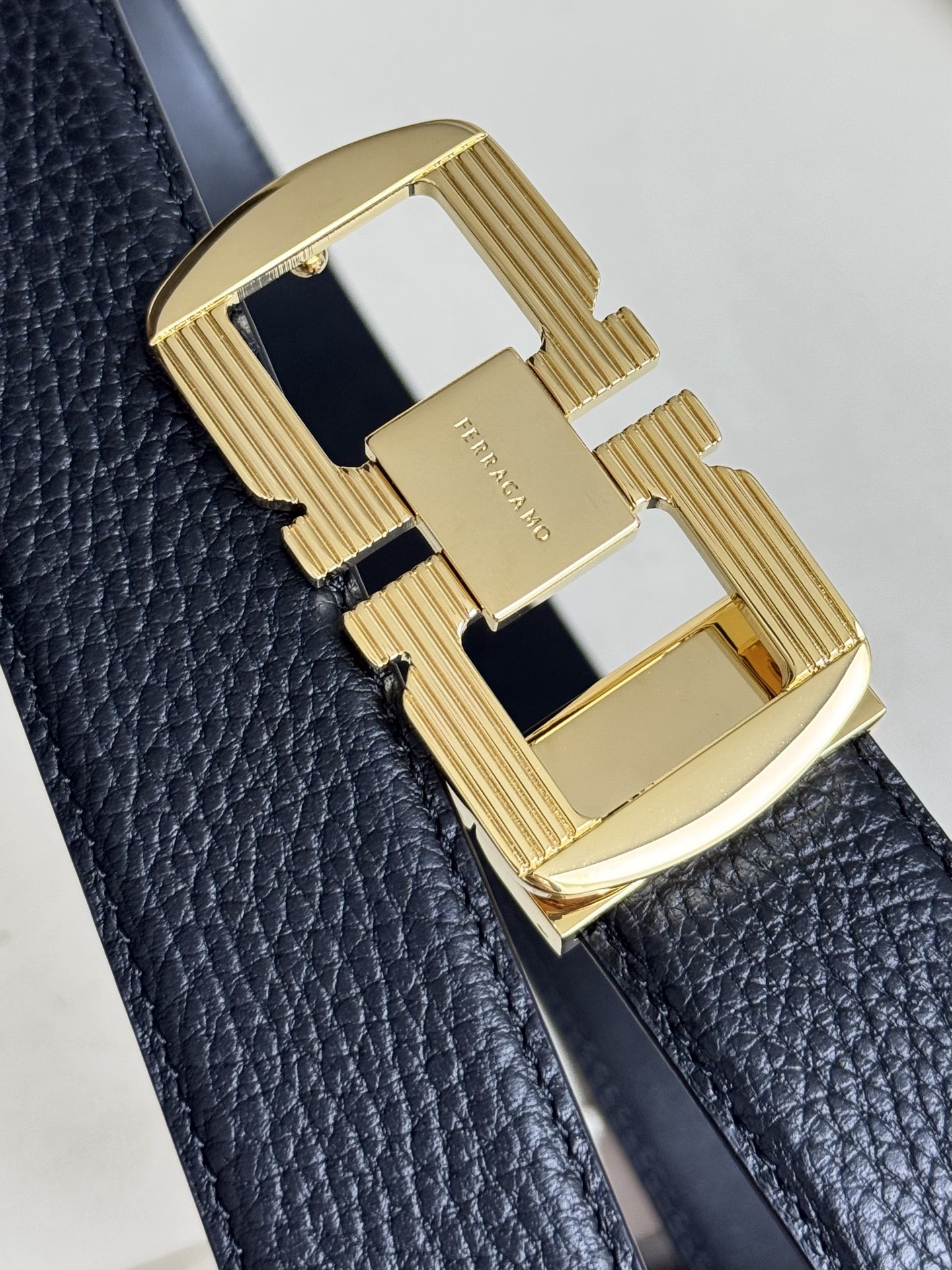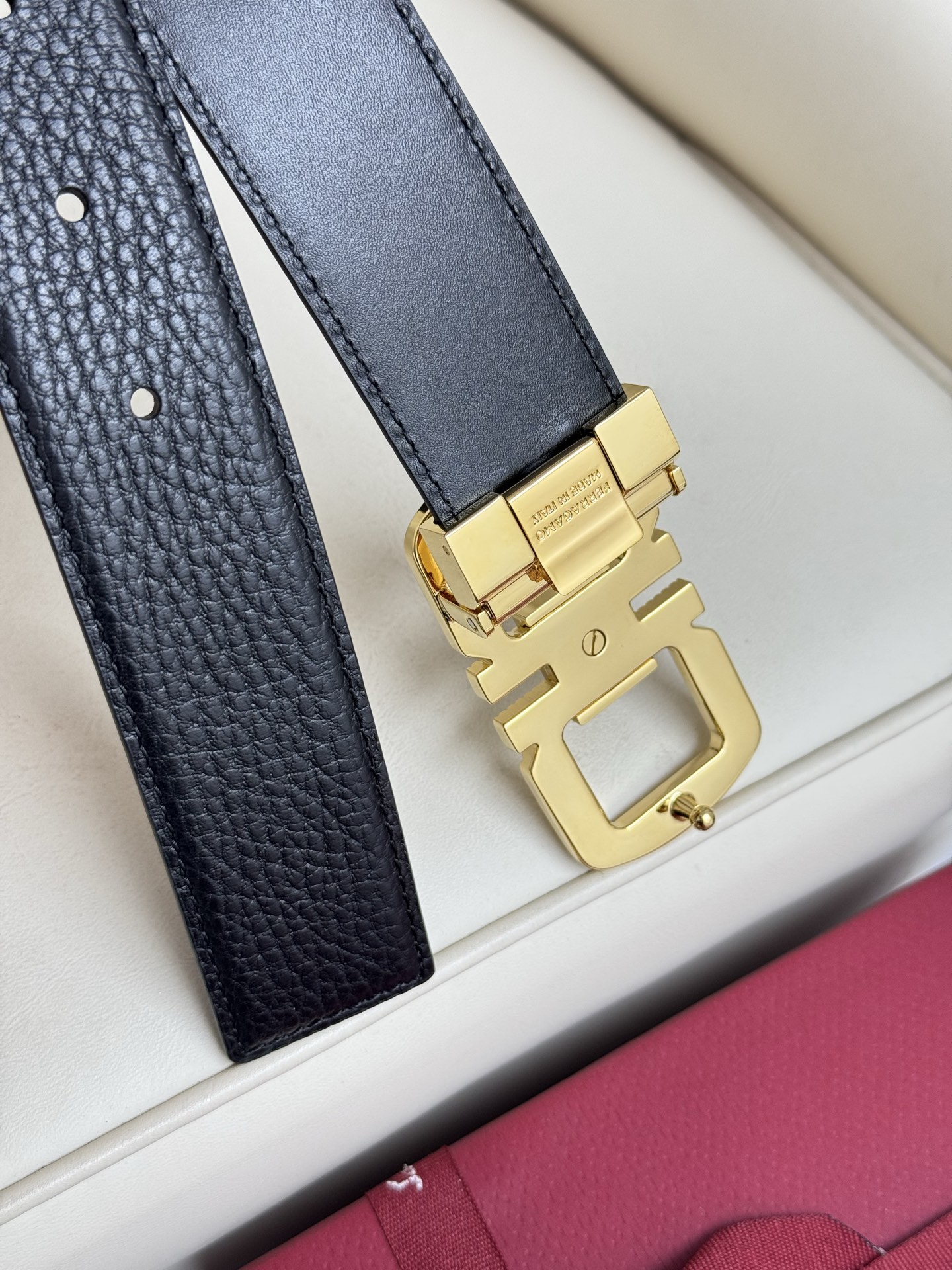 Ferragamo double-sided genuine leather belt with bronze clasp, 3.5cm width.