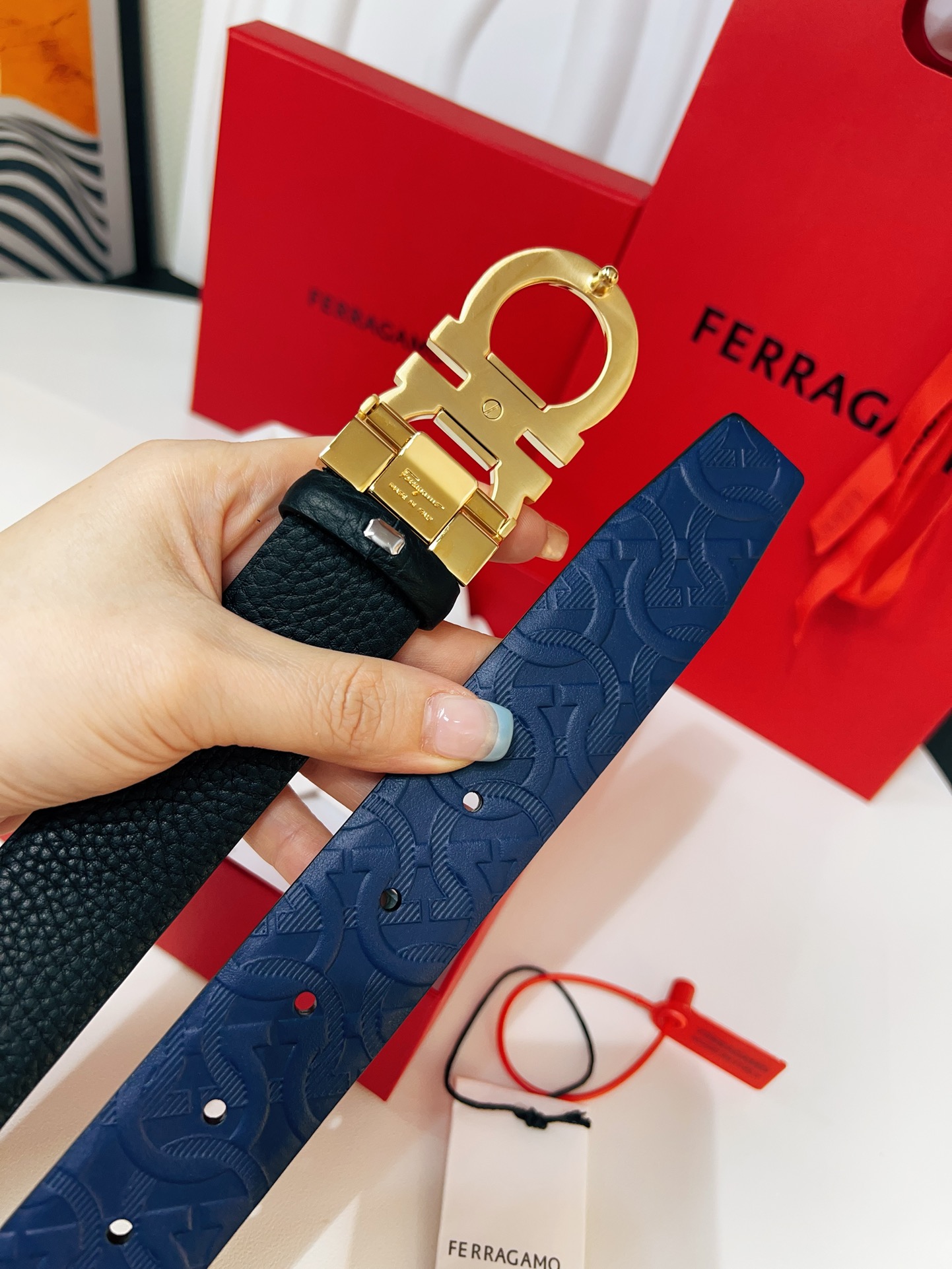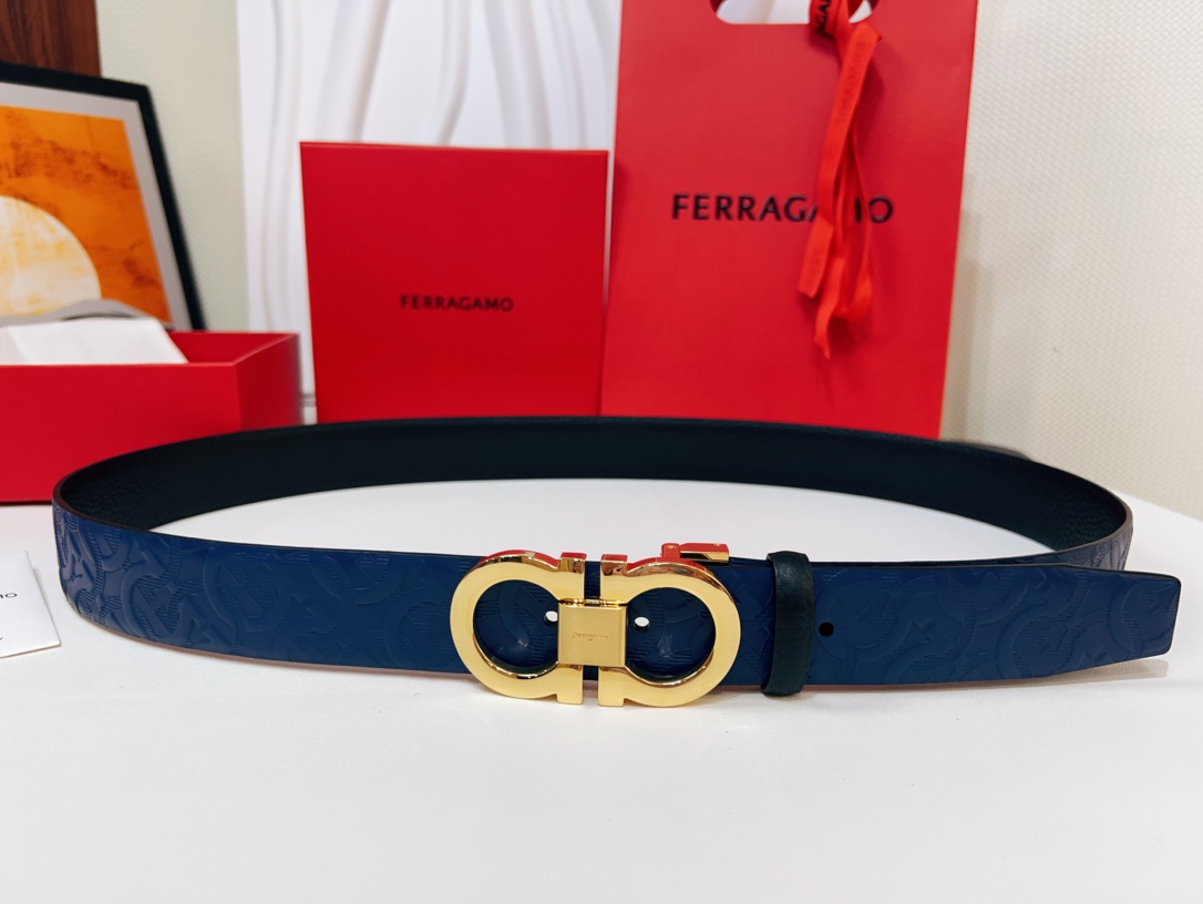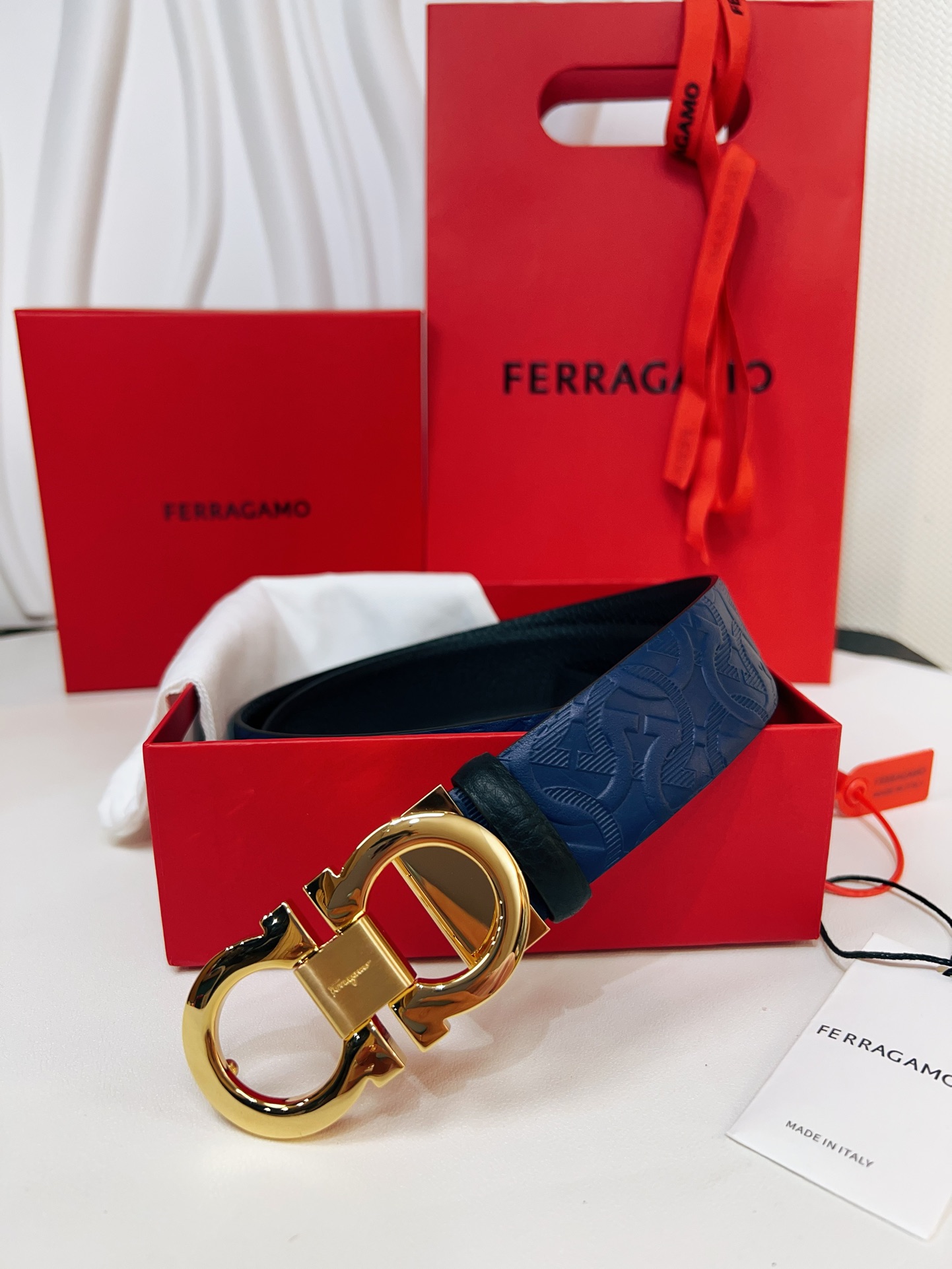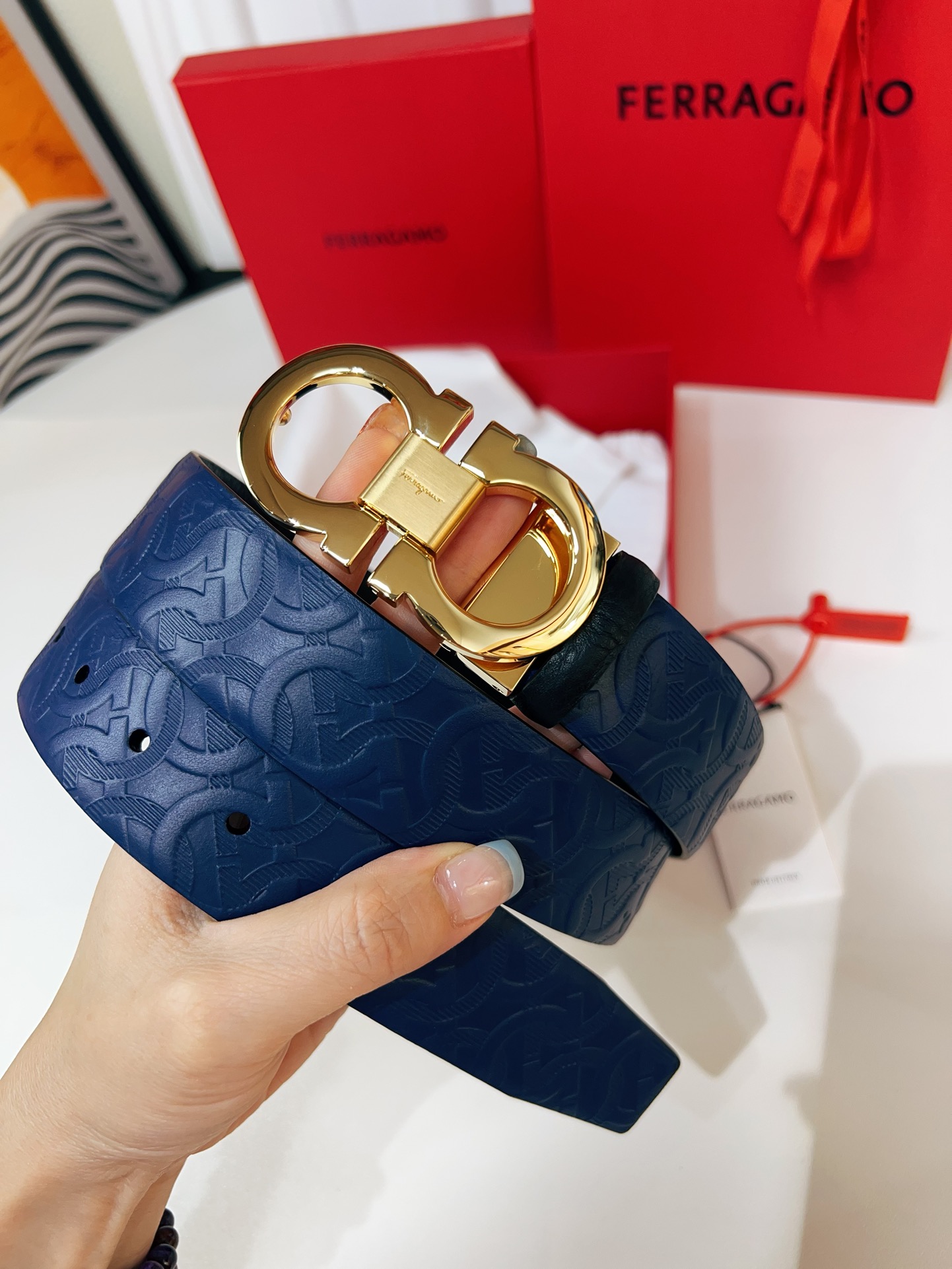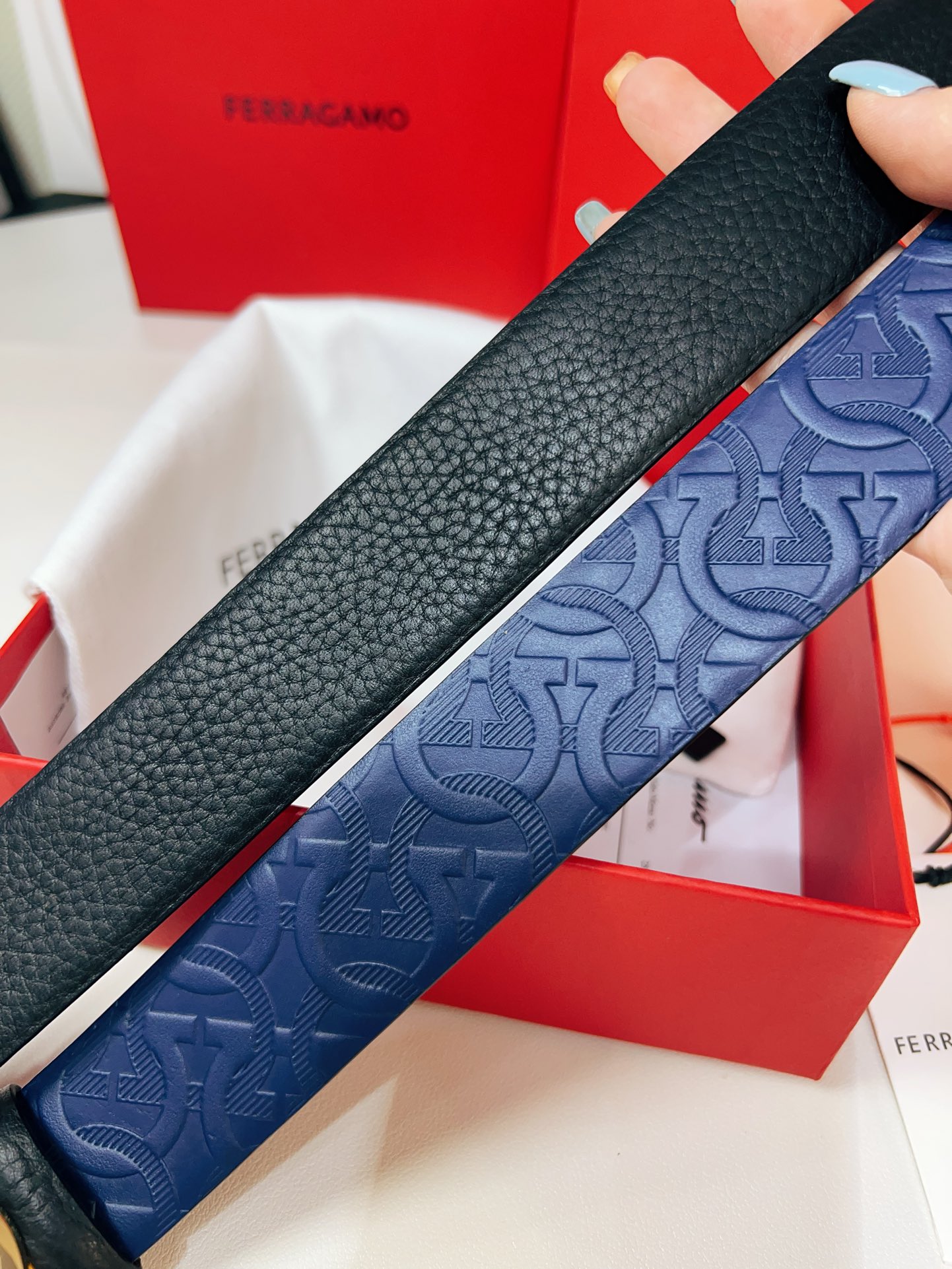 This double-sided belt is stylish and versatile, an indispensable men's accessory item. One side is made of hammered cowhide, while the other side is made of carefully selected natural grain cowhide, adorned with a gold-finished Gancini buckle for an eye-catching touch. The interior features delicate satin decorative details. The length is adjustable. The belt can be trimmed or additional eyelets can be added to create a tight or loose fit.