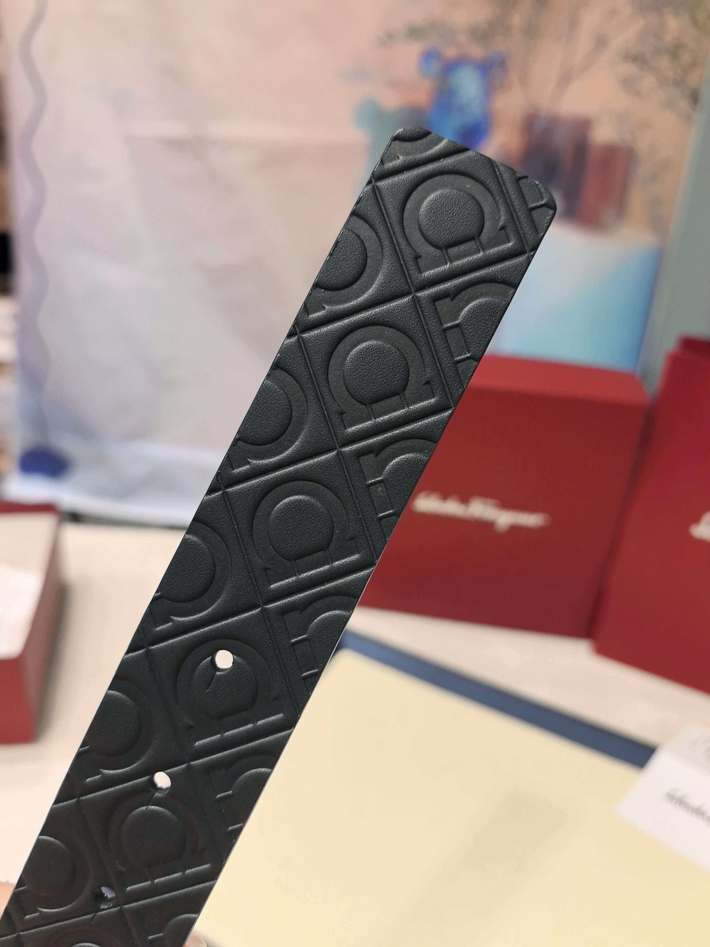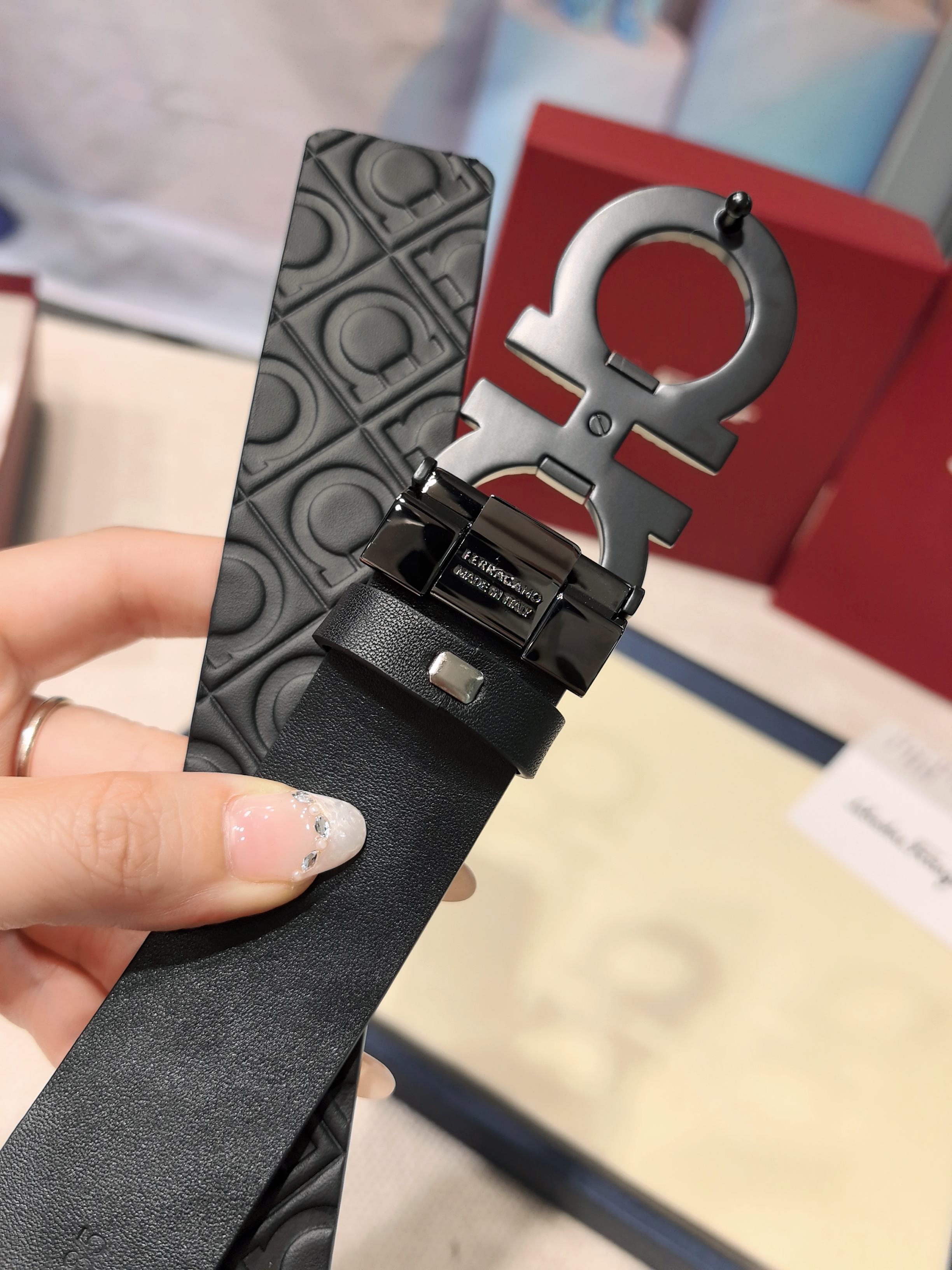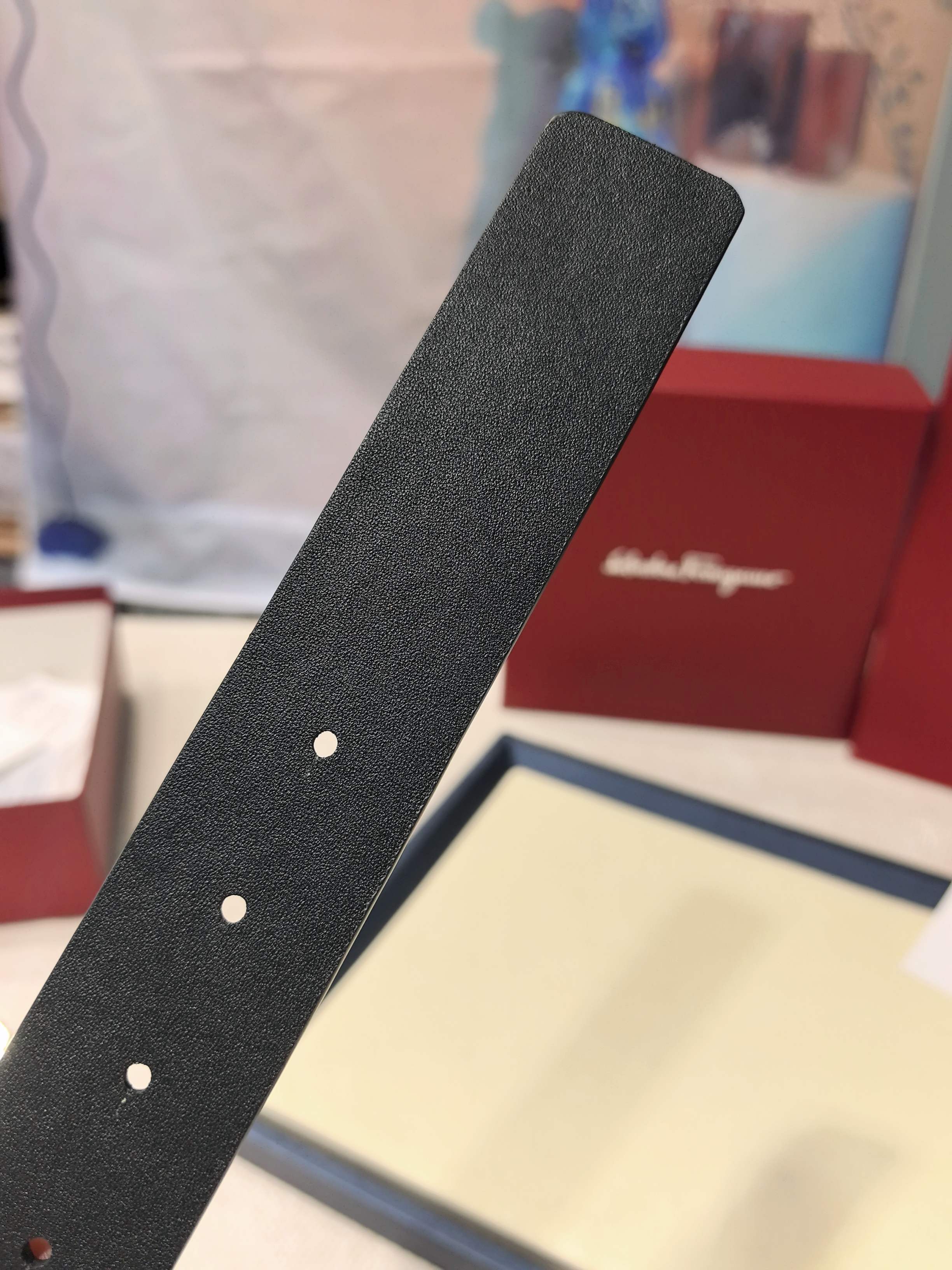 This belt is elegant and luxurious, a memorable Ferragamo classic. Made from natural textured calfskin, it features a clear grain finish. The ruthenium gray Gancini buckle complements the engraved logo. The adjustable length allows for a tailored, slim-fit effect. 3.5 wide