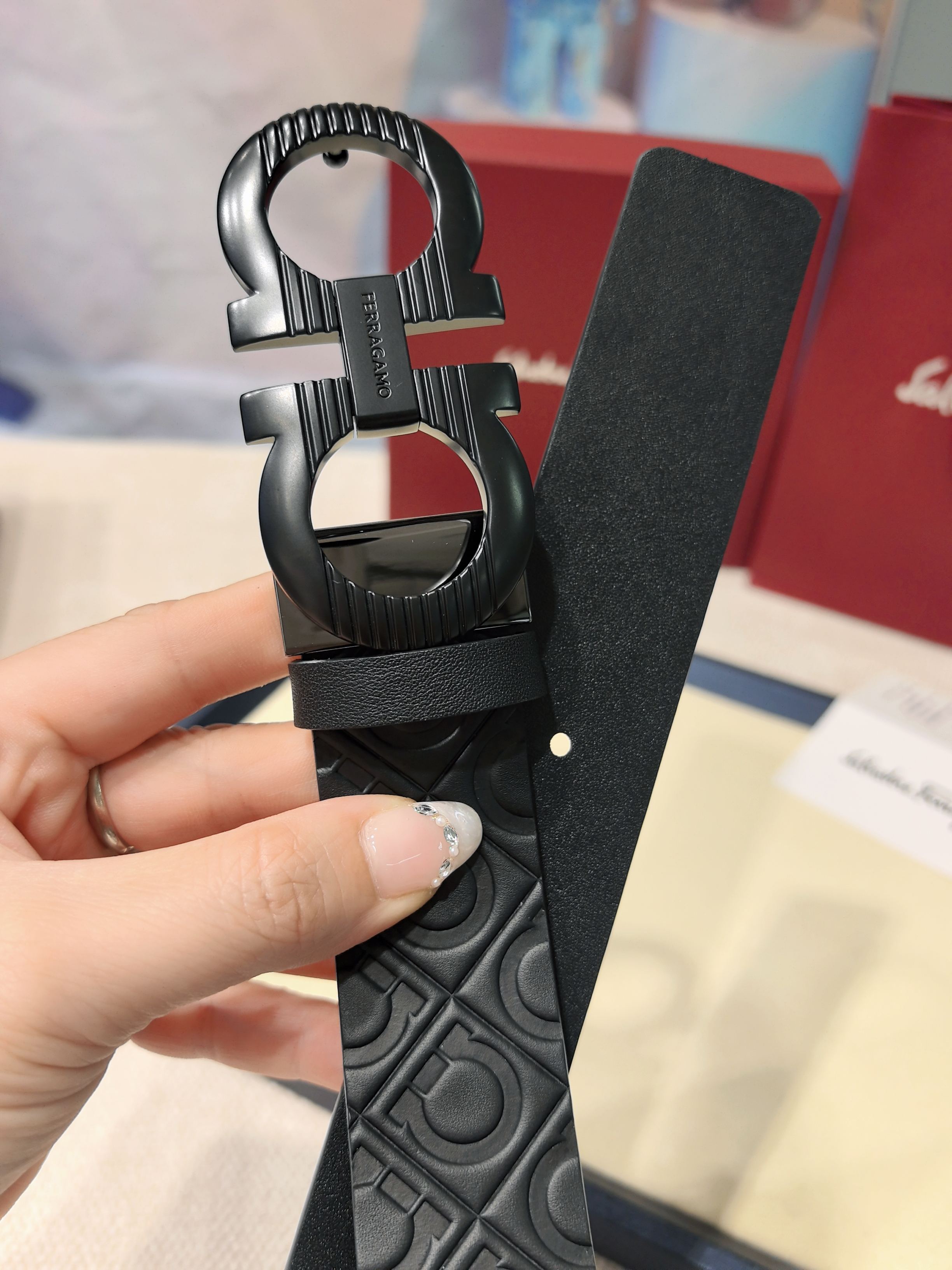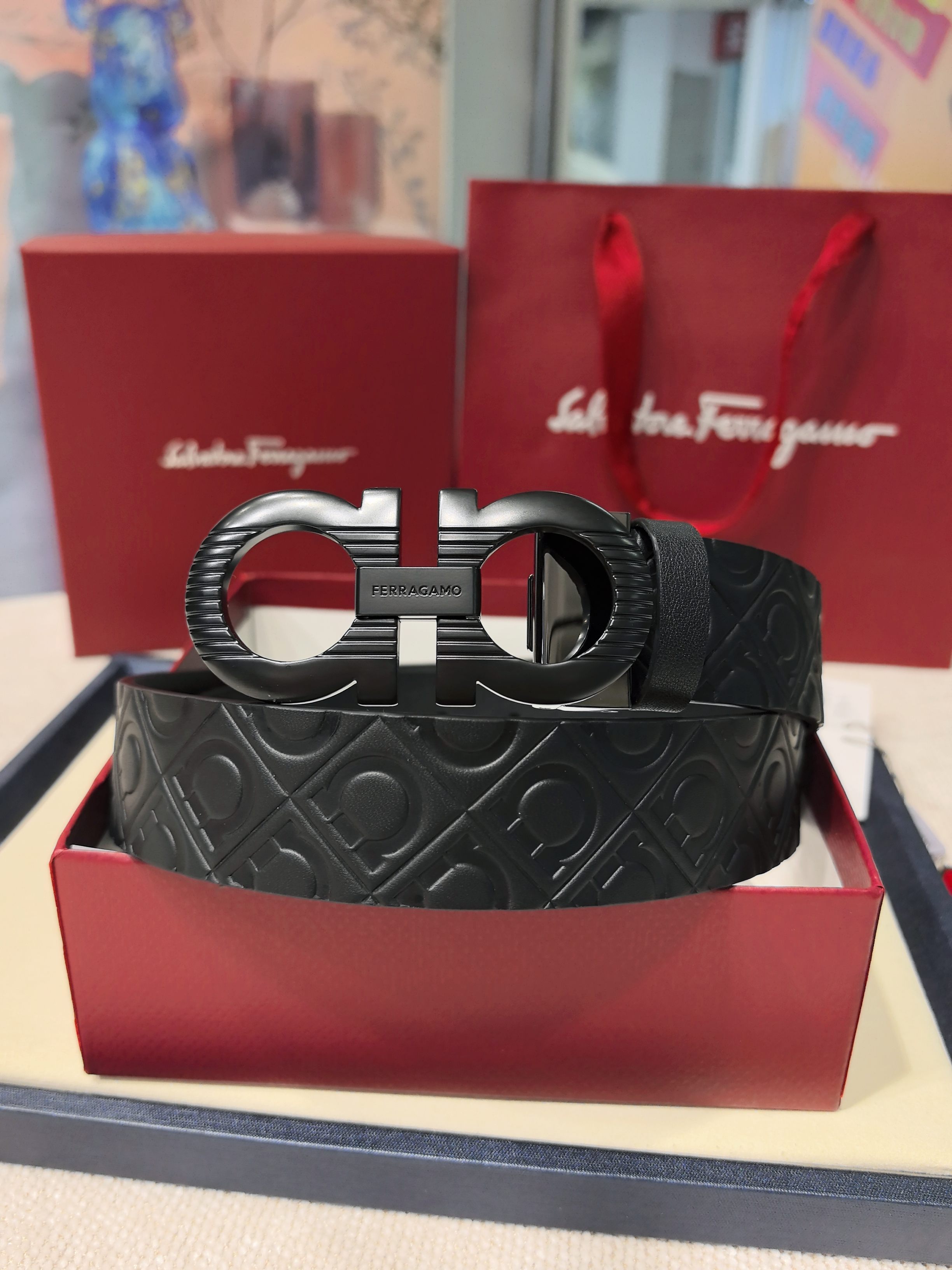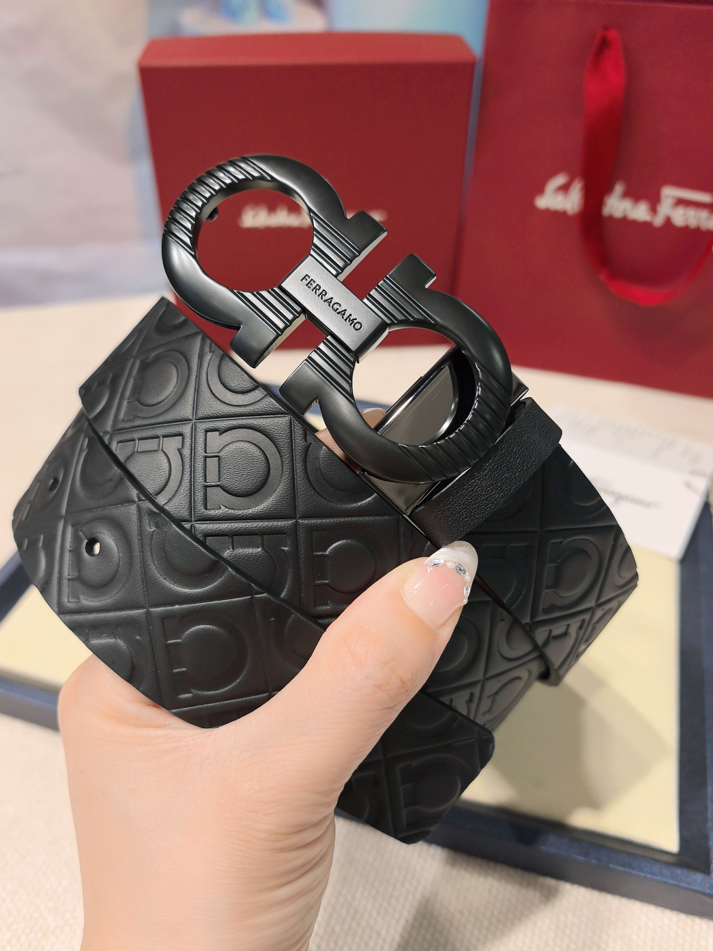 This belt is elegant and luxurious, a memorable Ferragamo classic. Made from natural textured calfskin, it features a clear grain finish. The ruthenium gray Gancini buckle complements the engraved logo. The adjustable length allows for a tailored, slim-fit effect. 3.5 wide