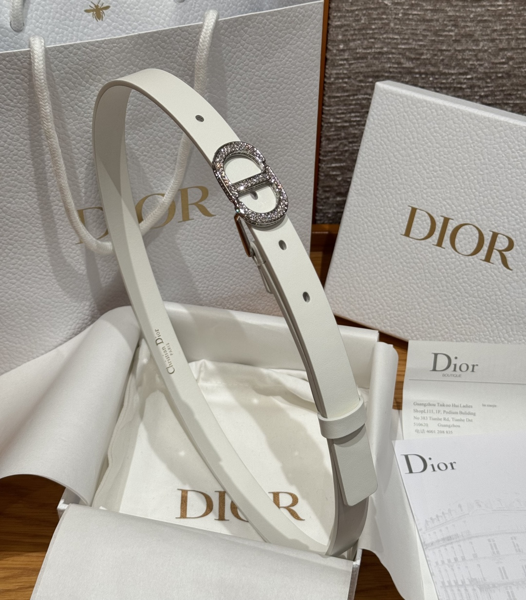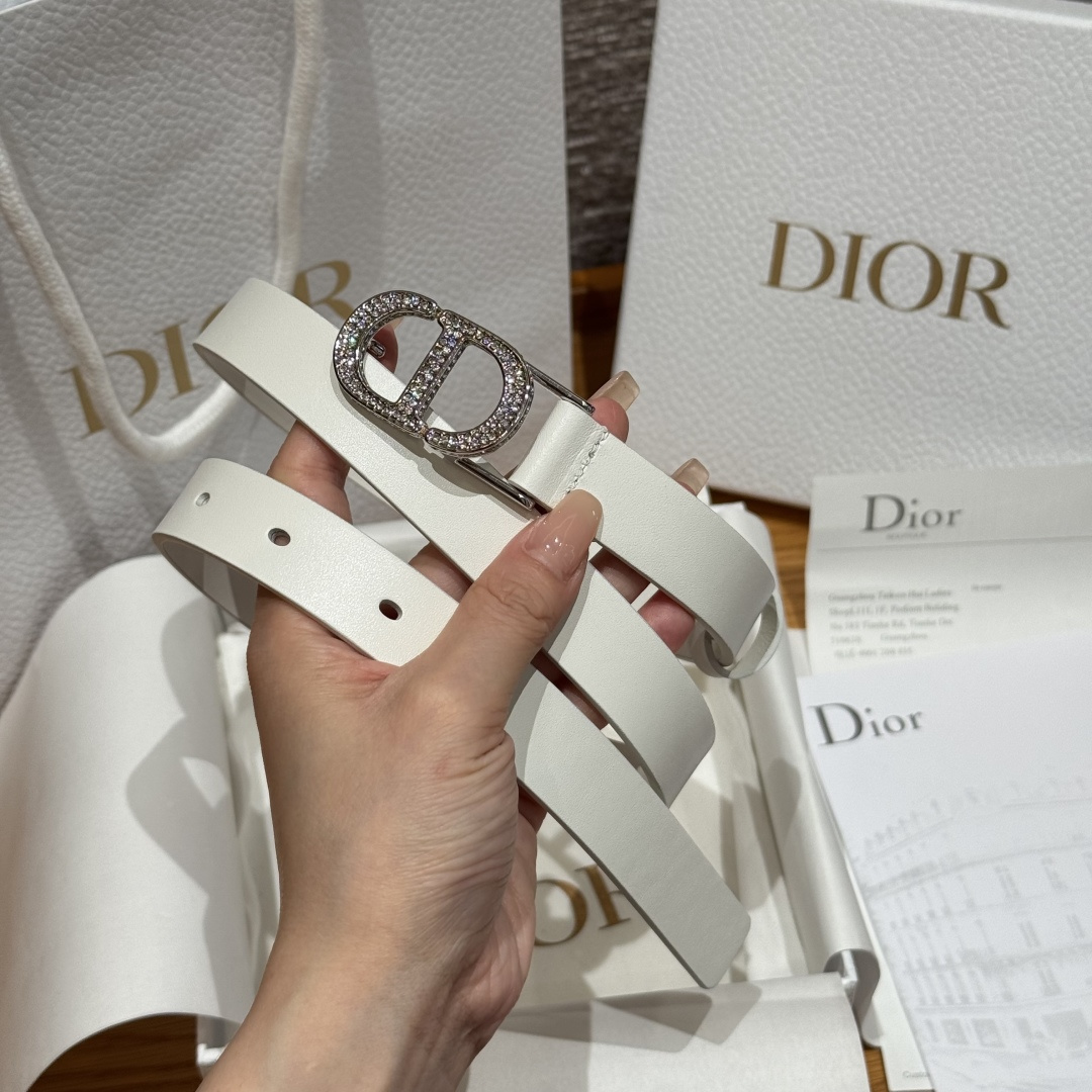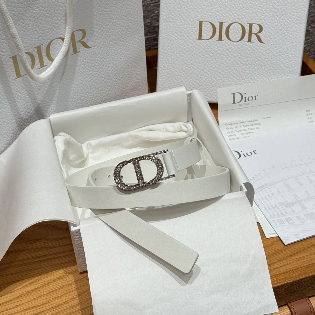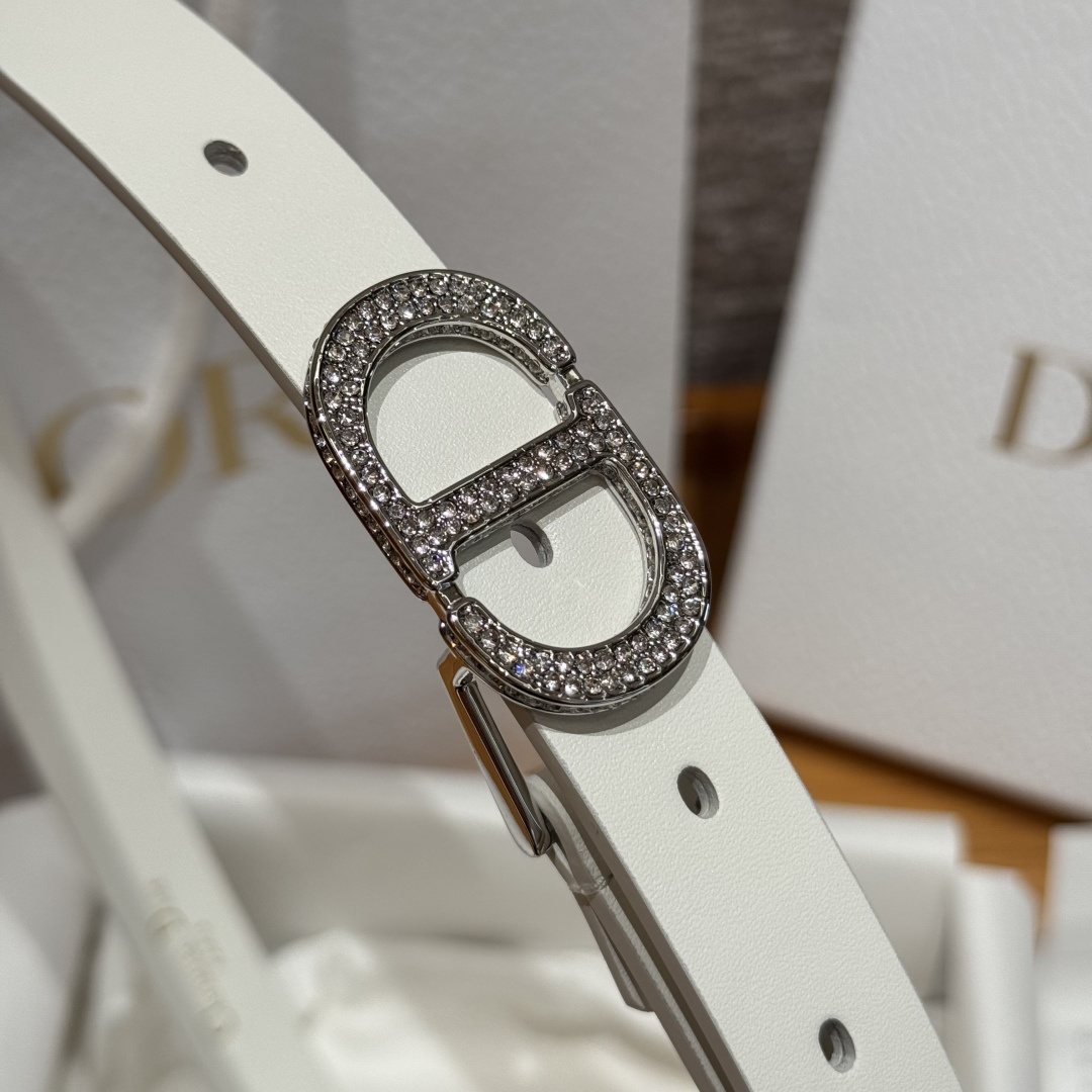 This 30 Montaigne belt draws inspiration from the namesake handbag, offering a fresh interpretation in a stylish and sophisticated design. It is meticulously crafted from smooth white calfskin and adorned with a classic gold-finished CD buckle, densely set with gold-toned crystal embellishments. The style accentuates the waistline and exudes an elegant charm, making it suitable for pairing with jeans, skirts, or dresses.