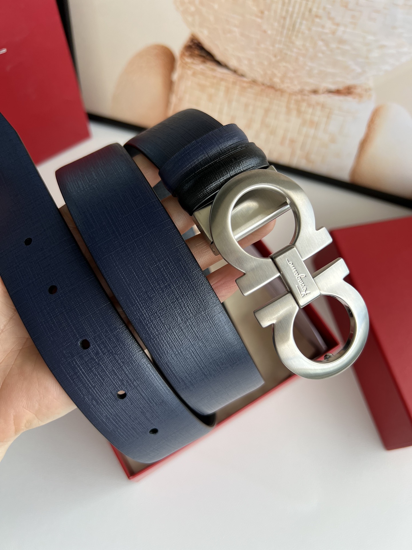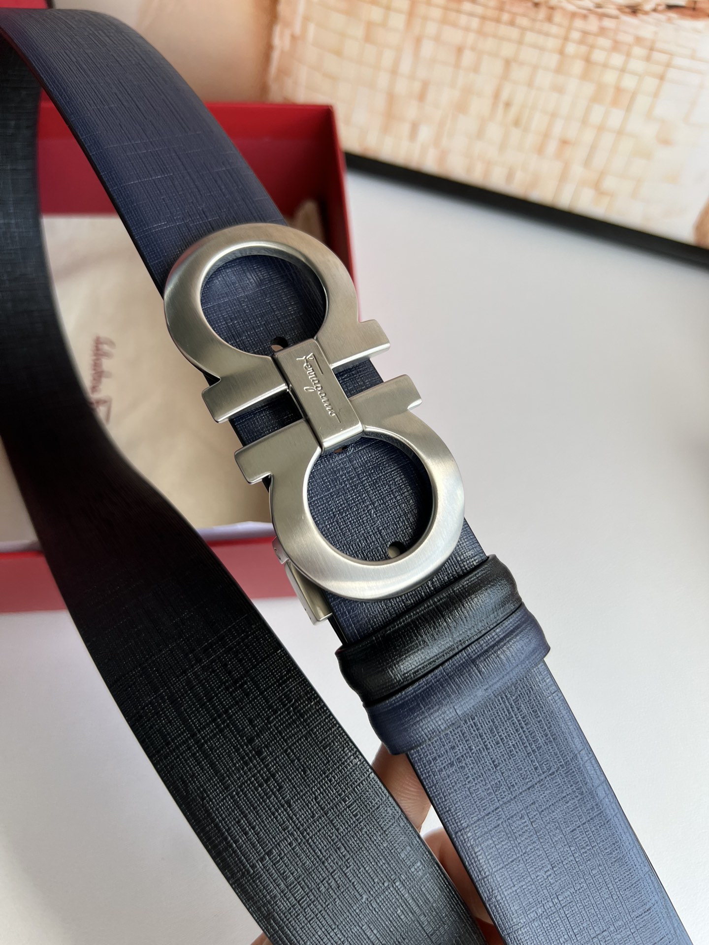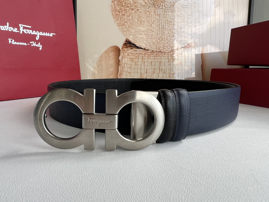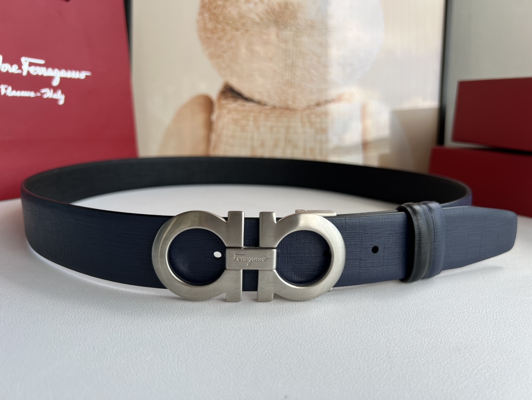 A piece that highlights temperament, with an exquisite 8-shaped metal brushed buckle. The metal buckle is visually designed to be simple yet extraordinary, and tactilely comfortable and delicate. Paired with double-sided top-grain blue/black leather, it is simple and refined enough. 3.5cm