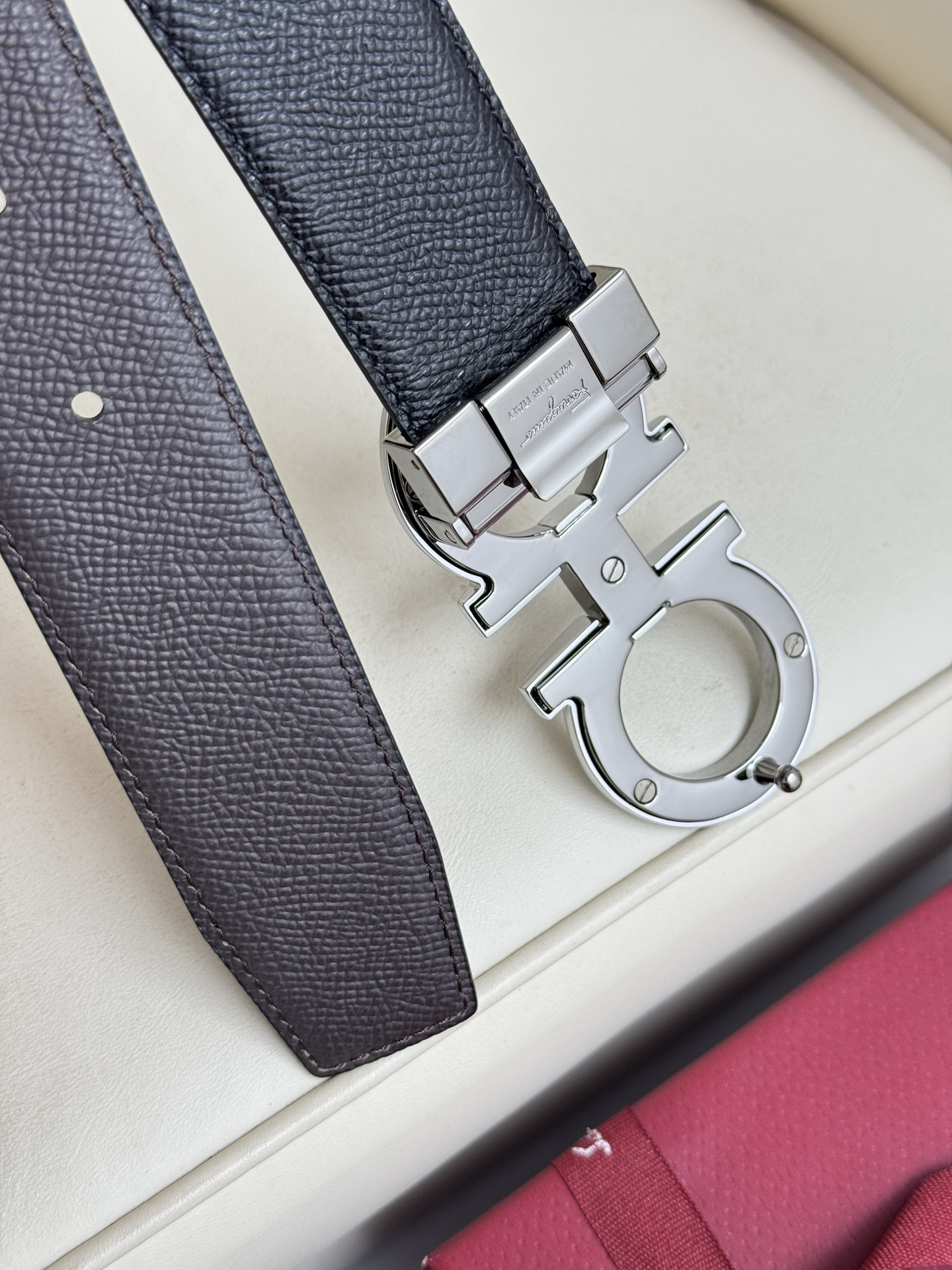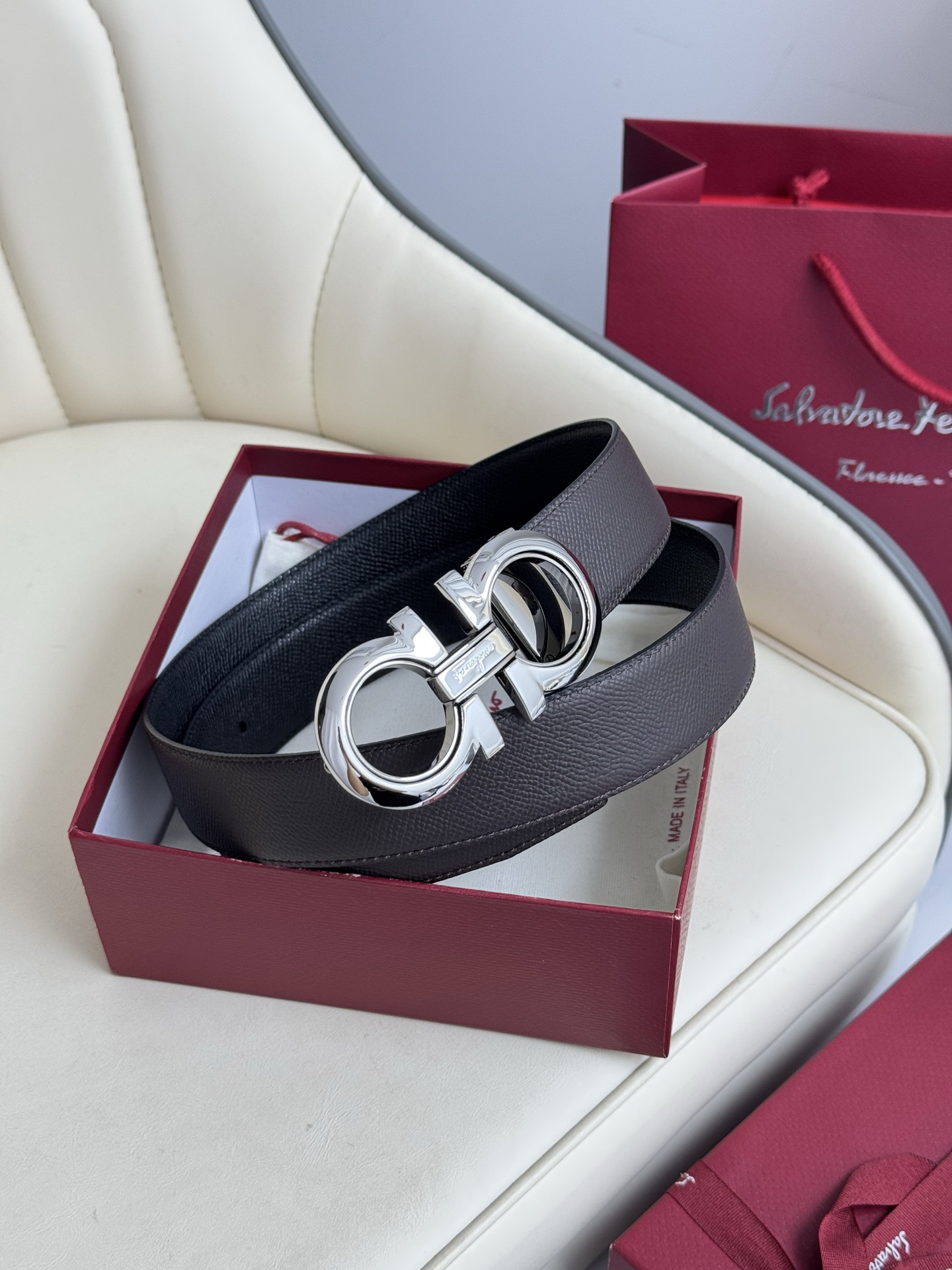 Ferragamo double-sided genuine leather belt with brass buckle, versatile style. Comes with full packaging.