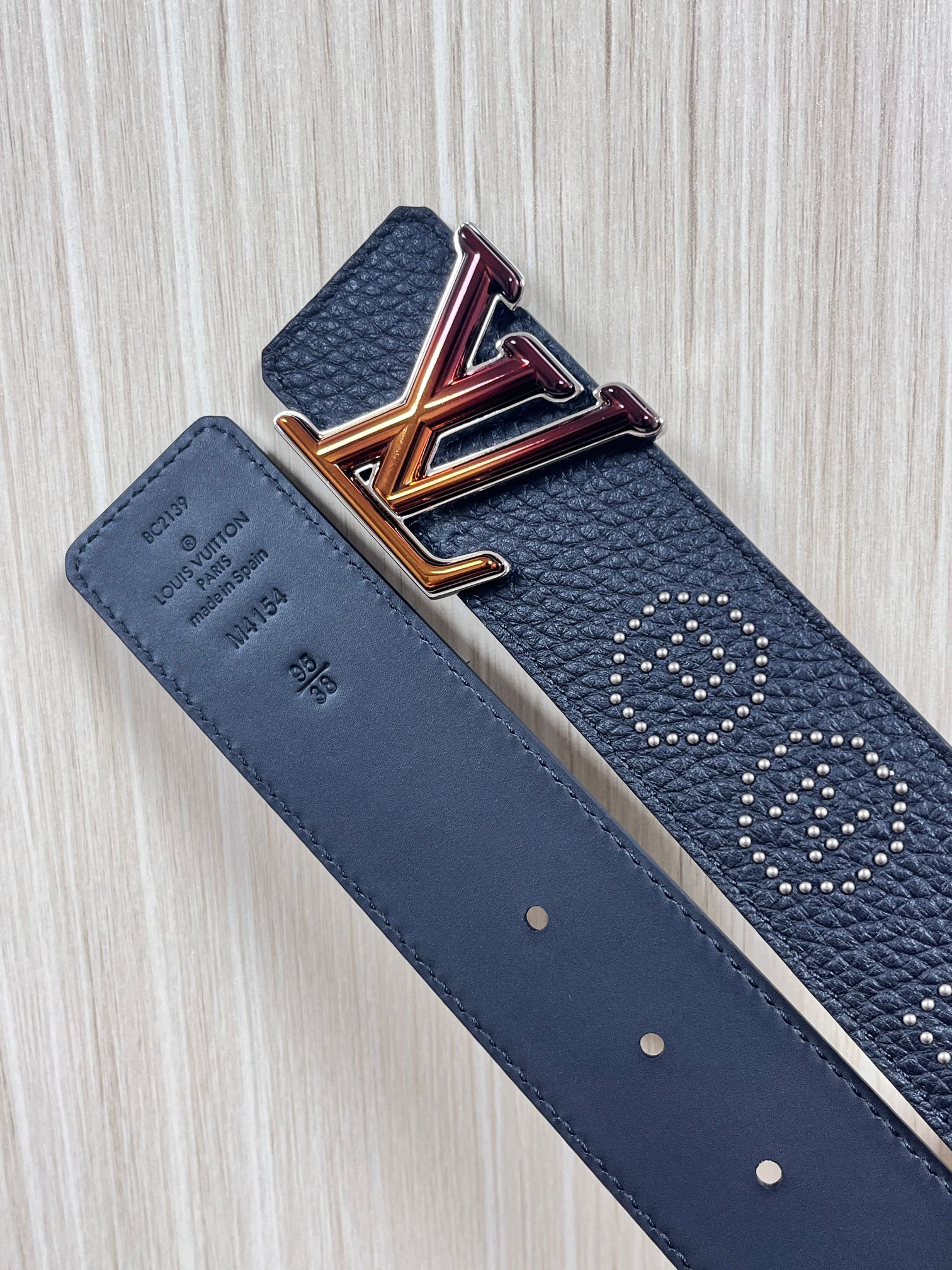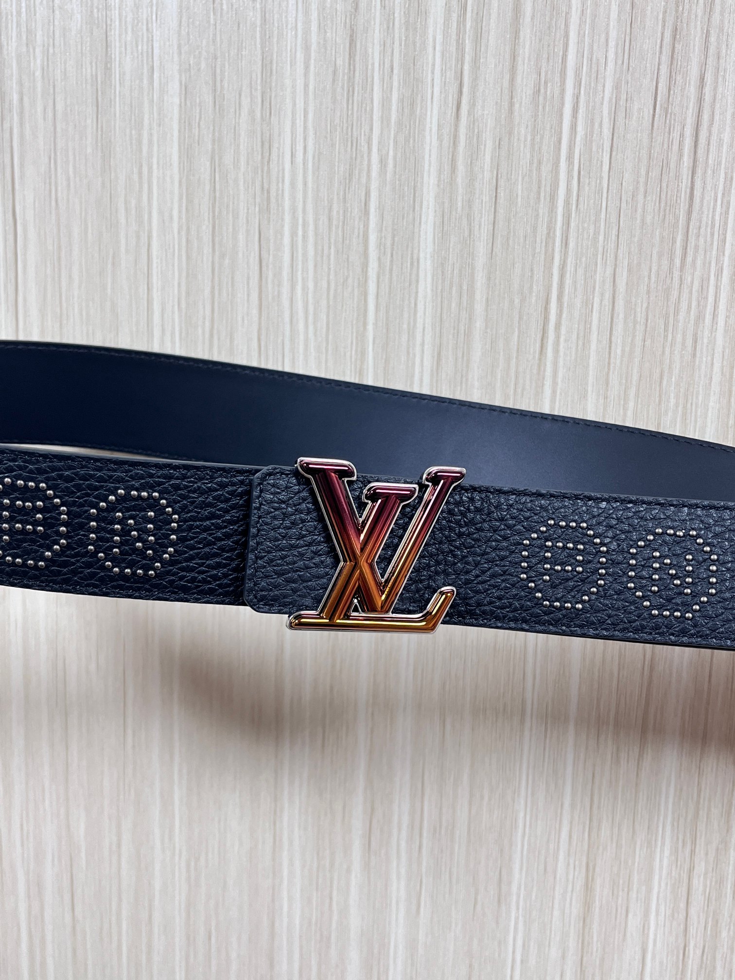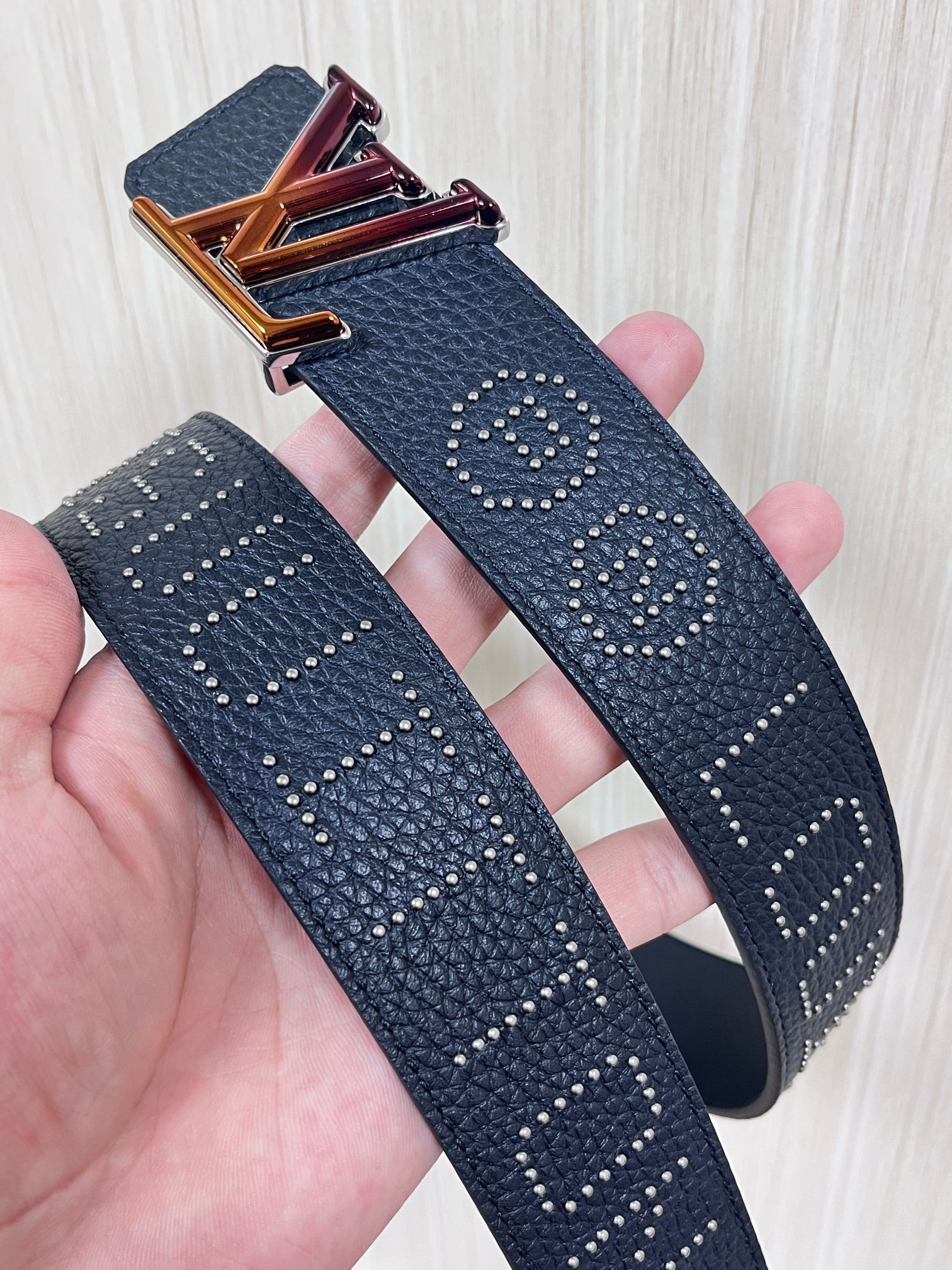 The LV Dimension Rockabilly Studs 40mm reversible belt features small, lustrous studs arranged on one side with the words "LOUIS VUITTON," "P," and "N," paying tribute to the collaboration between Pharell Williams and Nigo. The simple buckle balances intricate details, complementing the elegant reverse side. The eye-catching design showcases a blend of retro style and modern fashion. 4.0 wide studded nails.