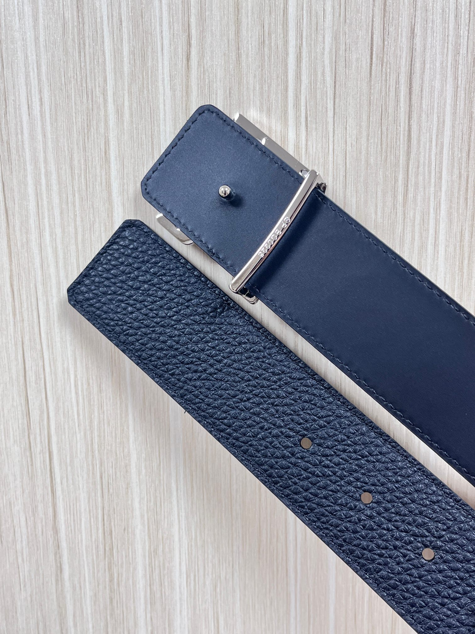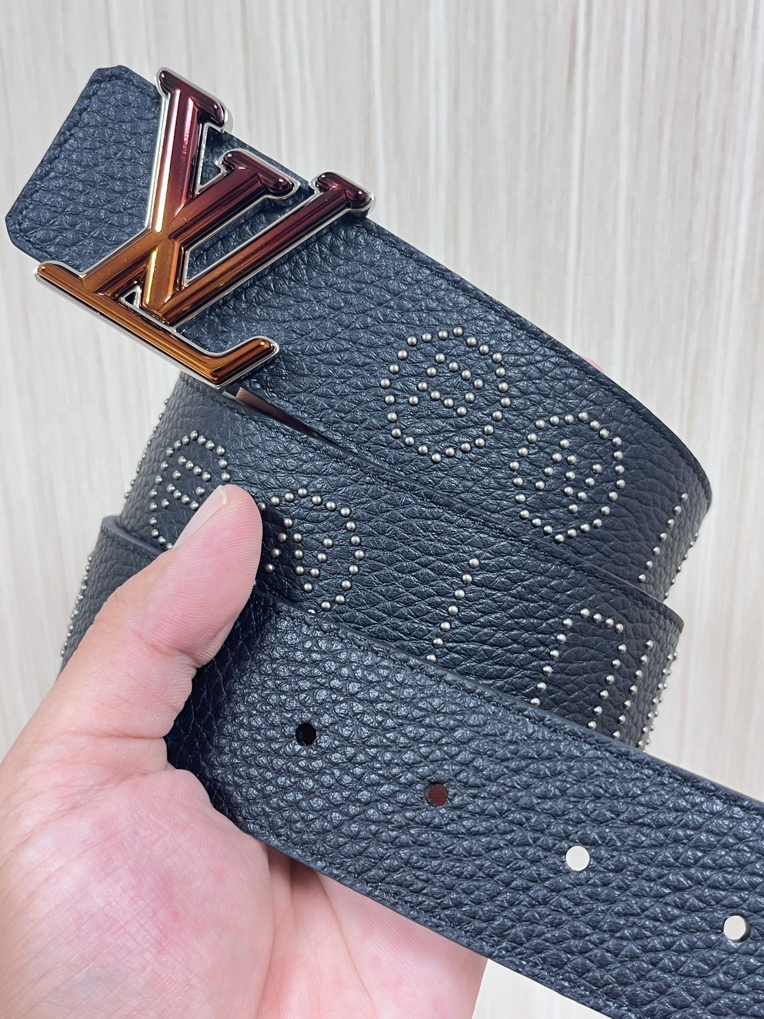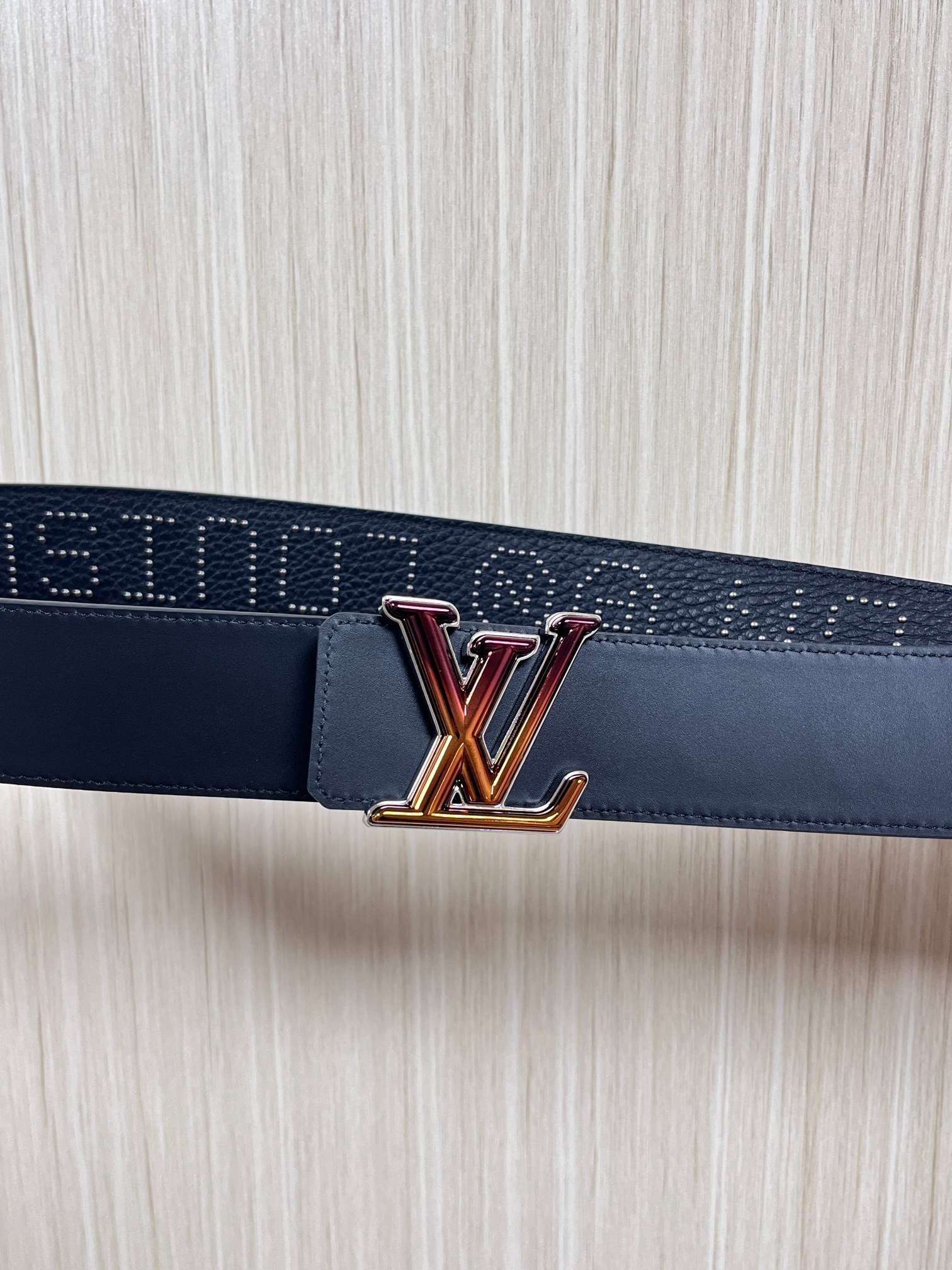 The LV Dimension Rockabilly Studs 40mm reversible belt features small, lustrous studs arranged on one side with the words "LOUIS VUITTON," "P," and "N," paying tribute to the collaboration between Pharell Williams and Nigo. The simple buckle balances intricate details, complementing the elegant reverse side. The eye-catching design showcases a blend of retro style and modern fashion. 4.0 wide studded nails.