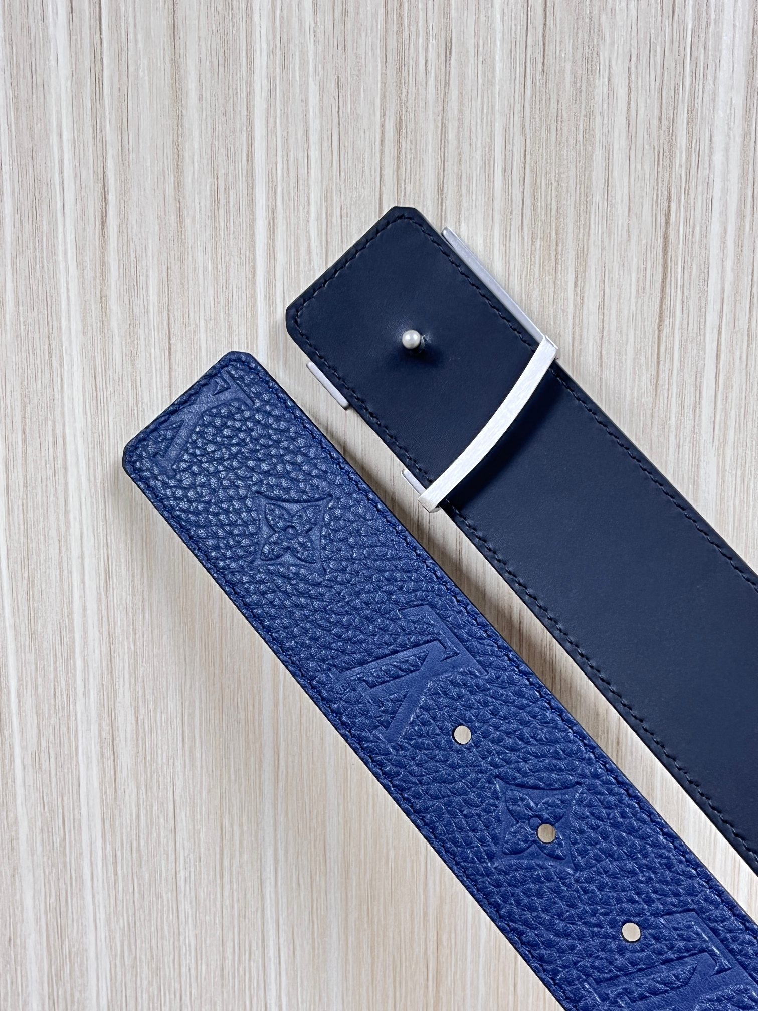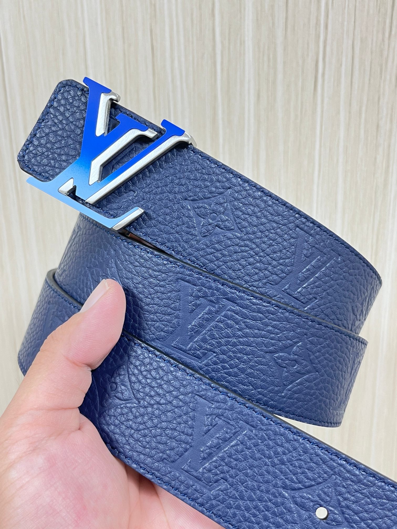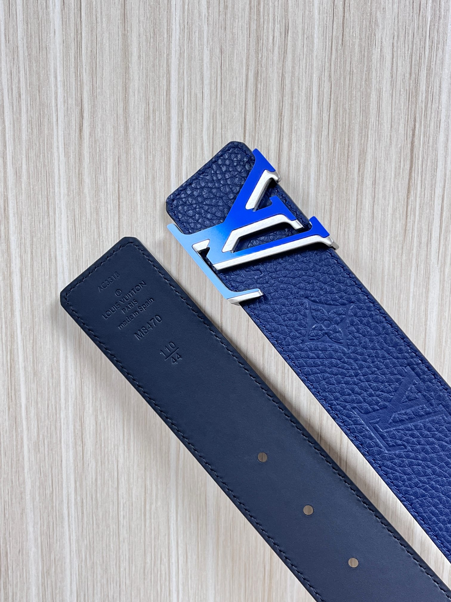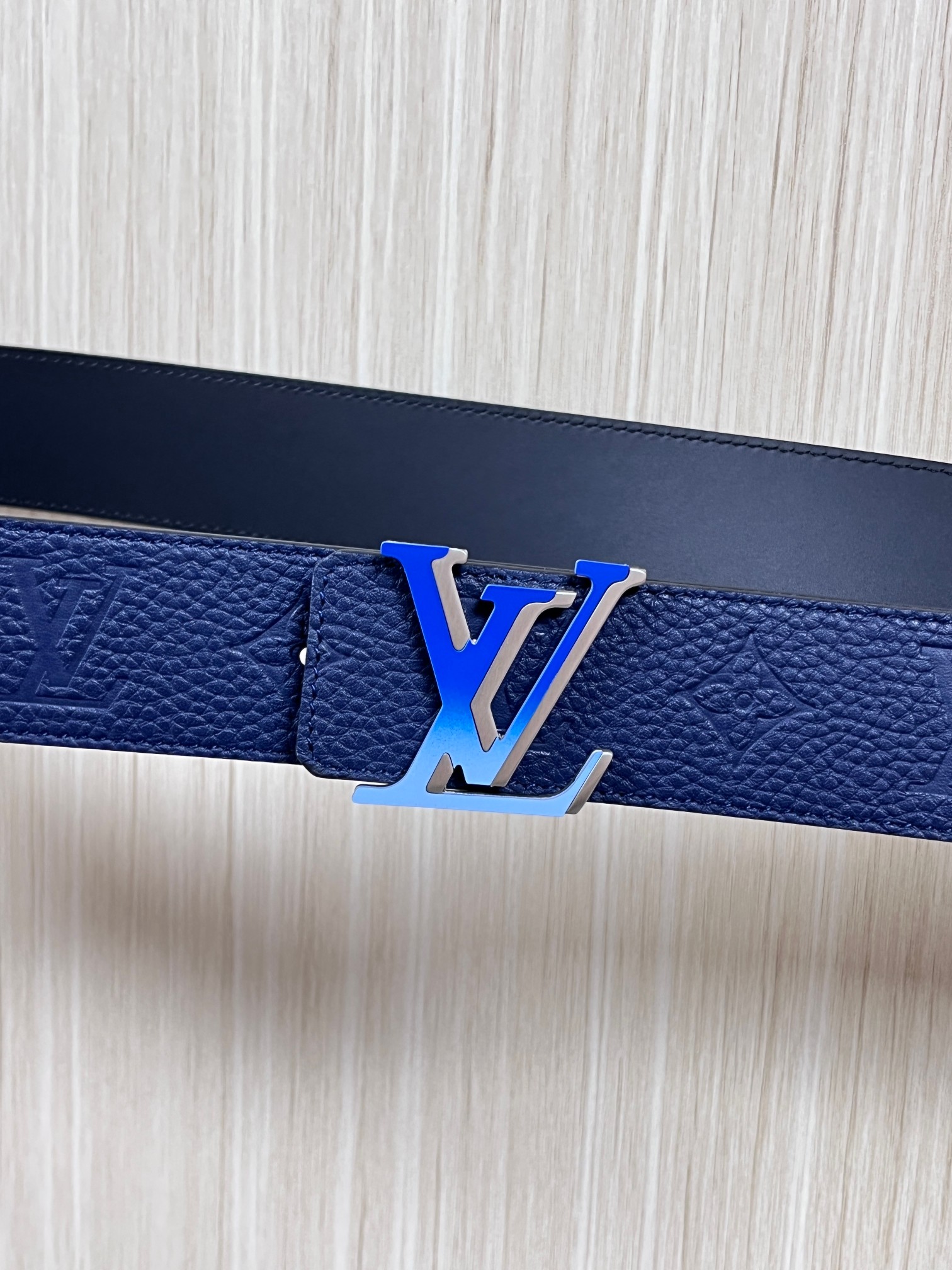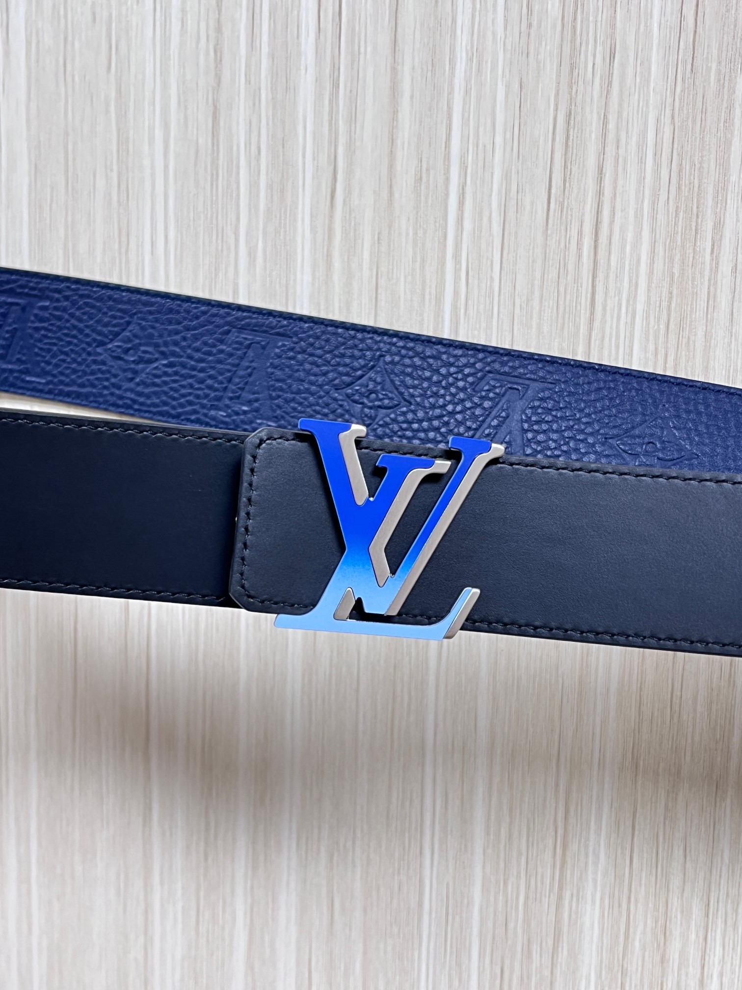 4.0 width new season style, double-sided imported calfskin print, paired with premium gradient blue buckle official website head. Drip glue blue, gradient blue buckle