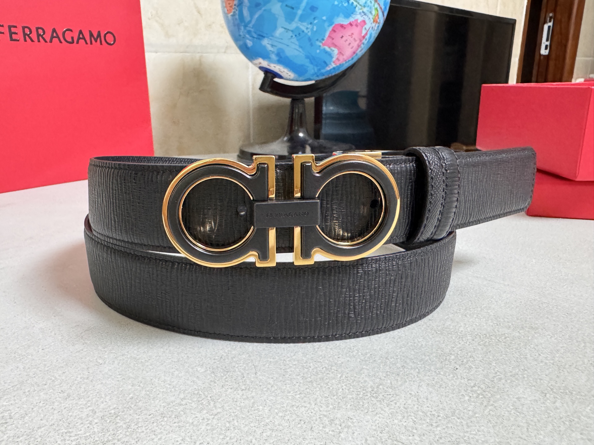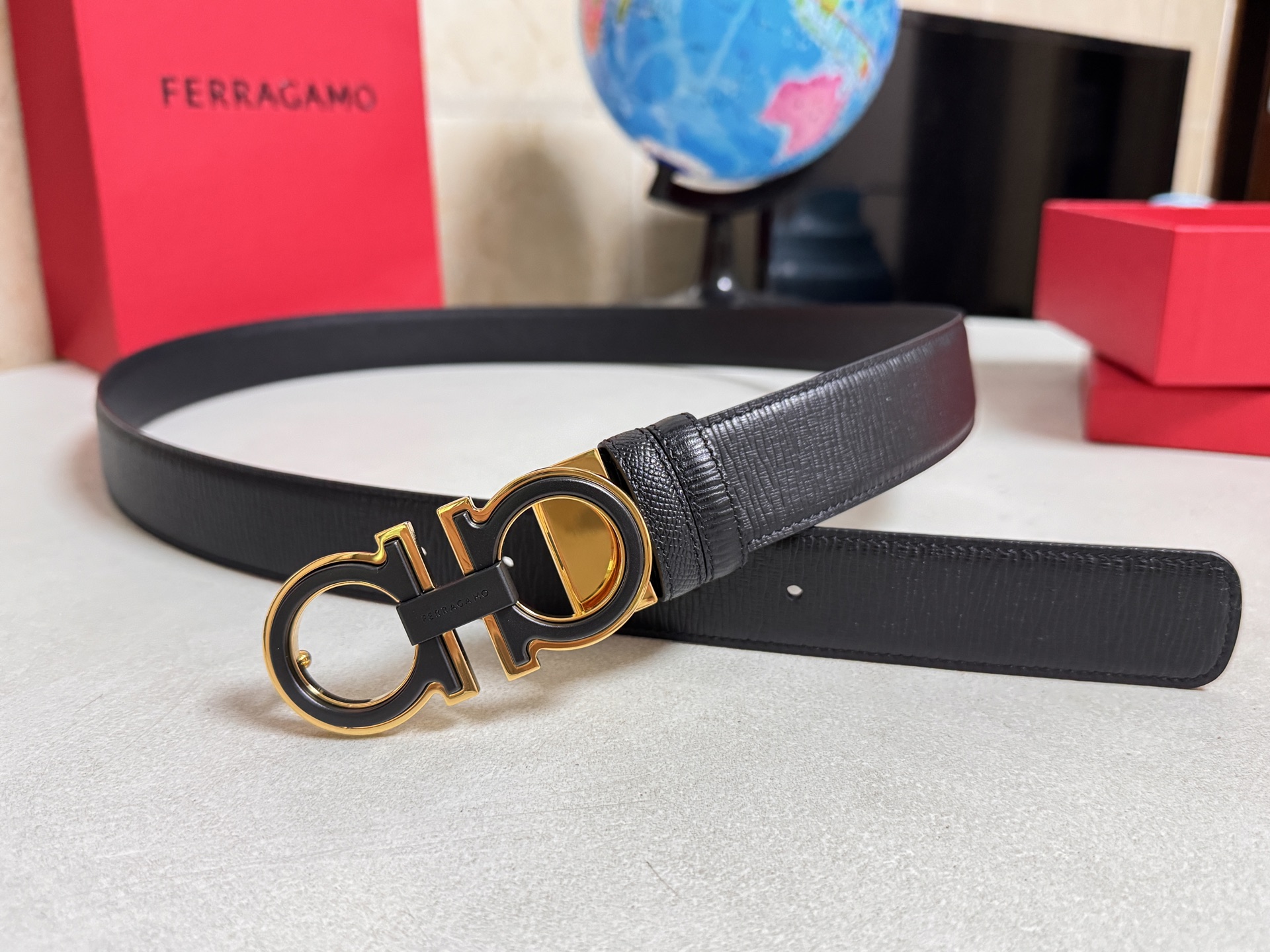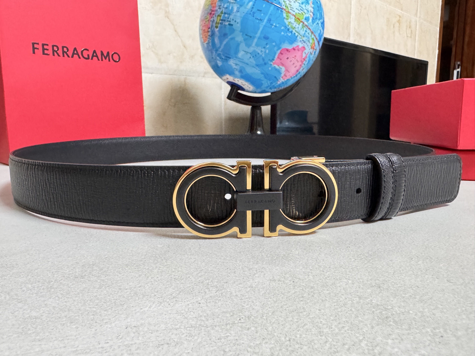 Ferragamo men's leather belt in black/black-brown, double-sided, classic timeless boutique-style double-layer buckle belt 3.5cm, exquisite workmanship, perfect presentation