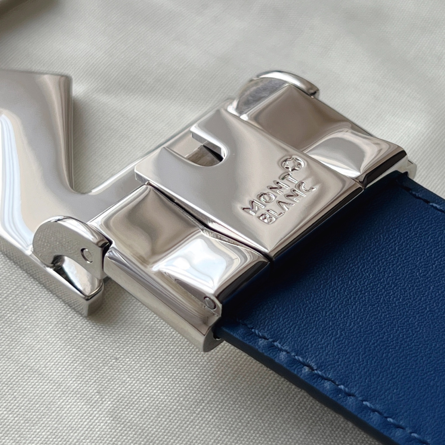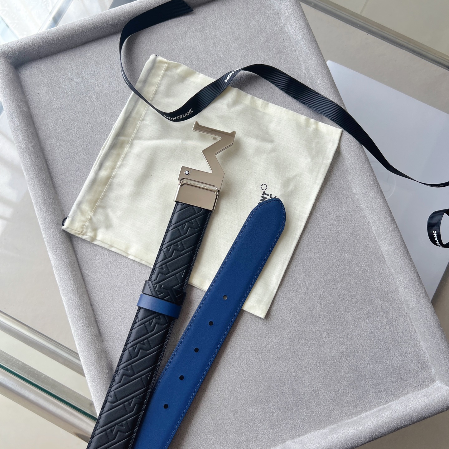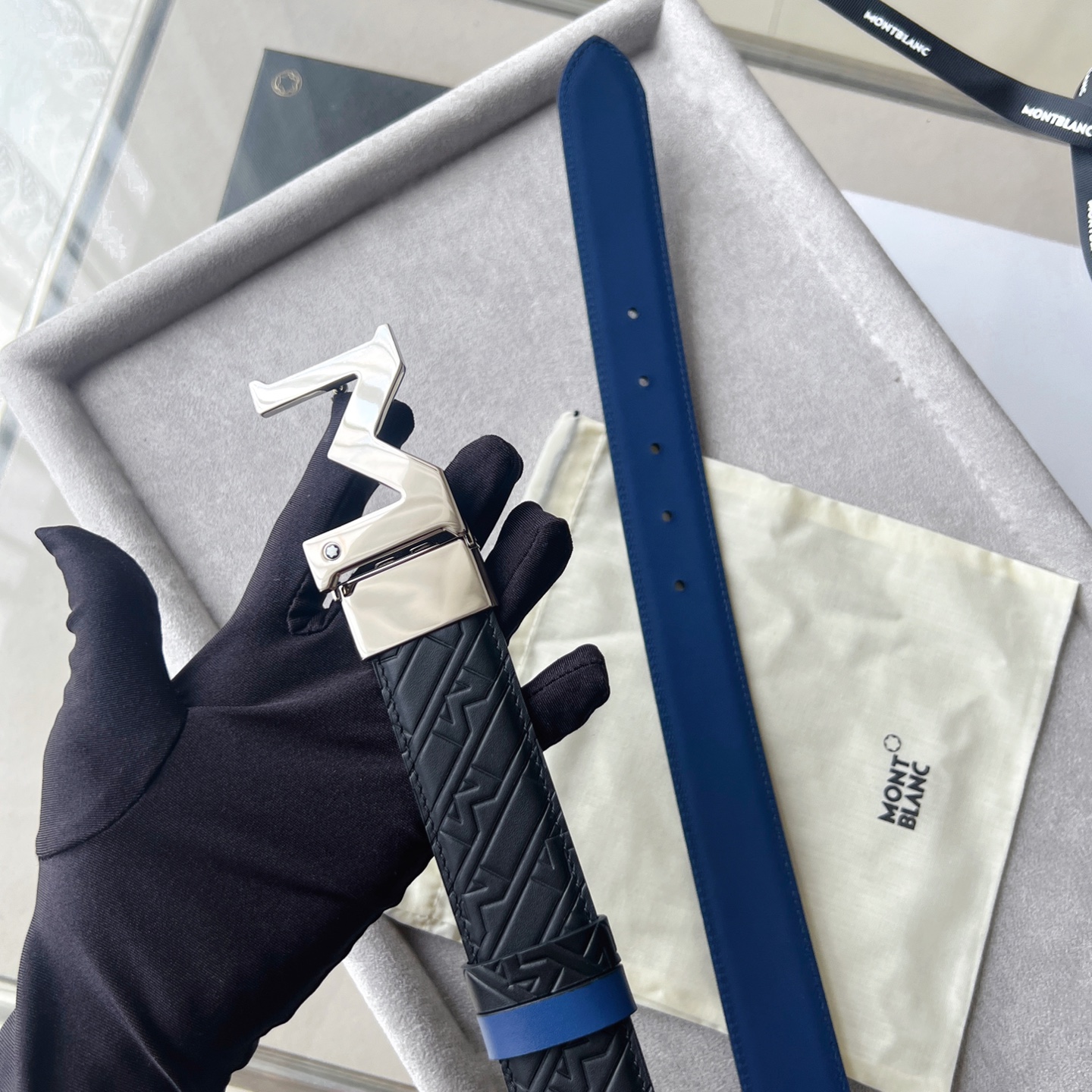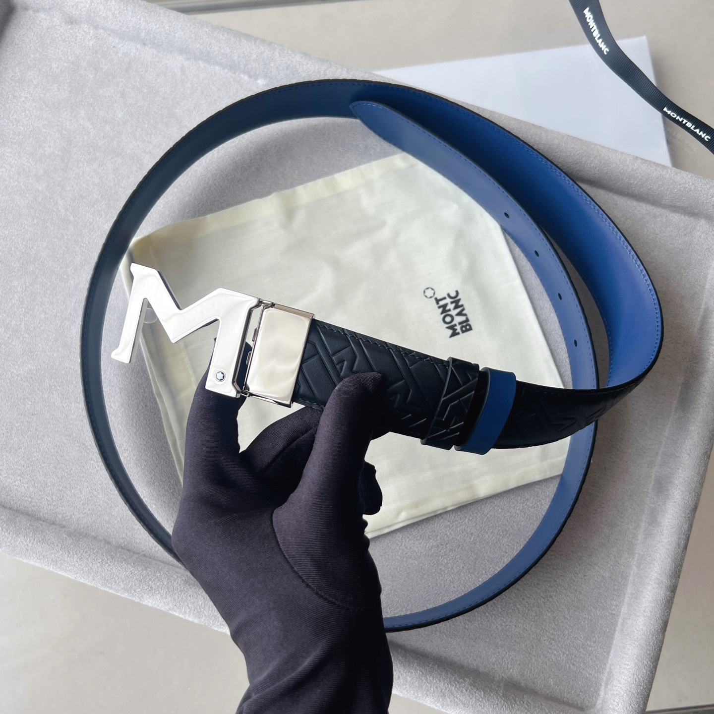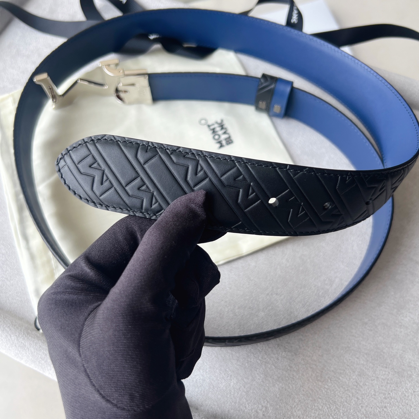Palladium-plated "M" pattern buckle. Adjustable length, 3.5 cm x 120 cm, double-sided black grained and black glossy belt for a sporty look.